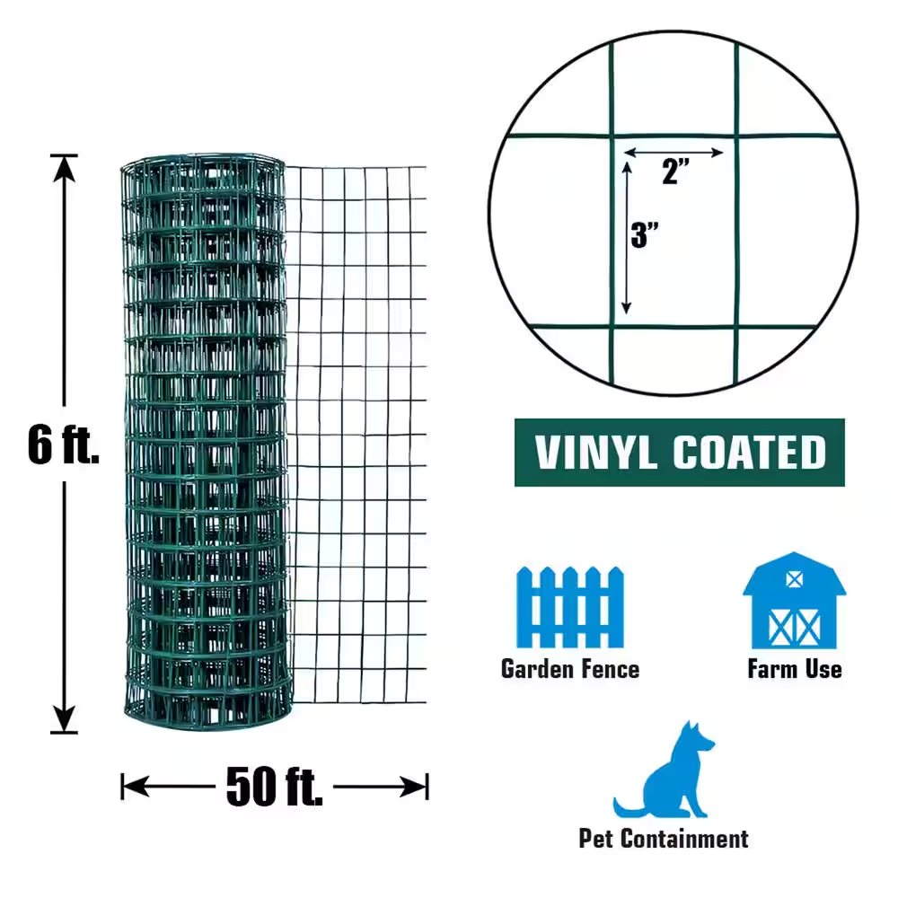 Used for garden security, barrier reinforcement, and more Sturdy welded mesh design efficiently inhibits damage High-quality PVC coating ensures long-term use Fencer Wire 16-Gauge Green Vinyl Coated Welded Wire Mesh, 2 in. x 3 in. Grid Hardware Cloth for Home and Garden, Great for Home Improvement and Home Guard Project. Size and Length. Sturdy Construction., 2 in. x 3 in. Opening Mesh Weave. Flexible Design for Easy Use and Satisfaction Guarantees.