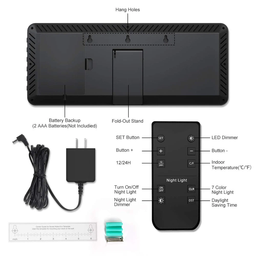 γπ₯ππ π’π§π ππ’π‘π§π₯π’ππππ ππ²-ππ‘ππ πππππ§ππ πͺπππ πππ’ππγ With a superbly clear LED screen and 4.5" jumbo digit, allowing you easy to read from a distance. In addition to the time. The date, day of week, and temperature is also clearly displayed. It is perfect for large spaces, such as gyms, shops, warehouses, garages, or classrooms, offices, as well as your living room, kitchen! More practical features and high quality than other products, affordable price. γππππ¨π¦π§ππππ ππ₯ππππ§π‘ππ¦π¦ πππ¦π£πππ¬γ Featuring a 5-level adjustable brightness display( included full dark), you can easily set the screen to your favorite brightness by using the remote control. The lower brightness levels make it the perfect clock for your bedroom without bothering your sleep. γππ‘πππ¨πππ¦ πππ¬, πππ§π, π§ππ π£ππ₯ππ§π¨π₯π ππ‘π ππ¨π§π’ ππ¦π§γIf displaying the date and day wasnβt enough, the clock also indicates the indoor temperature, both in Fahrenheit and Celsius(β/β)! Keep an eye on the indoor temperature and remind the elderly, children, wife or husband to keep warm. It is so sweet! γπ³ ππ’ππ’π₯ π‘ππππ§πππππ§ πͺππ§π πππ π ππ₯γ The 7 color night-light makes the clock versatile for numerous environments. Choose the nightlight color that best suits your decor or preference to create a great atmosphere. Along with the 4-level brightness control. You can adjust brightness as you desire or turn it off. γππ’π‘π©ππ‘πππ‘π§ πͺπππ π π’π¨π‘π§ ππ‘π ππ’ππ-π’π¨π§ π¦π§ππ‘πγ The clock features 3 equally spaced keyholes for easy mounting on a wall. A foldable stand is also present at γπ’π¨π§πππ§ π£π’πͺππ₯ππ π’π‘ππ¬ & π ππ π’π₯π¬ ππ¨π‘ππ§ππ’π‘ γ While it is a plug-in clock, the 2* AAA battery backup (not included) help you save time and settings. You do not have to reset the settings when reconnecting after a power outage. The screen goes blank during battery backup. γπͺπππ§ π¬π’π¨ πππ§γLarge Digital Wall Clock, remote control, power adapter(9.18ft), center guide for screw holes template, 3 screws, user manual.
