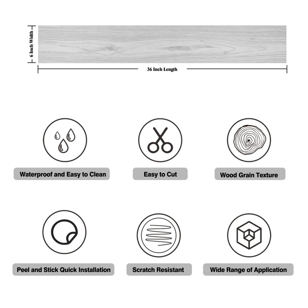 Rich Wood Visuals with a fine lustrous finish make the realistic wood-finish vinyl planks indistinguishable from real wood flooring! Our realistic wood look vinyl is easy to install as a DIY project: simply peel off the paper backing and stick to a flat and dry surface. For durability, the flooring is waterproof, scratch, stain, and dent resistant. Perfect for high-traffic areas, including kitchens, bathrooms, and basements. Dimensions ➡ Wood vinyl plank flooring measures 6 inches width x 36 inches length and 0.63mm thick. Each box contains 16 floor tiles, covering 23.3 sq. ft. Strong adhesion vinyl floor tiles, durable and anti-stress Grey Wood Grain Texture ➡ Natural wood visuals with a low gloss matte textured finish that adds warmth and beauty to your space. This wood vinyl flooring made of high quality vinyl material, scratch resistant, wear resistant, perfect for renters or homeowners Waterproof & Self Adhesive ➡ Peel and stick floor tile wood vinyl planks is waterproof, oil-proof, removable, easy to clean, easy to maintain, flexibility. Self adhesive floor tiles, simple DIY peel and stick installation, just peel off the paper backing and stick to a flat and dry surface, no messy glue or adhesives needed Application ➡ You can enjoy the look and feel of hardwood in any room of the house with this wood vinyl plank, such as bathroom, kitchen, bedroom, laundry room, living room, dinning room, mudroom, basement, garage, farmhouse, office, hotel, renter house, RV, furniture, desk, table, floor, walls, laminate flooring, stairs and so on Warm Tips ➡ Wood flooring also can be installed over most existing surfaces including ceramic tile, wood, concrete, terrazzo and vinyl. For aesthetic consistency it is recommended that you purchase sufficient wood vinyl plank at once