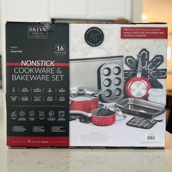 NEW Sale Brooklyn 16 piece NONSTICK COOKWARE & BAKEWARE SET deals From preparing a delicious dinner to creating a yummy dessert, and everything in between, this Brooklyn Steel Co. set includes the cookware and baking essentials you need. Nonstick coatings make the task even easier. Set includes: • 8" fry pan • 1.5-gt. saucepan with lid • 5-gt. Dutch oven with lid • 8" × 8" pot holder • 15" cookie sheet • 9" × 13" cake pan • 6-cup muffin tin • Three felt cookware protectors • 17-oz. snap container • 28-oz. snap container • Multi-layer nonstick coatings • Forged aluminum • Aluminum; protectors: felt; containers: polypropylene