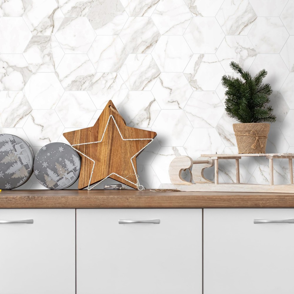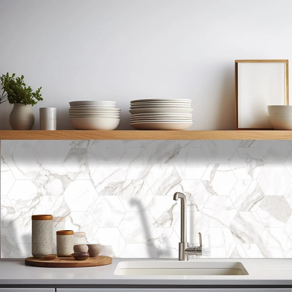 Size & Package: Each pack includes 16 hexagonal tiles (9.06" x 7.87" each),covering about 5.94sq.ft. Mix and match patterns or extend your design with multiple packs for a personalized kitchen backsplash, bathroom accent wall, or fireplace surround. We always recommend taking 5~10% more for installation losses concern. SPC Realistic Marble Texture: Crafted from SPC with a rigid core, these hexagon tiles combine durability and elegance. Ultra-HD 3D printing mimics natural marble veins, while the textured surface resists scratches and stains for long-lasting beauty. Easy Peel & Stick Installation: Self-adhesive backing allows quick installation without grout or glue—perfect for small areas! For large projects, use heavy-duty cutter or chop saw to split tiles along pre-scored lines. (Note: Professional tools recommended for precise cuts). Premium Features: Waterproof, oil-proof and heat resistant make it super fit for kitchen. Can be used behind the stove. Stronger backing glue and thicker version make it better than ordinary vinyl tile sticker, more durable than plastic self-adhesive tiles. Versatile Use - Our hexagon mosaic tiles are perfect for numerous applications. Ideal for kitchen, bathroom and laundry room. Their versatility extends to RVs, making them a top choice for homeowner and DIY enthusiasts.