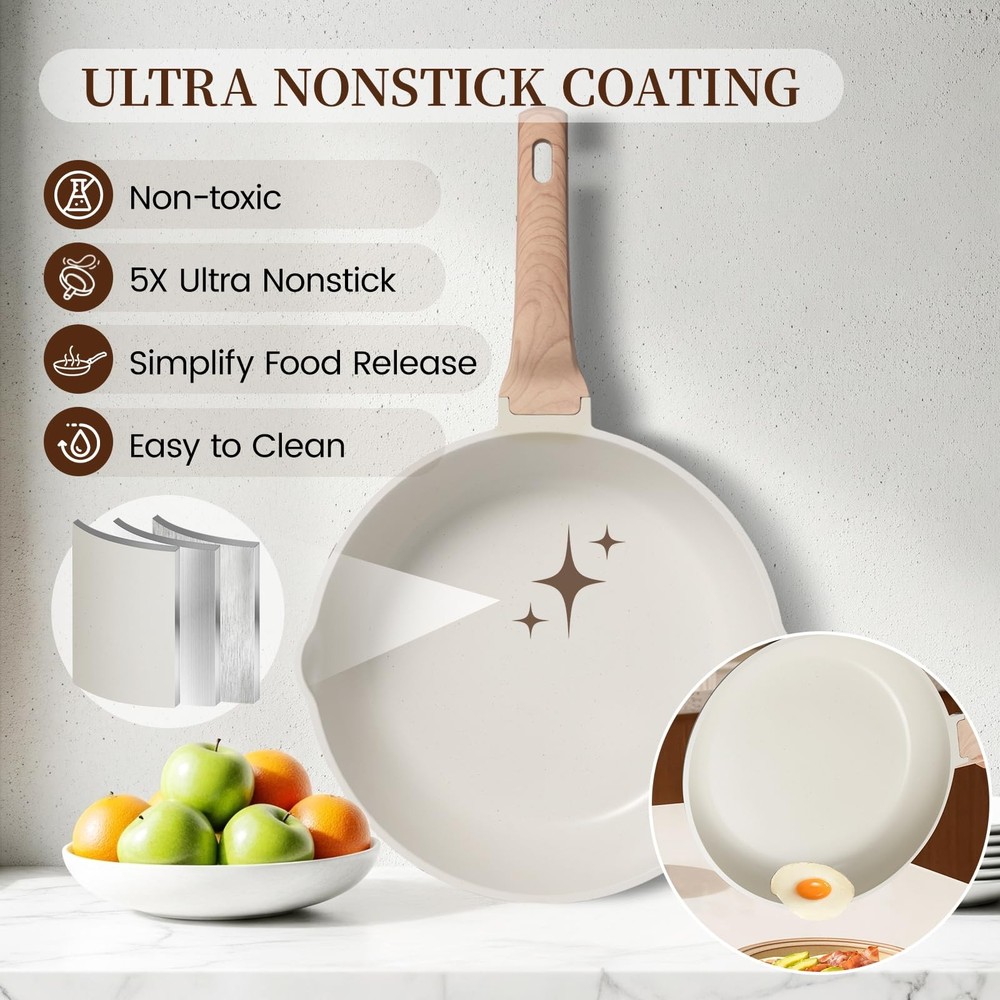 pots and pans set non stick ceramic cookware set 【16-PIECE POTS AND PANS SET】Included 7"(2QT)Saucepan, 9.5"Casserole Pot, 11" Frying Pan, 11" Saute Pan, 9.5" Grill Pan, 3pcs Tempered Glass Lid, 4pcs Utensils Set. Whether you want to slow cook milk, sauté vegetables, or grill steaks to perfection, one cookware set will meet your every cooking need 【PREMIUM NON-STICK COATING】Cooks with less oil and easily removes from the pan, whether you're pan-frying skin-on fish or scrambling eggs. The advanced non-stick coating makes cleaning a breeze, just wipe or rinse off residue. Ideal for cooking healthy, low-fat meals 【COMPATIBLE WITH ALL STOVES】Our non stick pots and pan set are suitable for gas, induction, ceramic, or electric stoves, and compatible with any type of stove. Tempered glass lids lock in moisture and allow you to monitor your cooking without releasing heat or steam 【HEAT RESISTANT HANDLES】Ergonomically designed stay-cool bakelite handles provide a safe and comfortable grip. You can confidently move the pan from the stovetop to the table without worrying about burns 【DURABLE ALUMINUM CORE】Made with a premium aluminum body, it distributes heat quickly and evenly, reducing hot spots. Whether you're sautéing, braising or stir-frying, you'll enjoy precise temperature control that ensures the perfect dish every time 【TRUSTED QUALITY】Your satisfaction is our top priority. If you have any questions about your cookware set or encounter any issues, please don’t hesitate to contact us. We offer 24-hour prompt customer support. Cook with confidence—we’re here to help every step of the way