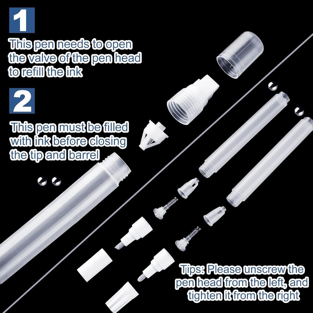 About this item Kind Reminder: if you want to add whiteboard water or ink to the refillable markers, please press the tip lightly, otherwise the ink will be ejected from the pen tube without backflow due to the valve; When you want to add acrylic ink, paint ink and powder type ink, these powder particles need to reach nanometer standard, because our pen tip hole needs powder particles of more than 800 mesh to write, otherwise the ink will flow out from both sides of the pen tip Sufficient Quantity: the package contains 16 pieces of empty paint pens in 3 types, including 6 pieces of round head paint pens in approx. 3 mm/ 0.12 inch, 6 pieces of tilted head paint pens in approx. 6 mm/ 0.24 inch, and 4 pieces of flat head paint pens in approx. 15 mm/ 0.59 inch, together with 3 ml plastic dropper, sufficient quantity and various sizes, meeting your daily use and replacement needs, thoughtful combination brings more convenience to your drawing experience How to Use: the refillable paint pens are easy to operate and use, the white tube is convenient for you to know the dosage, easy to fill the color, just remove the nib area of the pen, put the steel bead into the pen tube, fill with paint or ink, then screw the nib back, you can start writing; Be careful not to pull out the refill, it may affect the use Wide Application in Daily Life: the fillable ink pen is suitable for filling different paints or inks, you can fill empty tubes with different colors you like, including acrylic, oil, watercolor, ink and more, suitable for home, school, painting class and other, practical tool for students and painters Reliable Material: the empty paint marker is mainly made of PP tube and polyester tip, with steel bead inside, to provide you with smooth writing, let you use it with confidence, the steel bead avoids the solidification of watercolor or paint, please pay attention to put the steel bead into the pen, for a better user experience; Tips: please unscrew the pen head from the left, and tighten it from the right