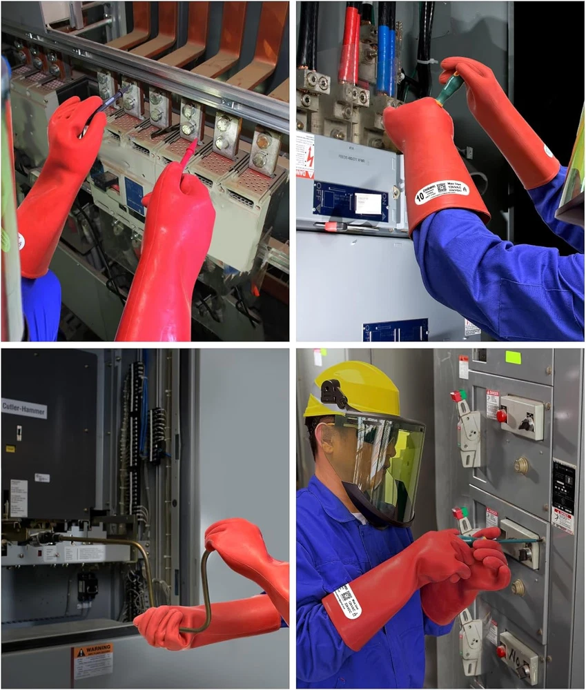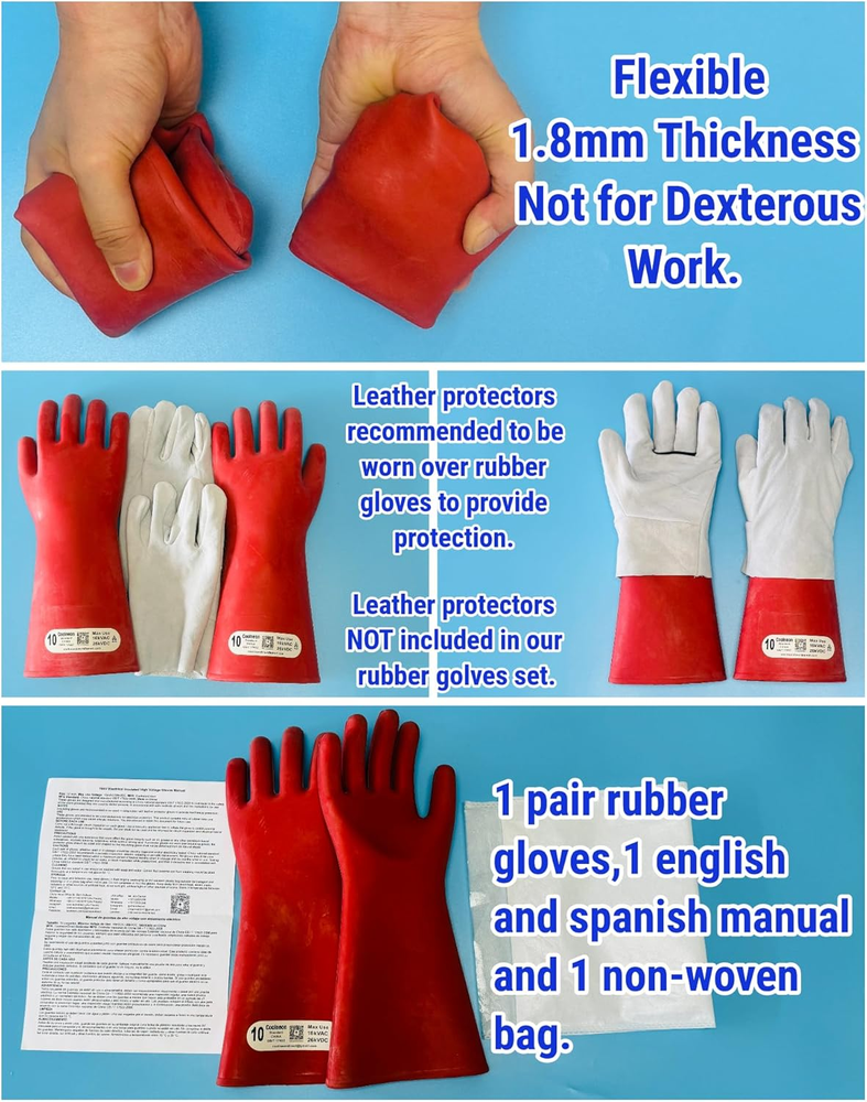 Product Description Flexible, thick, Not for dexterous work. Leather protectors which not included in our gloves recommended to be worn over rubber gloves for protection. Gloves Used for Lichtenberg Wood Burn Output 15kVAC 40mA Designed and manufactured according to China national standard GB/T 17622-2008. Each pair of gloves, whether used or in storage should be visually inspected and/or electrically tested. China national standard recommends a periodic inspection, electric retesting or periodic replacement. No gloves should be used unless they have been tested within a maximum period of 12 months when in storage and 6 months when in use. Testing includes air inflation to check for air leaks, a visual inspection while pressurized, and then a dielectric test in accordance with GB/T 17622-2008. If the glove is thought to be unsafe, the pair shall not be used, then electrical test or destroyed. Avoid contact with any substance that could affect the glove integrity. Gloves that are soiled in use should be washed with soap and water. Gloves that become wet from washing should be dried thoroughly at a temperature not above 65 °C. Do not compress or fold the gloves. Keep away from direct heat, radiators or other sources of artificial heat, direct sunlight, artificial light or other sources of ozone. Store in temperatures between 10°C and 35°C. This product contains natural rubber latex which may cause allergic reactions. Insulating gloves are recommended to be used in conjunction with leather protector gloves to provide mechanical protection on its natural shape. What are in the package: 1 Pair(1 right + 1 left) rubber electrical insulated gloves and 1 English and Spain Manual.(Leather protectors are not included in our gloves.) Colour: Red, Materials: Rubber, Thickness: 1.8mm Product Weight: 16.1oz Package Weight: 17oz Individual Glove Size: XLarge, 15x6.7x2.4 inch Package Size: 15.1x6.8x2.5 inch Max Use Voltage: 16kVAC/26kVDC Instructions Version: English and Spain First Tested Date: Same as Mfd. date on the instructions. Mfg. Standards: China National Standard GB/T 17622-2008 Used for Bare Hands Size: 10 inch hand circumference (just below the knuckles, not including thumb.)