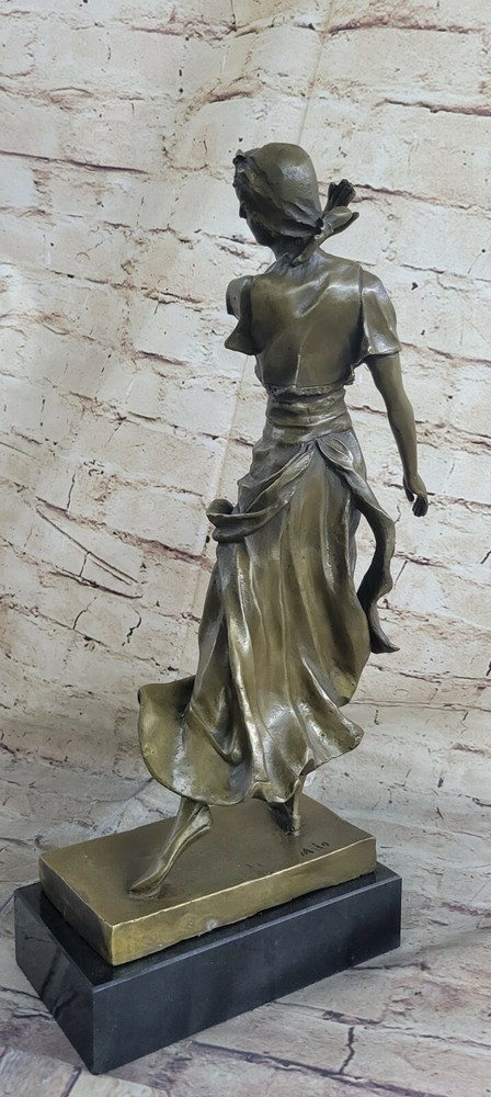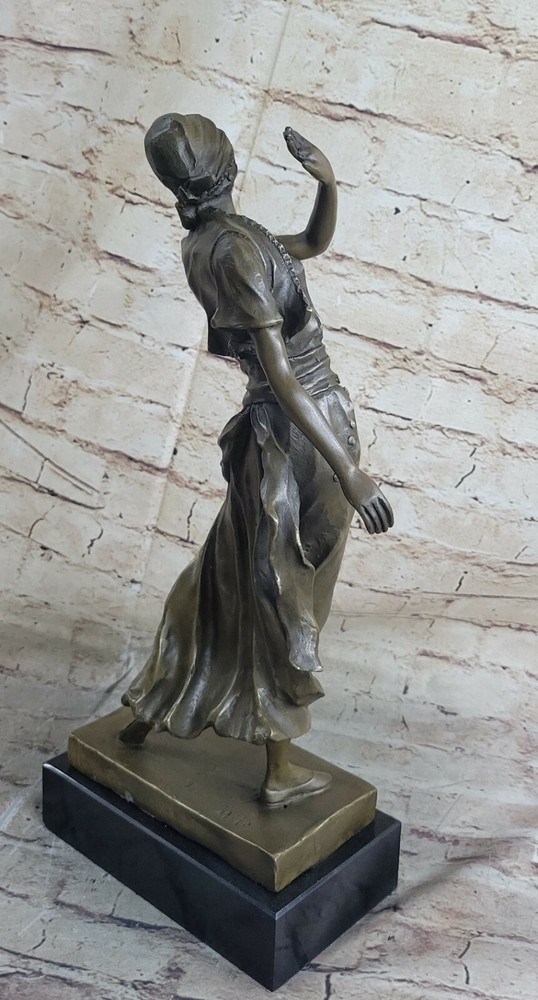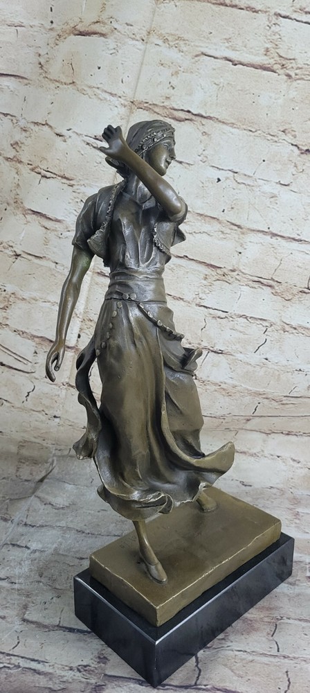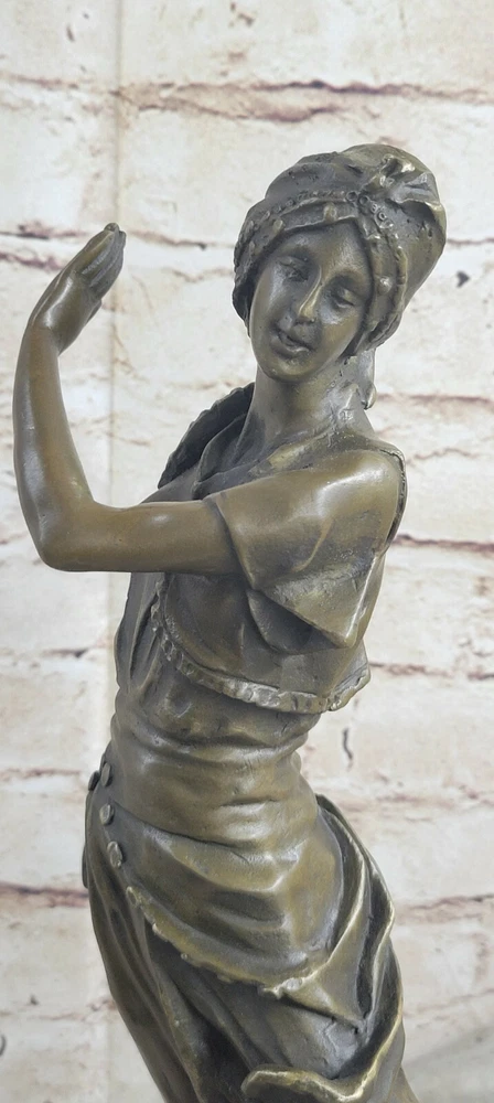 . Condition: This sculpture is in perfect condition.Bronze Dimensions with Marble Base: Height 17"" x Width 8""Marble Dimensions: 8"" X 5"".Height without base: 14""Weight : 15 LBSInventory 54-X21475745 This beautiful sculpture of a Indian lady dancing is amazing in details from her dress to her face. She wears this long one piece short sleeve dress, with a beautiful gold vest and belt that comes with dangles. Her flats are also gold and her hat is a one of kind wrap. She dances to the music and for her audience, as she sways her hips and arms side to side her long dress flows right with her. This sculpture was cast using the ancient ""Lost Wax Method"" and is has two tone to it, brown and gold patina. Mounted atop a green marble base and signed by the artist A.Gory.