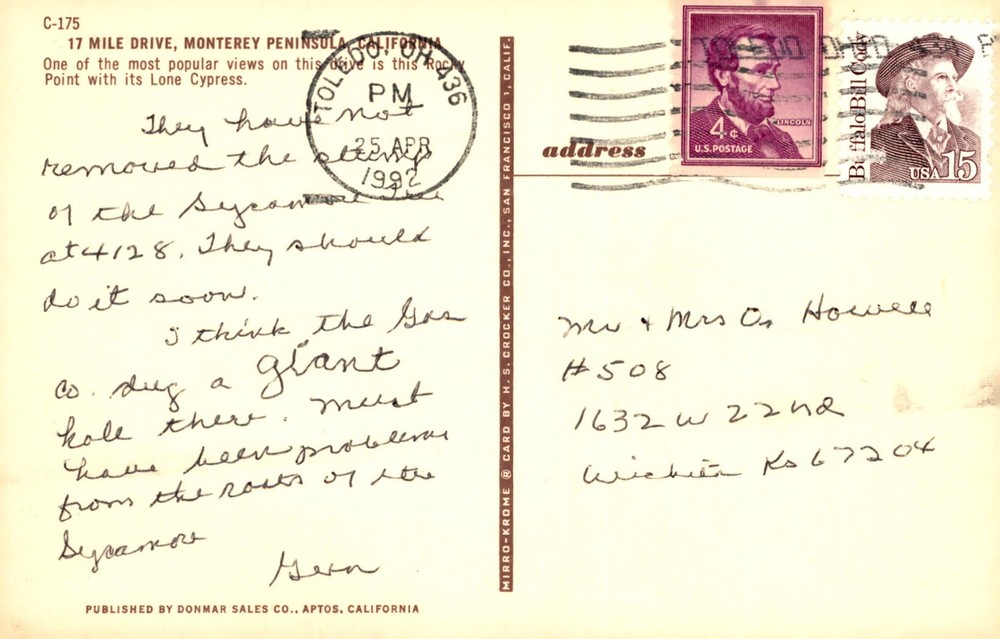 The postcard shows a popular view of the Lone Cypress at Rock Point along the 17 Mile Drive in Monterey Peninsula, California. The sender mentions concerns about a hole near the Sycamore tree and the need for its removal due to potential problems.