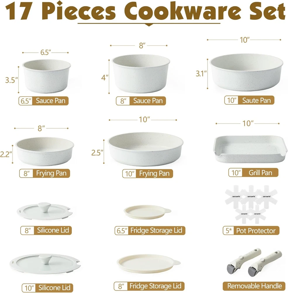 17-Piece Cookware Set Includes - 1.5QT Sauce Pan, 2.8QT Sauce Pan, 8 inch Frying Pan, 10 inch Frying Pan, 10 inch(4QT) Saute Pan, 10 inch Grill Pan, Removable Handle*2, 8 inch Glass Lid, 10 inch Glass Lid, Pot Protector*5, Fridge Storage Lid*2 Easy Storage - Save up to 70% more space with stackable pots and pans set and detachable handles, allowing for storage in cabinets or RVs. Unique Removable Handle - Supports up to 22 pounds, the handle is professionally tested, fit for removable handle set pots and pans, no need to worry about wobbly handles. Granite Non-Stick Coating - Granite nonstick coating, lead, cadmiun, PFOA free, smokeless, safe and healthy. Cooking with little oil for healthy diet. Dishwasher Safe - Cleaning is a breeze. Professional wear-resistant design for the bottom of the pan set that prevents black residue even when used in the dishwasher. Suitable For All Stoves - Heat up quickly and evenly with thick and flat bottom, high magnetic conductive base allows the cookware set to work on all cooktops, including induction cooktop. Excellent Pan Design - lightweight and sturdy. Vertical pan walls allow for a larger bottom area, resulting in greater capacity. Flat bottom keeps oil from spreading. Product Description The video showcases the product in use. The video guides you through product setup. The video compares multiple products. The video shows the product being unpacked. The stackable design saves up to 70% of space and can be easily stored in cabinets, RVs, travel trailer and the removable handles provide good flexibility, allowing you to easily move cookware from oven to table, fridge to stovetop. Put the Kitchen in Your Pocket Enjoy cooking with just one click One-click design: Easy to use, just one-click Space saving tech: Save 70% of space for easy storage One handle for multiple uses: Allow you to easily move cookware from oven to table, fridge to stovetop Non-stick Pans and Pots Silky Smooth Nonstick Lightweight design: You can use any pan with one hand to easily flip food, making cooking easier Excellent non-stick performance: Nonstick coating enables easy food release day after day without sticking Advanced Pan Bottom Coating Technology Refuse to stain your kitchen! Cleaning is a breeze: Whether you wash by hand or in the dishwasher, the bottom of the pan will not leave black residue. keeping the kitchen clean at all times Professional Removable Handle Sturdy & Long-Lasting Supports up to 22 pounds Vertical pan walls allow for a larger bottom area, resulting in greater capacity Oven Safe Oven safe to 480 ℉: Remove the detachable handle for perfect use in the oven. All Stoves Compatible Rapid & Even Heat Transfer: High magnetic conductive stainless steel base allows pans to work on all cooktops, including induction. The core of the pan is made of cast aluminium, which is durable and heats up quickly and evenly. Multi-purpose Cookware Satisfy your different cooking needs: The removable handles provide good flexibility, allowing you to easily move cookware from oven to table, fridge to stovetop. Sensarte Detachable Handle Cookware Set Add to Cart Add to Cart Add to Cart Add to Cart Add to Cart Add to Cart Customer Reviews 4.5 out of 5 stars 1,667 4.5 out of 5 stars 97 4.7 out of 5 stars 15 4.4 out of 5 stars 129 4.4 out of 5 stars 129 4.5 out of 5 stars 1,667 4.5 out of 5 stars 1,667 Price $99.99 $ 99 . 99 $59.99 $ 59 . 99 $129.99 $ 129 . 99 $139.99 $ 139 . 99 $139.99 $ 139 . 99 — $109.99 $ 109 . 99 Material Granite Nonstick Granite Nonstick Granite Nonstick Granite Nonstick Granite Nonstick Ceramic Nonstick Ceramic Nonstick Oven Safe ✔ ✔ ✔ ✔ ✔ ✔ ✔ Dishwasher Safe ✔ ✔ ✔ ✔ ✔ ✔ ✔ Bakeware ✔ ✔ ✔ ✔ ✔ ✔ ✔ Suitable For All Stoves ✔ ✔ ✔ ✔ ✔ ✔ ✔