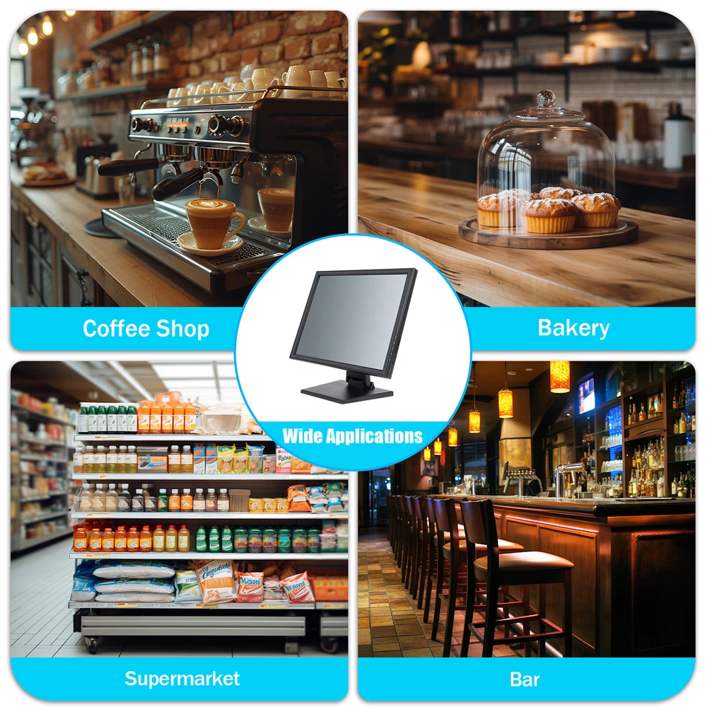 17" Touchscreen Monitor LCD Display VESA Standard Hole Pattern 4:3 Standard LED Description Are you still using an old button-operated cash register, feeling a headache due to its blurry small screen and complex button operations? Let our LCD touch screen monitor take you into a more advanced and technological world! The 17-inch touchable screen allows you to engage in various cash and sales activities like using a mobile phone, bringing you an unparalleled convenient experience. It will be the secret to making your store more efficient, a tool to improve your work efficiency, and a helper that every store should have! Key Features Sensitive Touch: The sensitive touch screen can recognize the handwriting pen, fingers, fingers with gloves, etc., and can recognize multiple types of touch, which is ideal for adapting to the operating habits of different people. Strong Compatibility: Its multiple ports at the bottom include VGA, DC, and USB, and it is compatible with various versions of Windows and can integrate with various POS machines, clients, or PC systems. Adjustable Angle: The bracket with an adjustable viewing angle can easily tilt from 0 ° to 90 °, with 140 ° vertical and 160 ° horizontal viewing angles respectively, providing you with a multi-dimensional visual experience. Large & Clear Viewing: A 17-inch display provides more operating space for you, and a high resolution of 1280 * 1024 makes the patterns and fonts on the screen easier to read, making it suitable for long-term viewing. Multi-Functional: It not only enables quick organization of basic functions such as ordering and checkout, but also enables various management of the store's offices, organizing various data reports, effectively improving work efficiency and accuracy, and achieving orderly operation of the store. Easy to Clean: The smooth touch screen can be easily wiped clean, and dust or dirt can be removed by gently wiping with a cloth. Low Energy Consumption: The power consumption of this product is only 35W, which can save you more electricity bills. Selected Material: The high-quality environmentally friendly ABS shell is wear-resistant and has high hardness, which can be used in the store for a long time to provide you with convenience and does not require excessive maintenance. Details Ultra Thin Body: The 0.92in ultra-thin shape not only makes its overall appearance more elegant but also occupies a small area, making it very suitable for placing on the front desk of a store. Carefully Designed Base: The large base(6.7/8.46*8in) makes it more stable, and anti-slip pads at the bottom also provide double protection for its stability. The reserved suspension holes also allow for a wider range of installation methods to meet the needs of more stores. Heat Dissipation Hole: The large area of heat dissipation hole at the top can effectively enhance the heat dissipation performance of the product, thereby ensuring the smooth and normal operation of the display screen. Application It is very suitable for placement in coffee shops, bakeries, supermarkets, restaurants, bars, gyms, warehouses, and other places, and can be connected to other devices through various built-in interfaces to improve work efficiency. It can also connect industrial automation equipment, monitoring center equipment, self-service query equipment, and medical equipment. Specifications Material: ABS Color: Black Style: Modern Voltage: DC12V, AC 100-240V Current: 2.6A Power: 35W Aspect Ratio: 4:3 Screen Standard: 43cm/17in Installation Method: Countertop Installation Monitor Type: Touch Screen Monitor Format: 4:3 Standard LCD Maximum Resolution: 1280*1024 Contrast Ratio: 800:1 Brightness: 300cd/㎡ Response Time: 5ms Horizontal Viewing Angle: 160° Vertical Viewing Angle: 140° Base Size: 17(Short)/21.5(Long)*20.5cm/6.7/8.46*8in Screen Size: 38*30.5cm/15*12in Screen Inner Size: 34*27cm/13.38*10.63in Gross Weight: 6.15kg/13.55lbs Net Weight: 4.85kg/10.7lbs Package Size: 47*42*18cm/18.5*16.5*7in Package Included 1 * LCD Touch Screen Monitor 1 * Power Adapter 1 * Power Cord 1 * VGA Cable 1 * USB Cable 1 * Stylus Pen 1 * English Manual 1 * CD Notes Please carefully read the manual and strictly follow the precautions to have a better experience. Please note that this product does not have an HDMI port. Please allow the slight color difference caused by the shooting light and 1-3cm error due to manual measurement, and make sure you do not mind before you order. Payment Delivery details Terms of sales About us Contact us Payment We accept ebay payment 。 Fees such as import duties, taxes are not included in the item price or shipping costs. These charges are the buyer's responsibility. Delivery details Shipping: 2-9 working days to: USA Terms of sales We maintain high standards of excellence and strive for hundred percent customer satisfaction. Feedback is very important to us. We hope that you contact us immediately before you give neutral or negative feedback, so that we can address your concerns. It is impossible to address issues if we do not know about them! About us Your satis faction is our ultimate goal. We work hard to earn your trust and future business. Our certified technicians have tested each item before shipping. The unit comes with 1 year limited warranty on all manufacturing defects. a) If you receive a defective item, you may return it or ask for a discount. Please contact us within 14 days after you receive the package. b) What you returned must be intact and in its original packaging as re? u. Customer is responsible for shipping costs of the returned item. c) We will cover the cost of shipping back t with the shipping rate indicated in the registration page. We will send you a new unit or refund the full payment you paid. Thank you. Contact us Business Hour Business Hour: Monday To Friday: 8:30 AM to 5:00 PM (Beijing China time) Due to time zones, our reply to your questions may not be immediately. But within above working time,