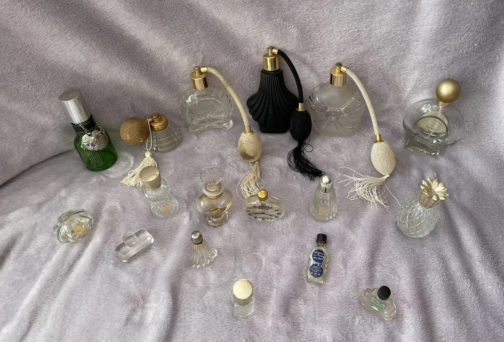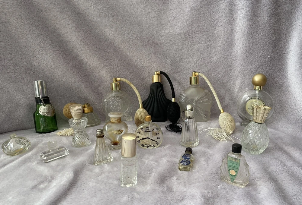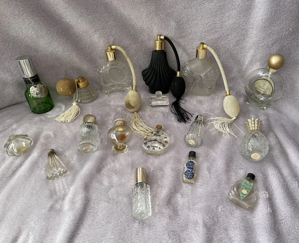 17 old vintage perfume glass bottles, 4 are with atomizer tops, I have not tried to clean them up, but all are in good shape for their age, no chips or cracks.