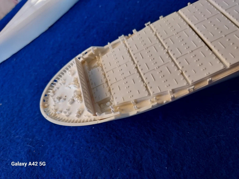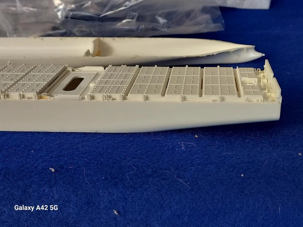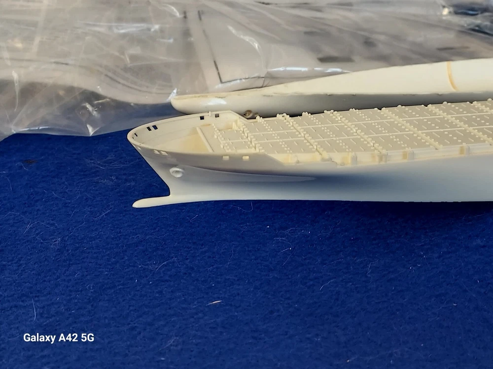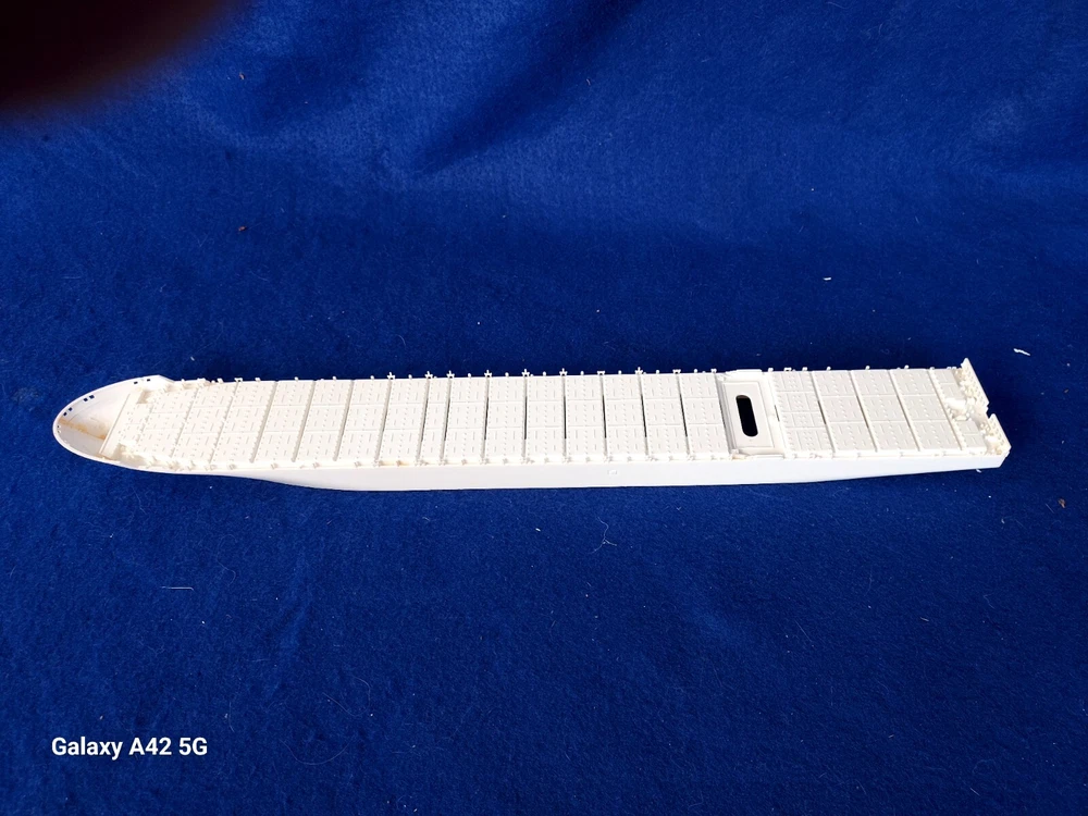 ONE OF A KIND: Revell Germany 05241 1/700 Hapag Lloyd Container Ship COLOMBO EXPRESS I have WATERLINED the hull. SEE PHOTOS The model kit has been started..main deck is attached and internal bulkheads applied;.essentially nothing more than was needed to waterline the ship. The photos don't show clearly; the waterline is straight...no warpage. Some parts have been removed from the sprues and cleaned up; primarily the above-deck Container bulkheads. These and the forcastle are shown installed for the photos only; they were not glued....They have been carefully packaged with the stand and marked. Also the stern boat skids are seen in the upper left of the photo showning the bulkhead directions..they are in that package as well. The model kit is complete, waithing to be finished. I've included decals to letter the ship for EVERGREEN (I was going to paint the hull green and do that but couldn't find alternative 1/700 decals for the containers. HO container decals are about the right size for that. The kit decals are in like-new condition. A fun project to research and start but now a round-tuit for you to finish.The kit will be carefully packed SEE PHOTOS