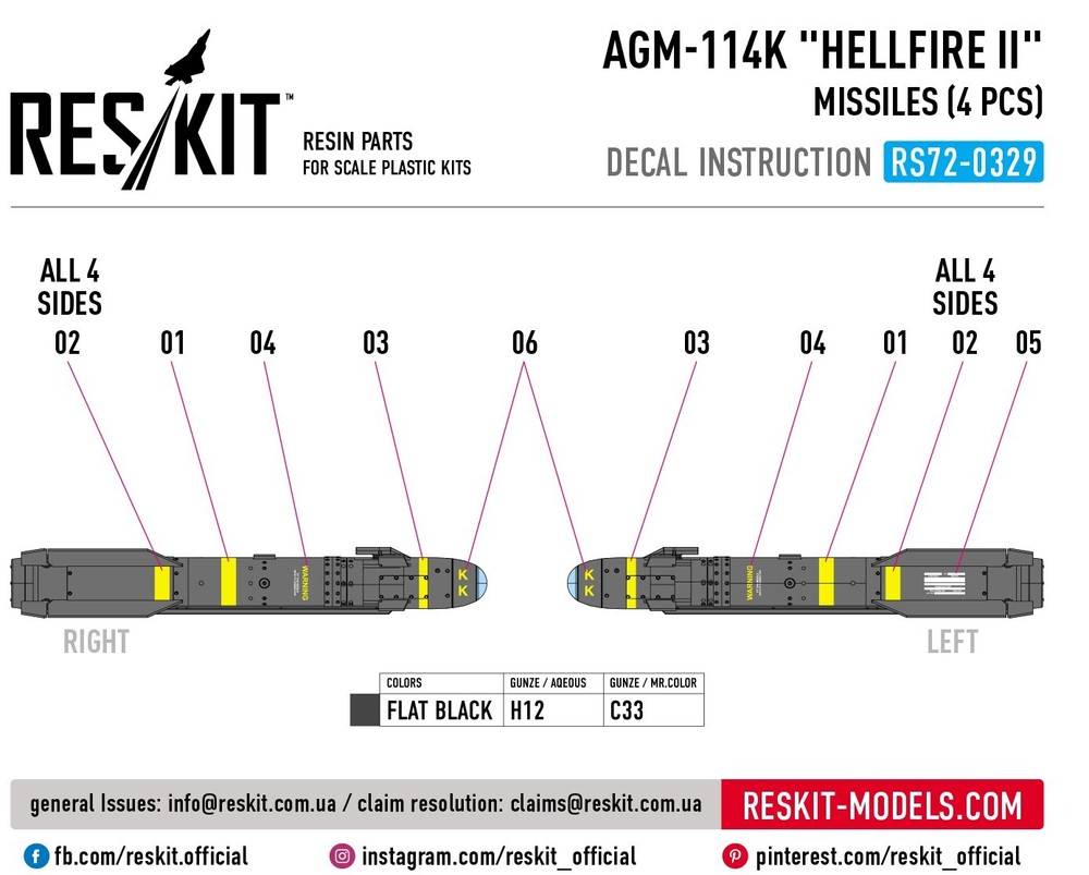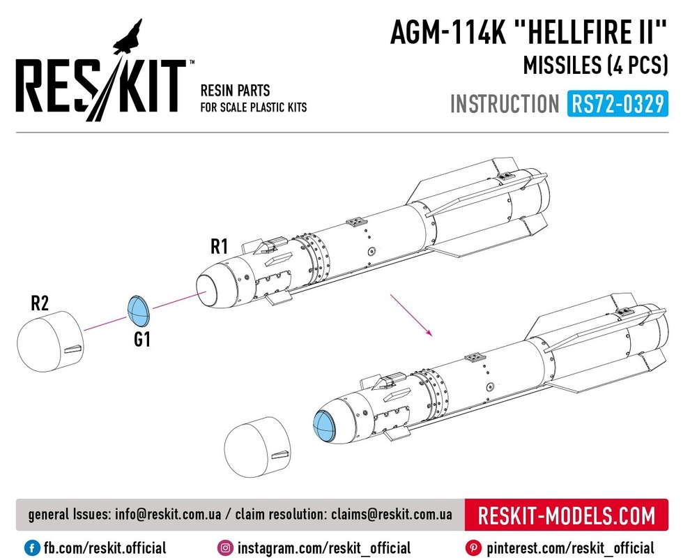 AGM-114K "Hellfire II" missiles (4 pcs) (AH-64, AH-1, UH-60, SH-60, Eurocopter Tiger, OH-58, RAH-66, MQ-1, MQ-9) (3D Printed) Scale 1:72 ResKit RS72-0329 - for Plastic Model Kit Scale: 1/72 Manufacturer: RESKIT (Accessories for Scale Plastic Kits) Country/Region of Manufacture : Ukraine Features: Kit Condition : New in Box Type of equipment : Aircraft, Helicopters Type of product: ARMS AND WEAPONS Recommended kit: Any Category: RESIN & 3D ACCESSORIES For Scale Aircraft Model Kit ---------------------------- If you have a desire to procure a GREATER NUMBER OF ITEMS THAN WHAT IS CURRENTLY DISPLAYED, kindly let us know, and we will happily modify our offerings to suit YOUR EXACT QUANTITY NEEDS. ---------------------------- >>> Visit our eBay store! <<< You will find everything you need at great prices. Reskit: The Ultimate Upgrade for Your Scale Models Reskit is the leading provider of upgrade sets for scale models, offering a wide range of products to enhance the realism and detail of your models. Our sets include everything from engines and interiors to exterior accessories and weapons. Whether you're a beginner or a seasoned modeler, Reskit has the upgrade sets you need to take your models to the next level. Here are just a few of the benefits of using Reskit upgrade sets: Increased realism and detail: Our sets are made with high-quality materials and components that will add a touch of authenticity to your models. Improved performance: Our sets can help improve the performance of your models, making them more realistic and engaging. Reskit upgrade sets are the perfect way to add realism, detail, and performance to your scale models. With our wide range of products, you can find the perfect upgrade set to transform your models into showpieces.