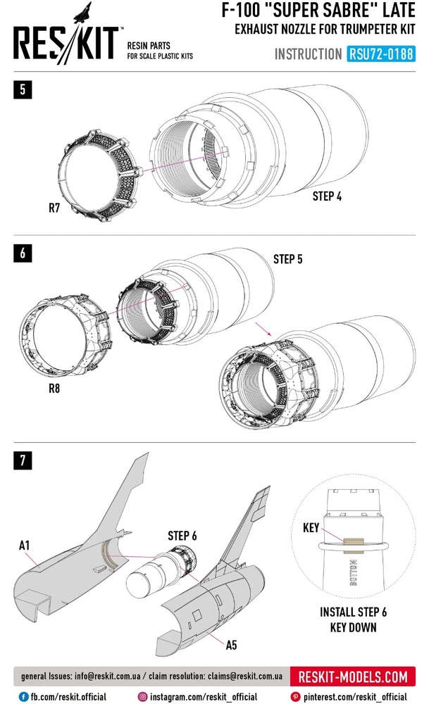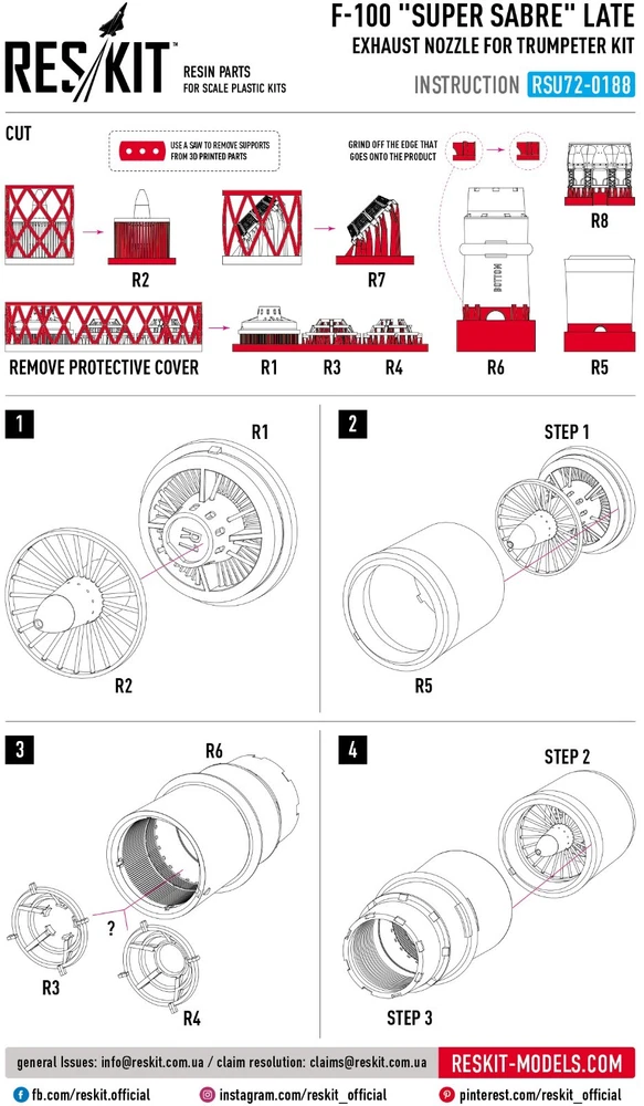 Scale: 1:72 Manufacturer: RESKIT Country/Region of Manufacture: Ukraine High-quality details. Paint: Unpainted, Unassembled, Kit do not contain paints and glue. Condition: New in Box Features: Kit F-100 "SUPER SABRE" LATE EXHAUST NOZZLE FOR TRUMPETER KIT (1/72) RESKIT - Accessories for Scale Plastic Kits SPECIFICATION Scale: 1/72 Type of product: Exhaust nozzles Recommended kit: Trumpeter Suitable for models: F-100 SUPER SABRE, F100, F 100, F-100, SUPER SABRE Resin exhaust nozzles set Quality set, simple assembly. Suitable for experienced modelers, as well as for beginners. Due to the use of modern production technologies, all the details of the model fit perfectly, thanks to this, you can get an excellent result with minimal effort. ----------- This is a plastic model kit. Assembly and painting is required. Paint and glue is NOT included. Item Type: Scale model kit Commodity Attribute: Assembly The model is a plastic assembly model and needs to be assembled and painted by yourself You need an extra purchase of the glue, paint and so on!