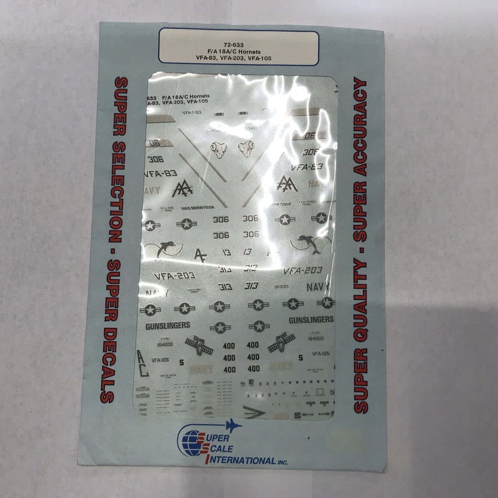 1/72 Super Scale International #72-633 F-A 18 Hornets VFA-83, 203, & 105 LHH.// Open package, great condition. All parts are present. // We do combine shipping on multiple orders for the continental United States only. We use the Global Shipping Program for everything else, and are unable to combine shipping on auctions shipping outside the USA, unfortunately. If you live outside of the continental United States and would like combined shipping, you must contact us prior to your purchase to discuss your options. We will make every effort to combine shipping but are constrained by the rules of the Global Shipping Program.