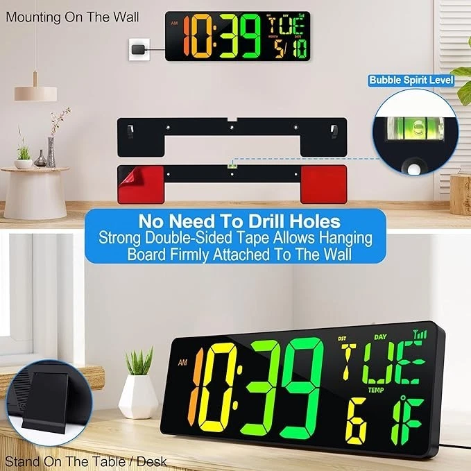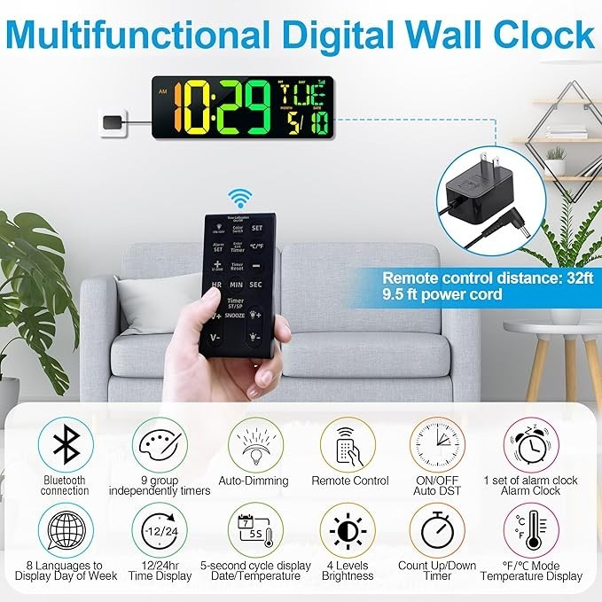 1. Bluetooth Automatic Time Sync : 17.2'' large digital wall clock with Bluetooth 5.3 technology, not need manual time-setting, this shop clock can one key to sync phone time, automatic calibration time 4 times per day, enjoy convenience and precision 2. 11 Color Modes: Digital wall clock large display with: 6 single colors, 3 RGB flowing gradient colors, 2 changing Colors; 4-speed manual or automatic brightness adjustment, customizable your own color according to your preferences and environment 3. Multiple Functions and Convenient to Use: This LED wall clock can press mode button or use the Remote Control to operate, operated from up to 32 ft, have 9.5ft long power cord; very suitable for Gym Home Garage Office Classroom and lobby 4. 9 Groups Timers and Easy to Hang: Timer groups T1-T8, timing range: 0:00:00-29:59:59, T9 timing max up to 40 days; No need to drill holes, won't damage your wall, complimentary double sided tape allows hanging board firmly attached to the wall 5. Outlet Powered with Memory Battery: Our large wall clock is outlet powered, memory battery only use for saves the system settings and keeps the time running when outlet power failure, clock can works without memory battery 6. Hourly Chime: Press"Alarm Set" for 2 seconds into Chime set and then press "+" or "-" to select chime ringtone, and then press"SET" to choose the chime mode, MOD 1 (default mode) : Not chime, MOD 2: Hourly chime, MOD 3: Chime only from 6:00 to 21:00 7. Reassured After Sales Service: If this digital wall clock breaks or damaged in shipping, or any problems you encounter in using, please feel free to contact us(how to: click on your order--contact seller), we will solve them in 24 hours
