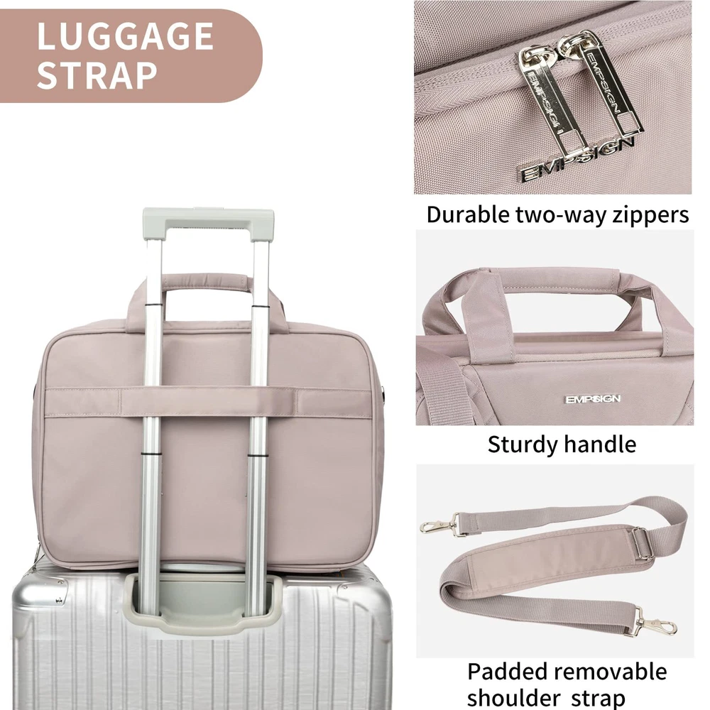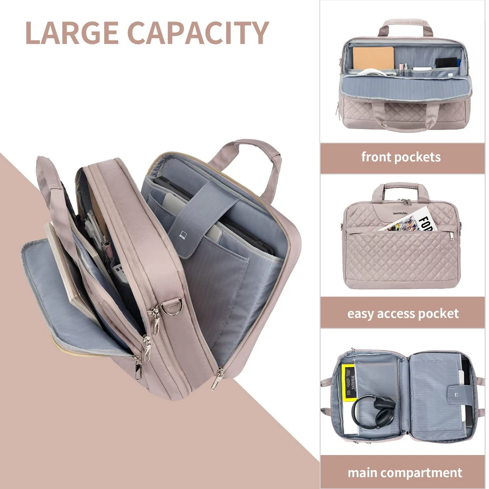 DURABLE & WATER REPELLENT: Made of durable waterproof nylon fabric that guarantees special long-term use. Waterproof fabric can protect your accessories from accidental damage. Fits perfectly underneath the airplane seat. Dimensions: 17"x12.5"x6.5" ; Weight: 1.98 lbs; MULTIPLE COMPARTMENTS: laptop briefcase has a large capacity with three compartments for almost all your daily needs, plus an extended zipper that provides more space to handle more carrying needs. The padded laptop compartment provides perfect protection for your 17" laptop from the bumps and bruises of travel. A large main compartment can hold books, files, mouse, chargers, and other office supplies. A front compartment provides easy access to badges, keys, cell phones and more. EASY TO CARRY: Adjustable "C" curve padded foam padded shoulder straps provide stability and even distribution of pressure. Sturdy handles ensure comfortable carrying for extended periods of time. Features a trolley strap that allows the bag to slide over rolling luggage, making business travel easier and more convenient. RFID POCKET: Inserting an electronic card into the RFID blocking pocket can stop theft and electronic pickpocketing and keep your information safe inside your briefcase. MULTI-PURPOSE: laptop bag is suitable for commuting, business trips, impromptu trips and road trips. Featuring a pink and quilted look, it can be a great gift for family, friends, partners and spouses if she is looking for a practical, high quality, professional business briefcase.
