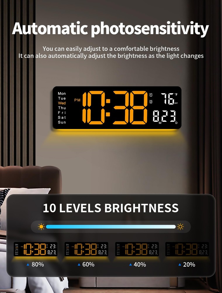 This digital wall clock is a game-changer! The huge 17.3" display makes time, date, and temperature super easy to read from across the room—perfect for my elderly parents. I love the customizable RGB night light that adds a cozy glow to our living room at night. The remote control is super handy for adjusting settings without getting up. Installation was a breeze, and the sleek modern design looks great in any room. The auto-dimming feature is brilliant for nighttime viewing. Worth every penny for its combination of style and functionality!