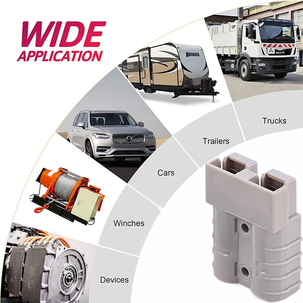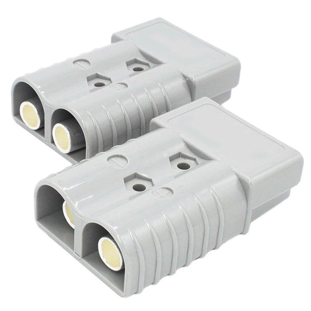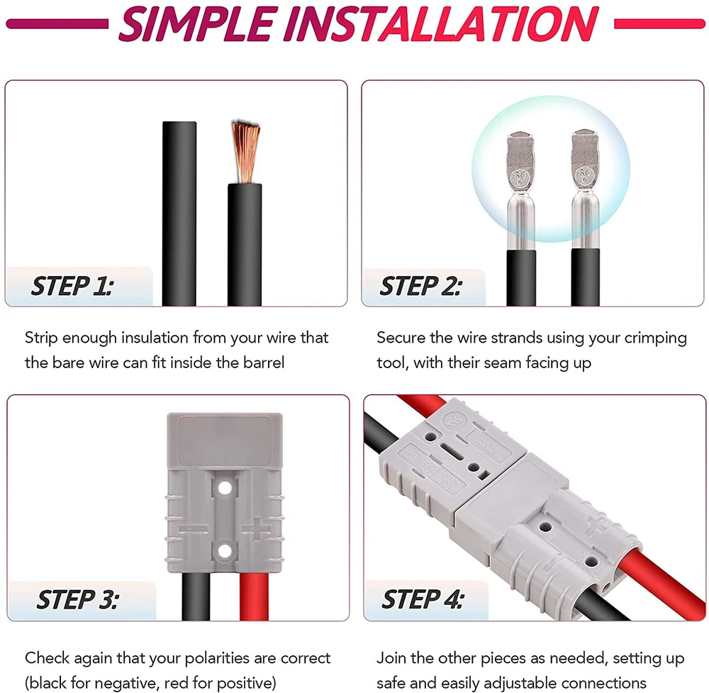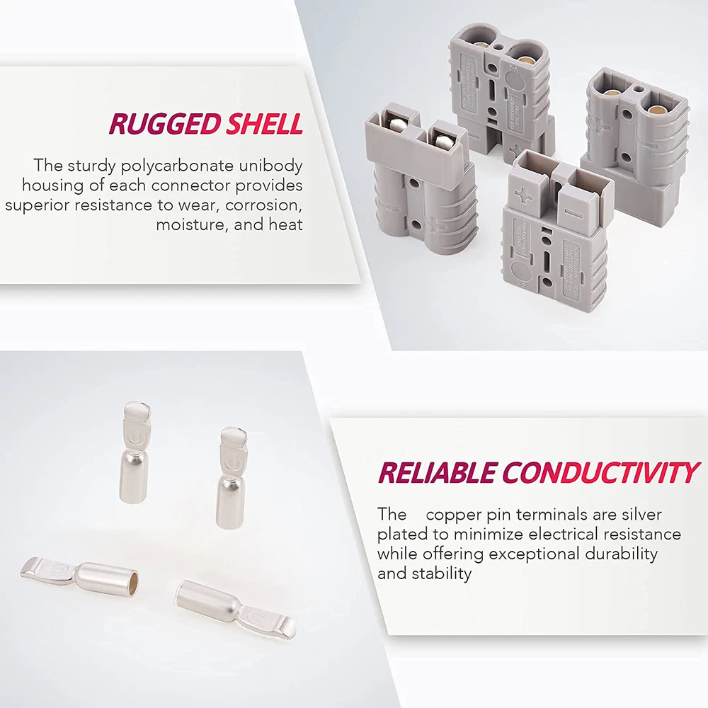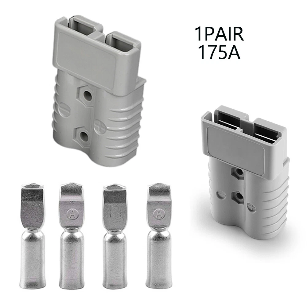 Feature: WIRE CONNECTOR PACK ---This handy electrical wire connection set includes 4 clearly marked quick connect plugs that let you patch and disconnect 4, 2, 1/0 AWG (10-50mm²) wire pathways from 12V, 24V, or 36V batteries, supporting currents up to 175 amps WIDE APPLICATION ---Our versatile weatherproof QC plugs offer a simple, convenient way to handle direct power connections to car batteries; truck, ATV, and RV winches, lifts, and cranes; and trolling and outboard motors on boats and watercraft, as well as home and industrial applications like lathes, chargers, and power inverters BUILT TO LAST ---Each wire harness's unibody polycarbonate housing provides superior resistance to wear, corrosion, water, and heat for its full service life of over 10,000 connections; the 4 copper terminal pins are silver plated to minimize resistance and maximize stability and dependability; and the attached boot caps keep debris out between uses EASY TO USE ---These quick connectors provide built-in texturing and polarity marks for sure grip and easy use; their genderless design attaches & detaches quickly and smoothly; and use is as easy as stripping the ends of your wires, fitting them into the terminals, and securing them with a crimping tool Specification: Material: Polycarbonate, Copper, Silver, Rubber, Steel Max. Current: 175A Rated Voltage: 600V Voltage Range: 12–36V Wire Size Range: 4, 2, 1/0 AWG (10-50mm²) Terminal Pin Width: 0.55 in. Operating Temperature Range: −4 to 221°F Single Plug Dimensions: 3.1 × 2.1 × 1 in. Paired Plug Dimensions: 5.3 × 2.1 × 1 in Package Included: 2 × Quick Connect Plugs 4 × Pin Terminals On Jun 17, 2024 at 03:57:57 PDT, seller added the following information: