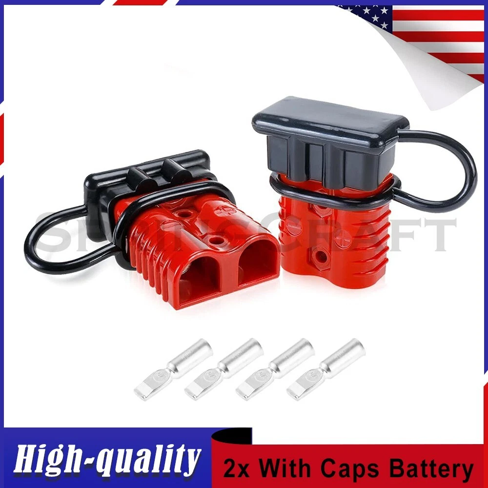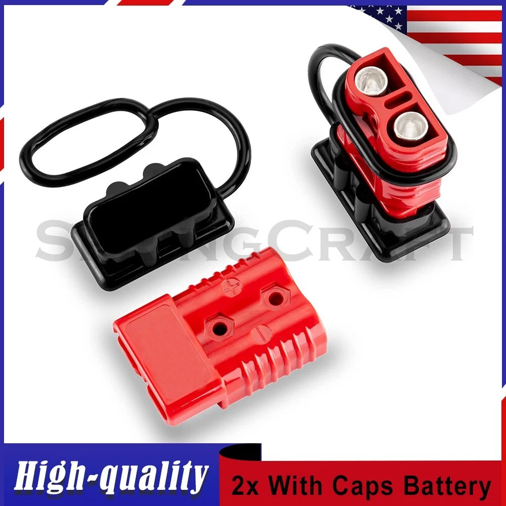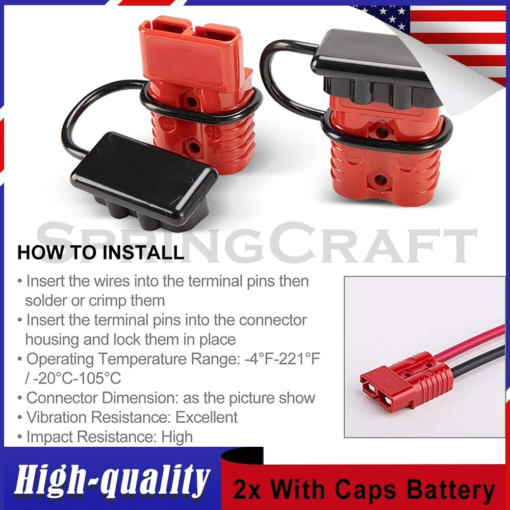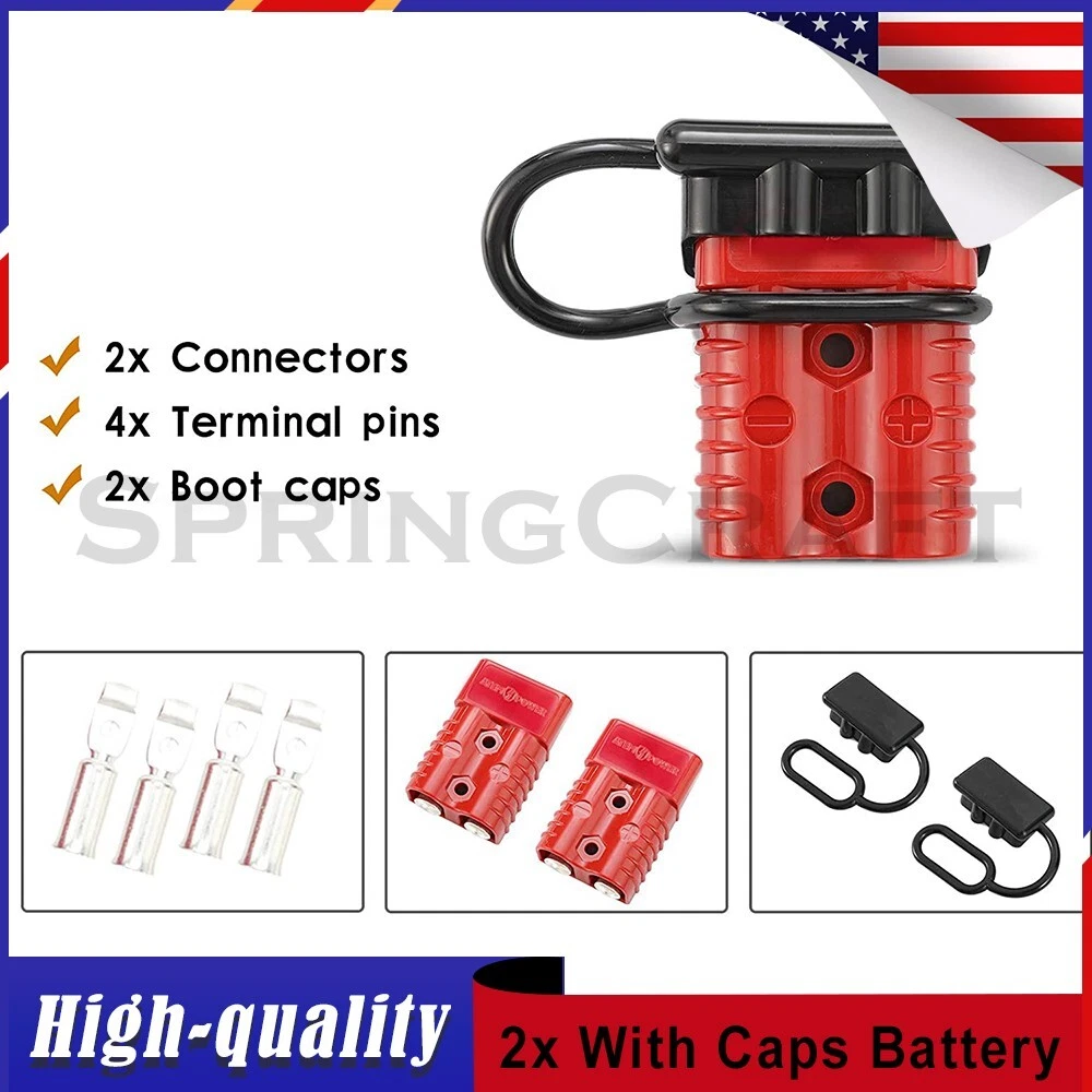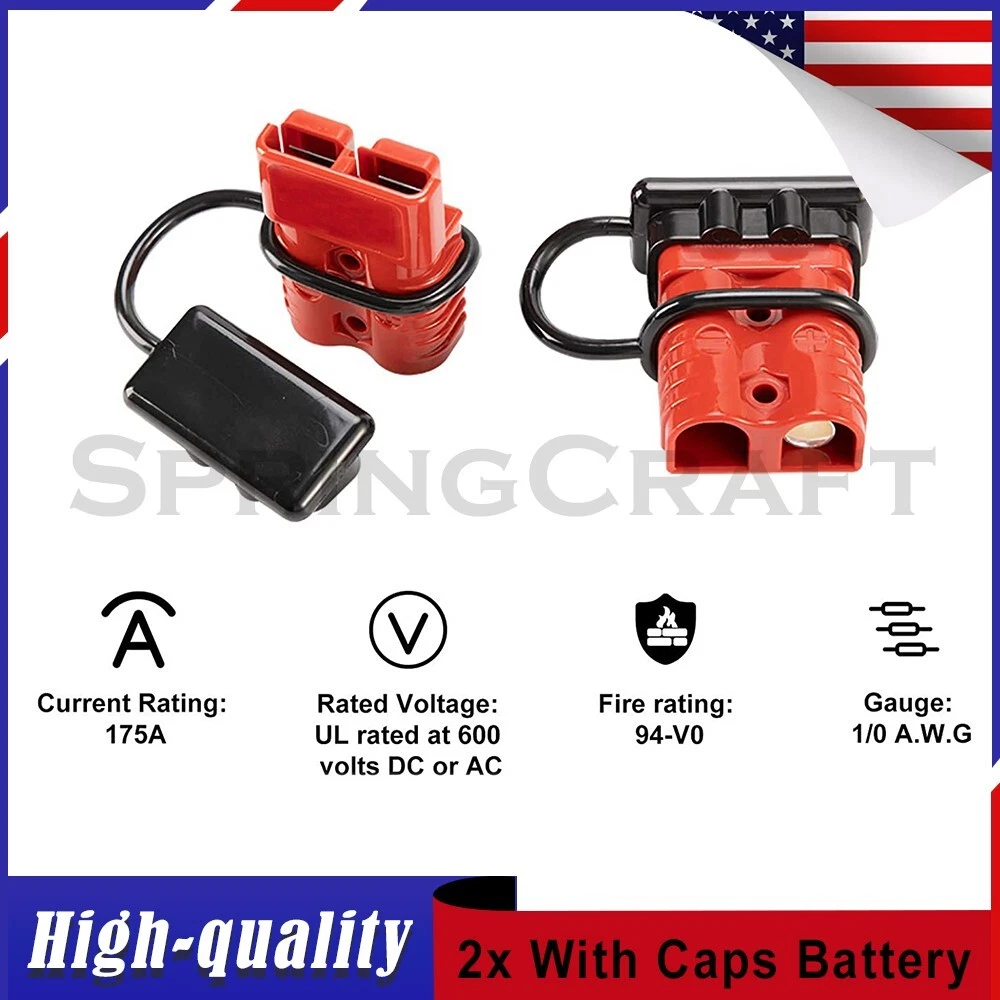Features: WIRE CONNECTOR SET: This handy electrical wire connection set includes 2 clearly marked quick connect plugs that let you patch and disconnect 1/0 AWG (10-50mm²) wire pathways from 12V, 24V, or 36V batteries, supporting currents up to 175 amps WIDE APPLICATION: Our versatile weatherproof QC plugs offer a simple, convenient way to handle direct power connections to car batteries; truck, ATV, and RV winches, lifts, and cranes; and trolling and outboard motors on boats and watercraft, as well as home and industrial applications like lathes, chargers, and power inverters BUILT TO LAST: Each wire harness's unibody polycarbonate housing provides superior resistance to wear, corrosion, water, and heat for its full service life of over 10,000 connections; the 4 copper terminal pins are silver plated to minimize resistance and maximize stability and dependability; and the attached boot caps keep debris out between uses EASY TO USE: These quick connectors provide built-in texturing and polarity marks for sure grip and easy use; their genderless design attaches & detaches quickly and smoothly; and use is as easy as stripping the ends of your wires, fitting them into the terminals, and securing them with a crimping tool Specification: Material: Polycarbonate, Rubber, Copper Max. Current: 175A Voltage: 600V Wire Size Range: 1/0 AWG (10-50mm²) Operating Temperature Range: −4 to 221°F Terminal Pin Diameter: 0.5 in. Connector Dimensions: 3 1/8" x 2 1/8" x 1" (L*W*T) Connected Set Dimensions: 5 1/4" x 2 1/8" x 1" (L*W*T) Package Included : 2x Connector Plugs + 2x Dust Covers + 4x Terminal Pins