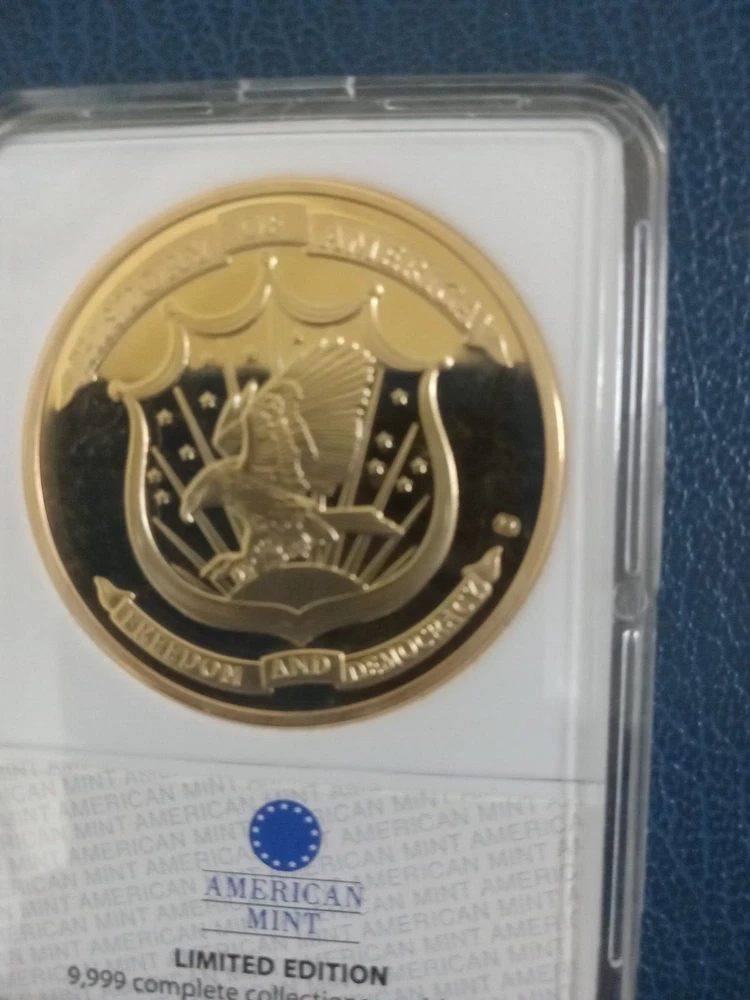 Liberty Bell 1776, Gold Coin Replica. 40 MM round and plated in 24 Carat Gold. Liberty Bell on the front. Eagle within a Crest on the Back. With History of America written on the back. Note Quality Plastic Case. An original would cost a fortune. Just a wonderful mint collectable at a reasonable price.