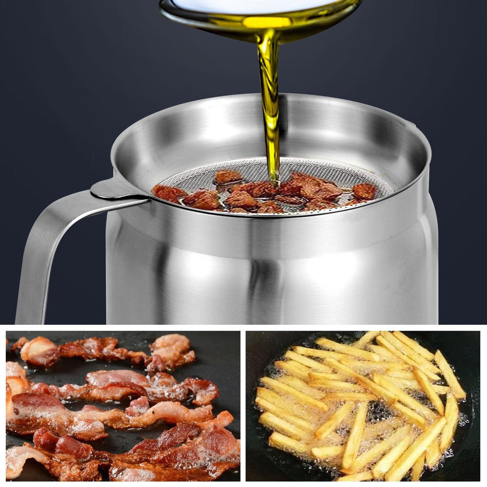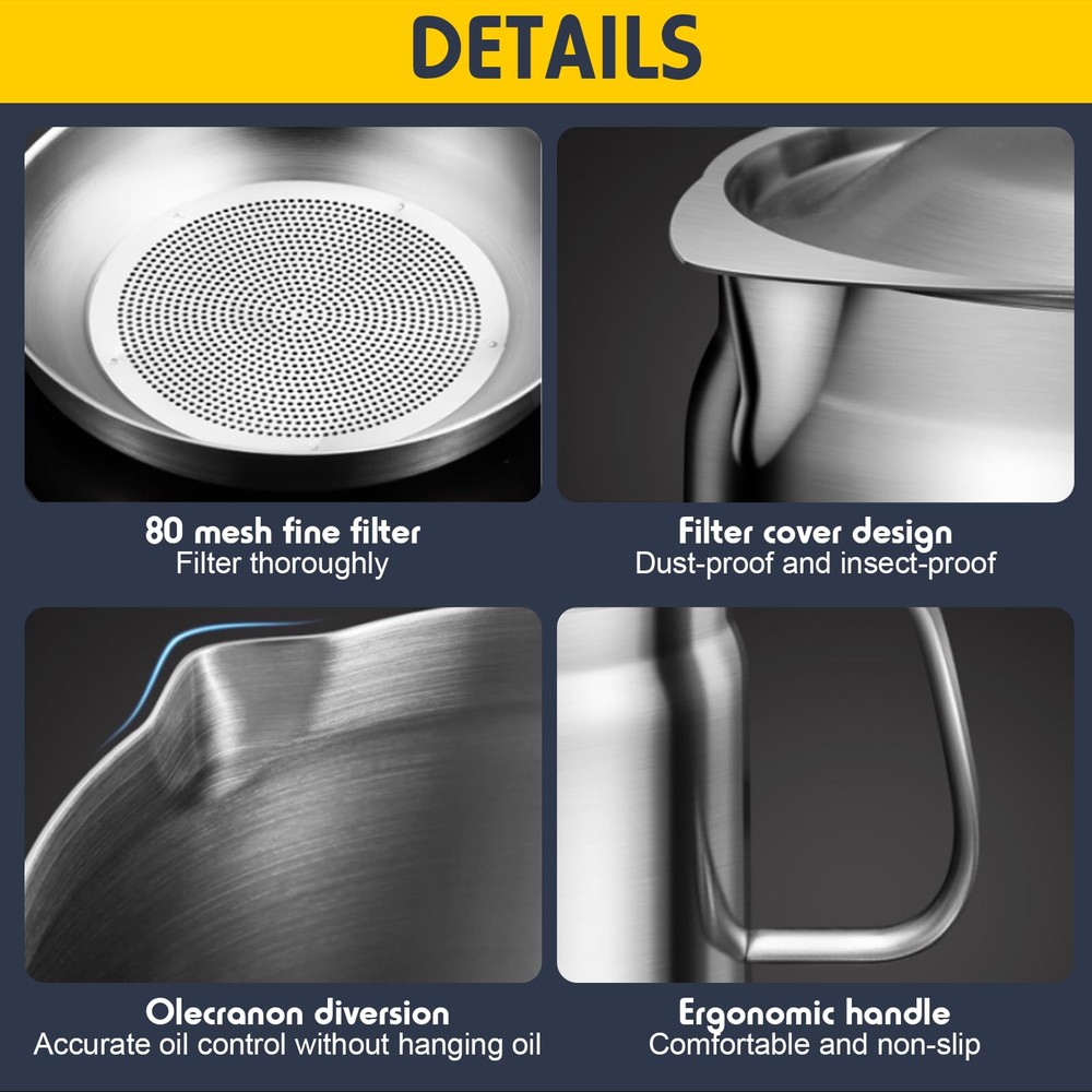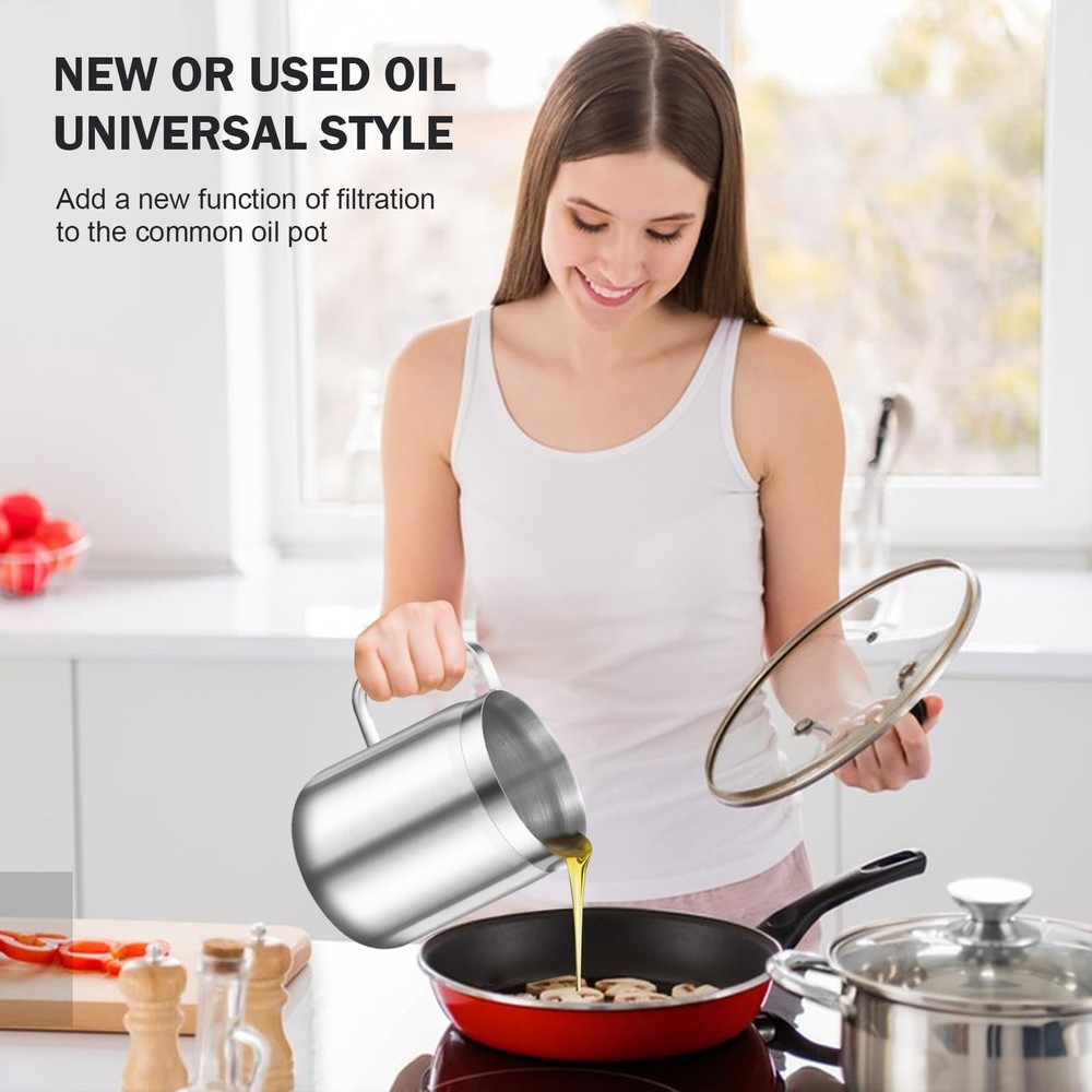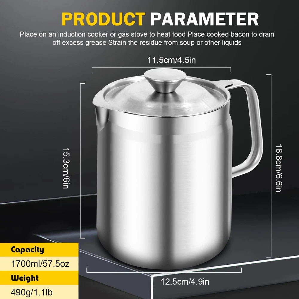 【Extreme Thick】This grease can for kitchen with strainer is extreme thickened style that thicker than most of other brands, sturdy, heavy and durable that even if dropped on the ground but nothing change. The maximum capacity is 1700ml/58oz. 【Rustproof and Fine Mesh】This grease container for kitchen that made of 304 stainless steel material, which will not rust and harmless to the human body completely . It contains 80 fine mesh is which can effectively filter residue in used oil or soup. 【Multi-function】1. it is usually used as cooking oil filter and bacon grease keeper, that worked out effectively to solve the problem of cooking oil disposal. You can make other delicious food with used oil, that help you save more money; 2. You can use it as a cooked bacon keeper to drain off excess grease if you don’t like too greasy breakfast; 3. You can remove the soup dregs from the soup by use it;4. You use it to reheat liquid food whether it's a battery stove or a gas stove. 【Healthy&Convenient】The lid can perfectly cover the oil pot to avoid insects entering. The spout is an eagle spout design that is easy to pour out the used oil cleanly without other spoon. It is comfortable to use the Ergonomic design of the handle . By using our cooking oil containerwill make your house cooking more creative and convenient. 【After sales】 When you encounter any quality problems, you can ask us to replace a new set for you at the first time. strive to give our customers the best and more comfortable online shopping experience.