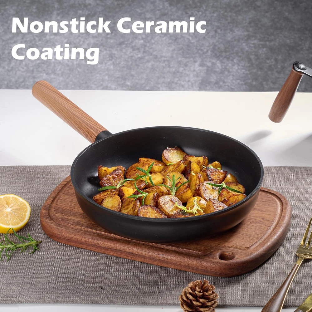 Pots and Pans Set Non Stick 17 Pieces What's included: 17 pieces cookware set, 9.5-inch and 11-inch elevated fry pans, 4.7-quart covered casserole, 4.7-quart covered sauté pan, 1.5-quart and 2.5-quart covered saucepan, 5 pan protectors, 2 silicone utensils. The best option for a family of 3-7 people, meeting all your culinary expectations. Healthy Ceramic Cookware: pots and pans set is made from natural ceramic, which is 100% Cadmium Free, PFOA Free, PFOS Free, and Lead Free. You can enjoy your cooking on cookware safely and easily. Oven-Safe Options: The cookware set can be used in ovens up to 450°F, making it suitable for baking, roasting, and grilling. It is also ideal for gas, electric, and induction stoves. Before placing it in the oven, make sure to remove the handle. Non-Stick Appeal: The pans feature a non-stick coating, which makes cooking and cleaning a breeze. Food slides right off, minimizing the need for excess oil and making post-meal cleanup a snap. Saving Space Design: Neatly stack all the pots and pans, and place the pot protector between each pot to prevent scratches, saving 70% of the space compared to regular pots, and can be easily placed in the cabinet.
