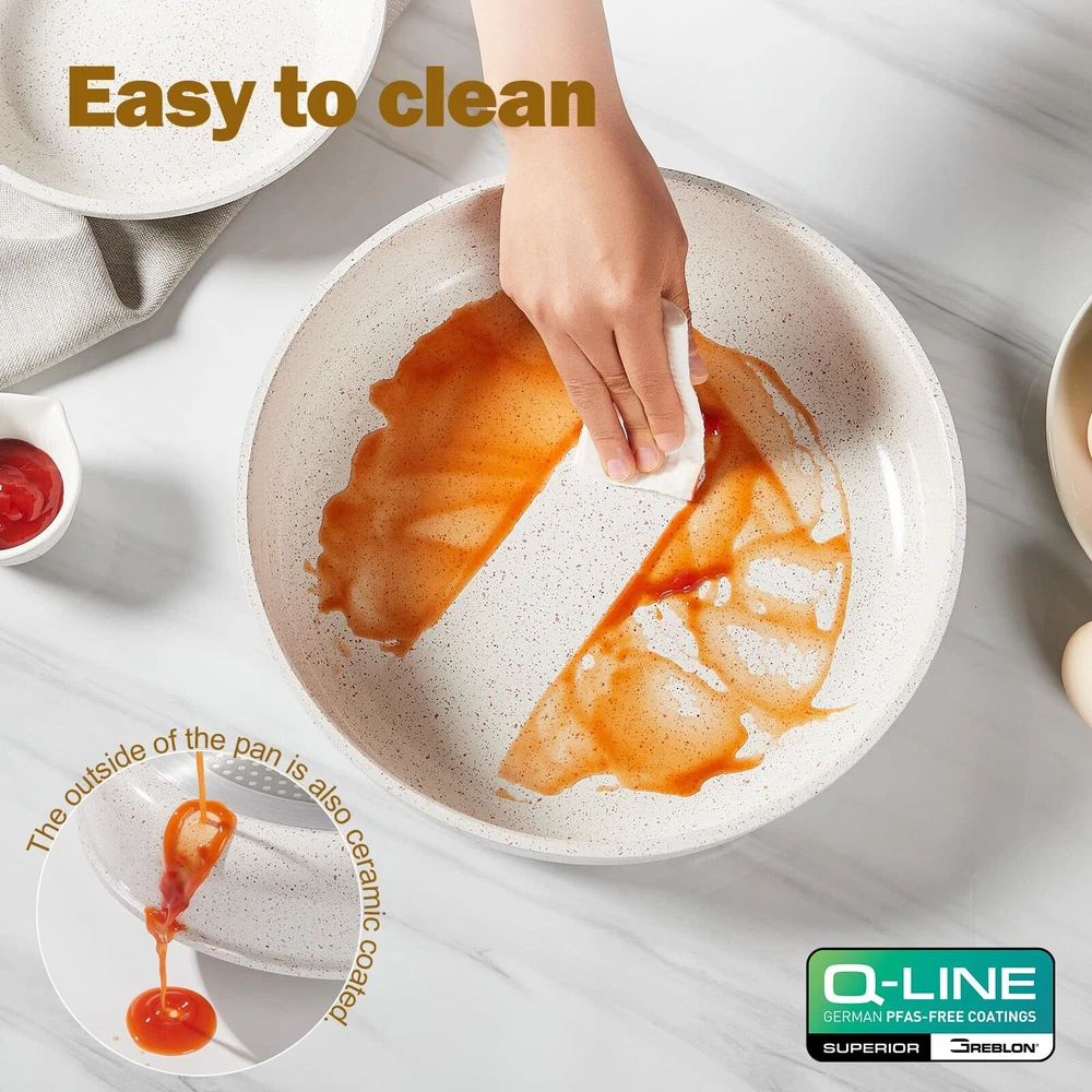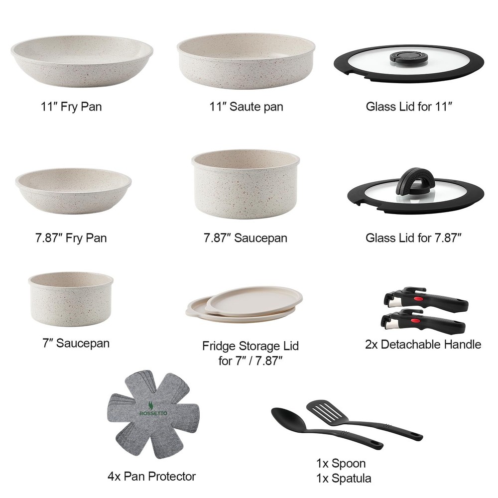 17Pcs Pots and Pans Set Non Stick, Ceramic Cookware Sets with Detachable Handle, Induction RV Kitchen Cookware Set, Stackable Non-stick Set, PFOA and PFAS Free, Oven Safe, White Granite Complete Kitchen Set: Elevate your culinary experience with the 17-piece cookware ensemble. This comprehensive set includes essential pieces like 8" and 11" Frying Pans, an 11" saute pan, and 7" & 8" Sauce Pans. Plus, it comes with convenient extras like 2 Removable Handles, 8" and 11" Glass Lids, 4 Pot Protectors, and 2 Fridge Storage Lids. Seamlessly transition from frying to simmering with this versatile set, designed to meet all your cooking needs German Ceramic Coating: Crafted with top-tier German engineering, these pots and pans set boasts a premium non-stick ceramic coating that is not only non-toxic but also free from harmful chemicals like PFOA/PFAS. Enjoy smokeless cooking and promote healthier eating habits by reducing the need for excess oil. Elevate your cooking experience with this ceramic cookware set, renowned for its superior non-stick feature and designed for both performance and wellness Maximize Your Kitchen Space: Our innovative detachable handles allow for easy stacking of pots and pans, saving valuable kitchen real estate. Say goodbye to cluttered cabinets and hello to streamlined storage in even the smallest kitchens. Optimize up to 75% of your cabinet space, creating a sleek and tidy cooking environment perfect for any home or RV/camping adventure Versatile Compatibility: Engineered with a highly magnetically conductive stainless iron base, this kitchen cookware set is compatible with all hob types, including ovens and induction cooktops. With its cast aluminum core, it ensures efficient and even heat distribution, making it the ideal choice for any culinary endeavor Scratch Resistant: Crafted with German GREBLON ceramic coating, our cookware offers superior scratch resistance compared to traditional non-stick coatings. This means you can confidently use metal utensils without concerns about damaging the surface. Moreover, the ceramic coating extends to the exterior of the pot and pan, ensuring durability and protection inside and out Effortless Clean: Bid farewell to scrubbing sessions thanks to the rivet-free design, making cleanup a breeze. Simply wipe with a sponge and soapy water, and enjoy the convenience of preparing your daily meals with ease. Dishwasher safe for added convenience Ultimate Convenient Accessories: Effortlessly transition from the stove to the table with cookware that seamlessly facilitates cooking and serving in the same pan, all thanks to 's detachable handles. Additionally, each saucepan is accompanied by lids for convenient leftover storage in the fridge. As an added bonus, enjoy the inclusion of 4 pot protectors for enhanced kitchen organization and care 17pcs Pots and Pans set Non Stick from France, Ceramic Cookware Set with Removable Handle, Induction RV Kitchen Cookware Set, Stackable, PFOA and PFAS Free, Oven Safe, White Granite SHIPPING Domestic Buyers - We have confidence in our products, but if you are not fully satisfied please contact us within 30 days of purchase and you will get full refund. - We ship within 3 business days of payment, usually sooner - We offer FREE shipping on all orders! - We only ship to the lower 48 states, no APO/FPO addresses or PO Boxes allowed International buyers – please note: Import duties, taxes, and charges aren't included in the item price or postage cost. These charges are the buyer's responsibility. - Please check with your country's customs office to determine what these additional costs will be prior to bidding or buying. * Order Cancellation Policy ** You can return a product for up to 30 days from the date you purchased it. 1. The seller reserves the right to cancel the special case only due to eBay cancellation fee. 2. The decision of seller is the final. 3. The seller will respond to the cancellation request within 2 business days. Please wait for the result of cancellation. 4. In case the cancellation is not completed by some reasons, the buyer can follow the options below to get the refund. 4.1 The buyer can reject the item when it arrives. 4.2 The buyer can send the item back to the seller within 30 days If the buyer receives item (USA Shipment ONLY). The seller will provide the FREE return label to the buyer when the buyer opens " Return Item" case on eBay by using the reason as "Change my mind" ONLY. 5. When buyer has placed the order. The order will be processed and completed by automatic warehouse system within 5 minutes. In case that buyer sends the cancellation request after 5 minutes of placing the order, the request will be rejected. **Sending direct message to cancel the order is not allowed for every case.* Return Policy For the return case - If buyer would like to return the items for refund or replacement, please CONTACT SELLER to receive the free return label from seller. The refund or replacement will be processed with the tracking number of return label which is provided by seller only. The other ways of return which are not approved by seller will not be processed for the refund or replacement.