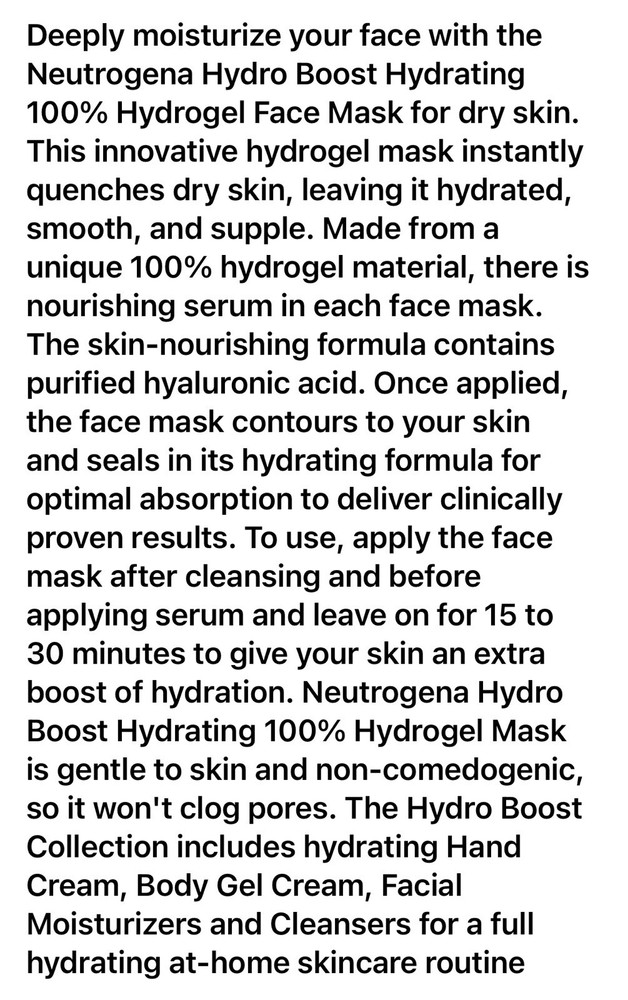 NEW-Never Opened (Lot of 17) Includes: (17) Individually Packaged NEUTROGENA Hydro Boost Hydrating 100% Hydrogel Masks with Hyaluronic Acid (1.0 oz. each). FREE PRIORITY SHIPPING! Please see pics for more details 😁