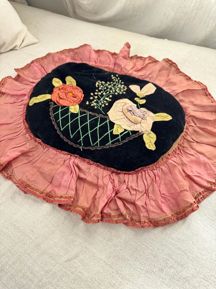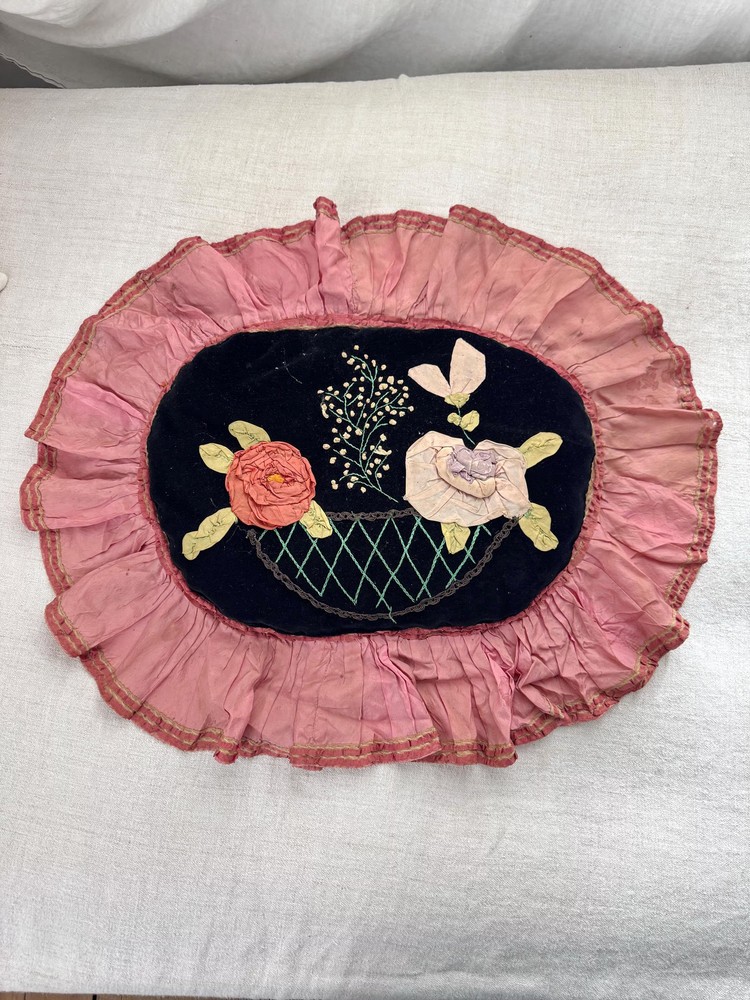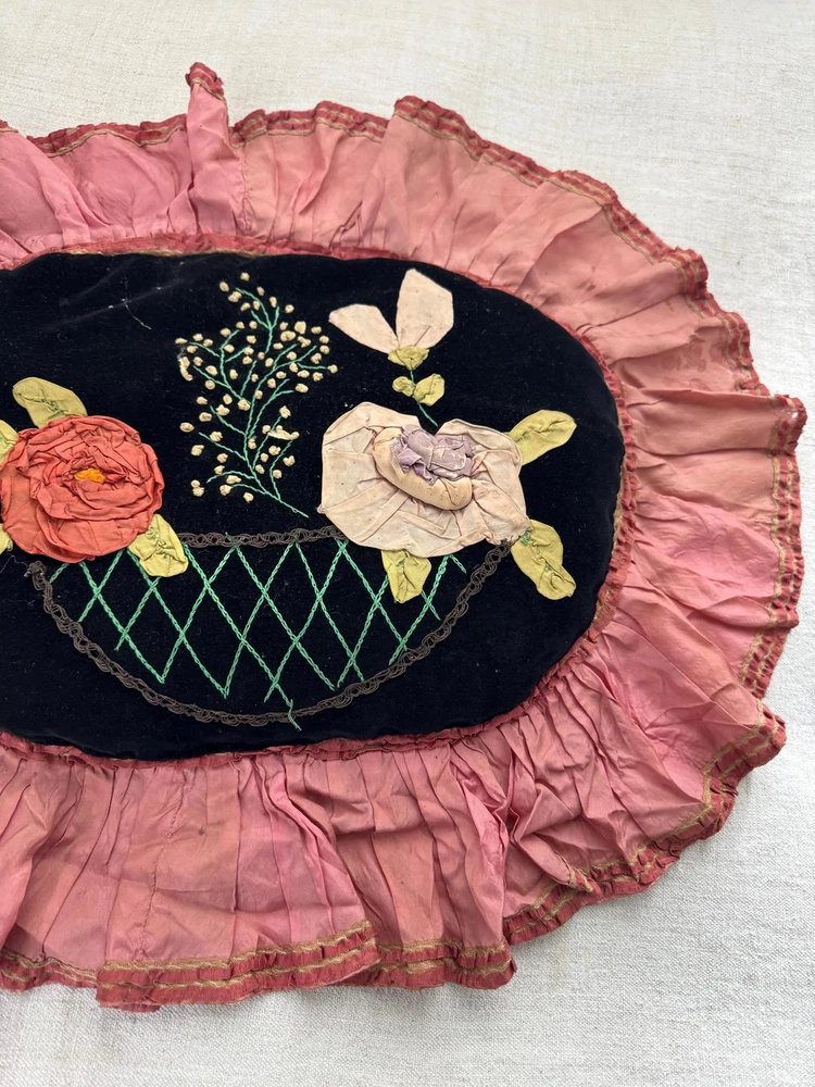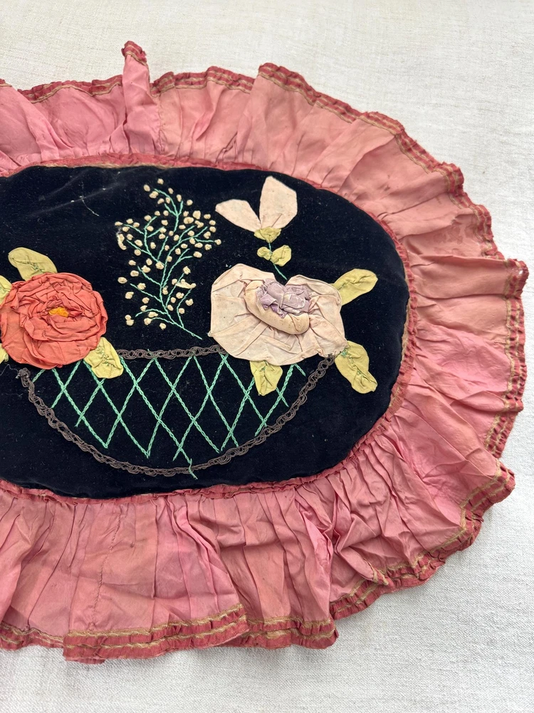 Welcome to The Textile Trunk ~ Thank you for over 25 wonderful years of helping bring these beautiful antique textiles and decorative items to life again! A charming textile from the past!~ Made around the 1880s–1900, it has all the charm we love in these early boudoir pieces. The front is worked on deep black cotton velvet, and the flowers are created using hand-rolled silk ribbonwork rosettes ~ a beloved Victorian technique used on accessories, gowns, and small decorative home pieces of the period. The basket and sprays are hand-embroidered in soft greens and creams, so typical of the era’s parlour decor. The surrounding ruffle is made from lightweight dyed silk, beautifully time-worn with splits and shattering exactly as Victorian silks age. These fragile silks tell such a lovely story of more than a century of life and display. This piece has that perfect wabi sabi, gently aged beauty that collectors adore. Such a sweet decorative cushion for a shabby cottage interior, French country decor, farmhouse shelves, or wall hanging ~ it’s just precious! MEASUREMENTS This pillow measures approximately 17 inches by 12 inches, with an additional 6 inch wide ruffle ~ CONDITION This textile work of art is in fine condition with signs of time and use, exactly as expected for a Victorian piece over 120 years old. The silk ruffle has shattering, small holes, and splits typical of weighted silks from the 19th century. There are holes in the backing. Light wear, softening, and gentle fading appear throughout the velvet and ribbonwork. The backing cotton shows age toning and losses. Signs of time and use are often inherent in antique and vintage textiles. Please use the zoom feature to view the exact condition!~ Inventory: 70