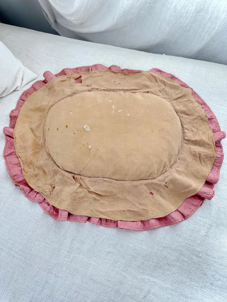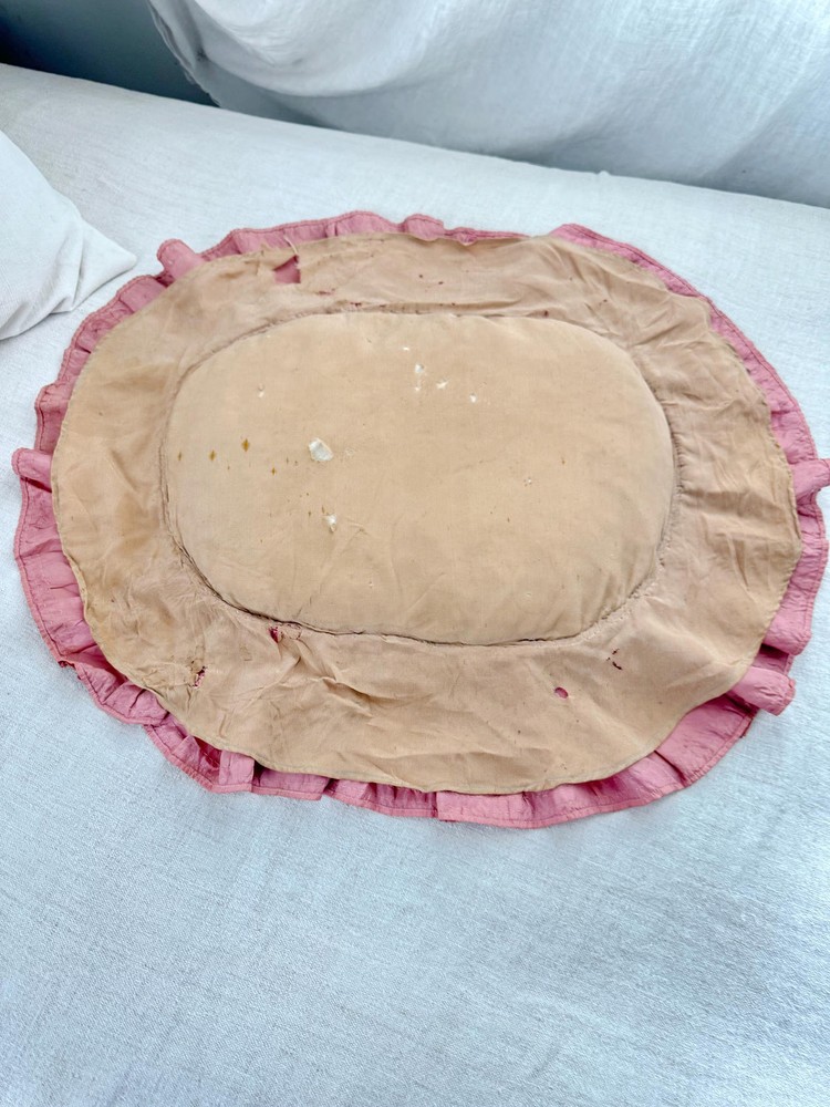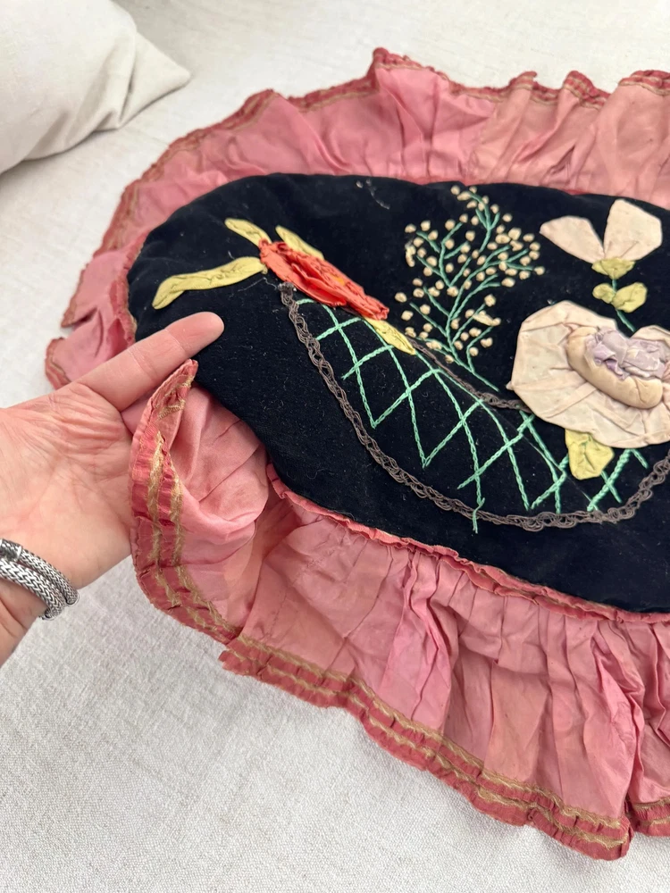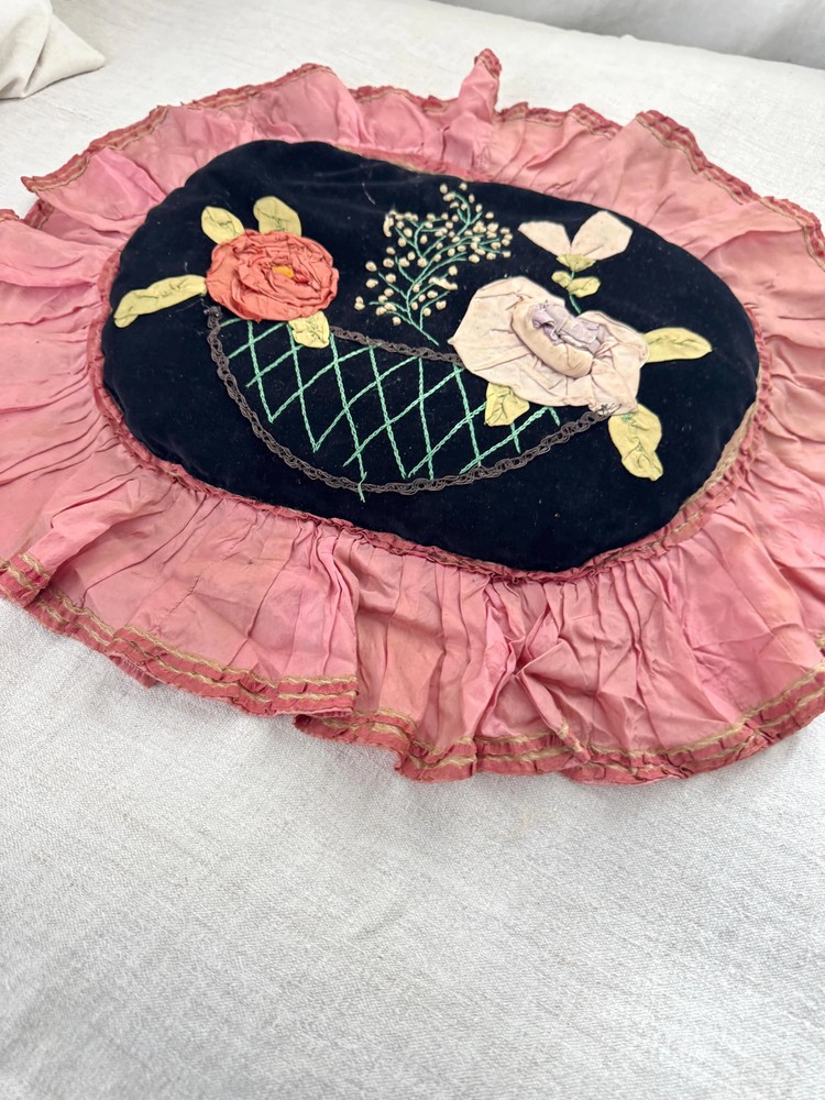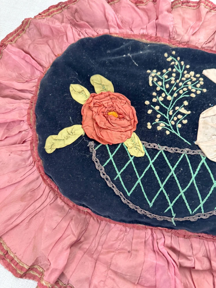 Welcome to The Textile Trunk ~ Thank you for over 25 wonderful years of helping bring these beautiful antique textiles and decorative items to life again! A charming textile from the past!~ Made around the 1880s–1900, it has all the charm we love in these early boudoir pieces. The front is worked on deep black cotton velvet, and the flowers are created using hand-rolled silk ribbonwork rosettes ~ a beloved Victorian technique used on accessories, gowns, and small decorative home pieces of the period. The basket and sprays are hand-embroidered in soft greens and creams, so typical of the era’s parlour decor. The surrounding ruffle is made from lightweight dyed silk, beautifully time-worn with splits and shattering exactly as Victorian silks age. These fragile silks tell such a lovely story of more than a century of life and display. This piece has that perfect wabi sabi, gently aged beauty that collectors adore. Such a sweet decorative cushion for a shabby cottage interior, French country decor, farmhouse shelves, or wall hanging ~ it’s just precious! MEASUREMENTS This pillow measures approximately 17 inches by 12 inches, with an additional 6 inch wide ruffle ~ CONDITION This textile work of art is in fine condition with signs of time and use, exactly as expected for a Victorian piece over 120 years old. The silk ruffle has shattering, small holes, and splits typical of weighted silks from the 19th century. There are holes in the backing. Light wear, softening, and gentle fading appear throughout the velvet and ribbonwork. The backing cotton shows age toning and losses. Signs of time and use are often inherent in antique and vintage textiles. Please use the zoom feature to view the exact condition!~ Inventory: 70