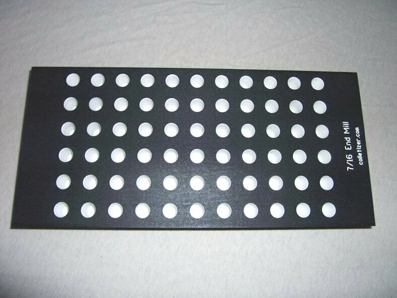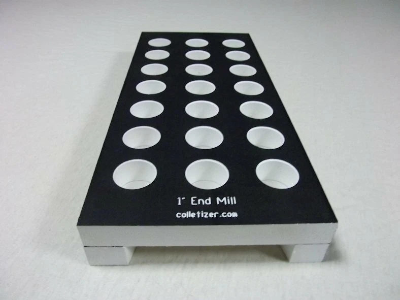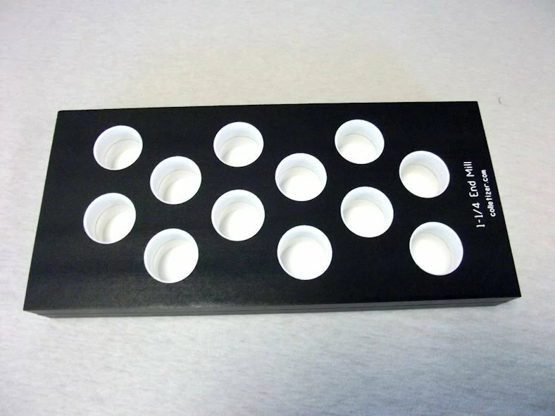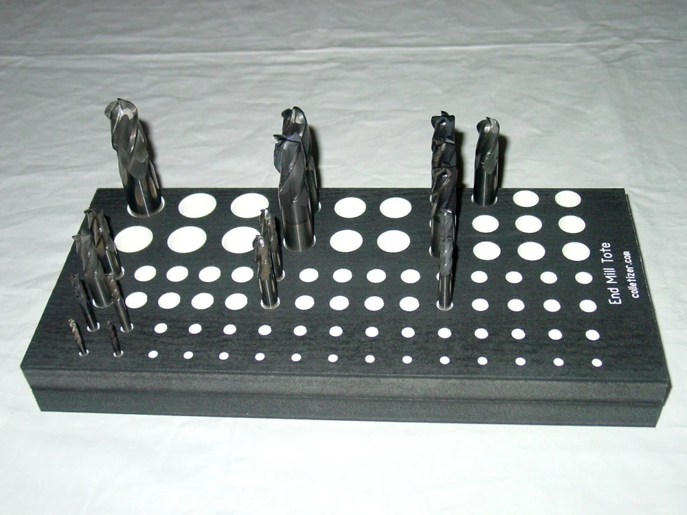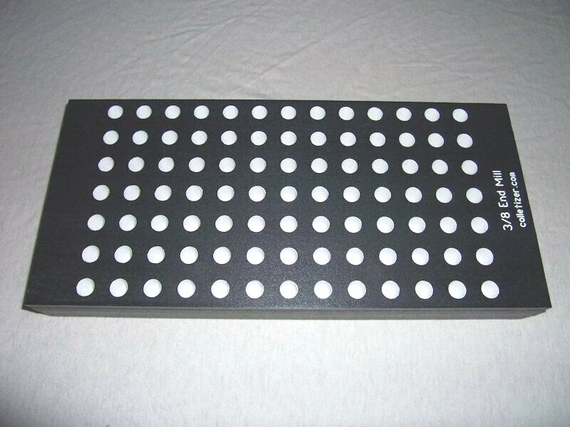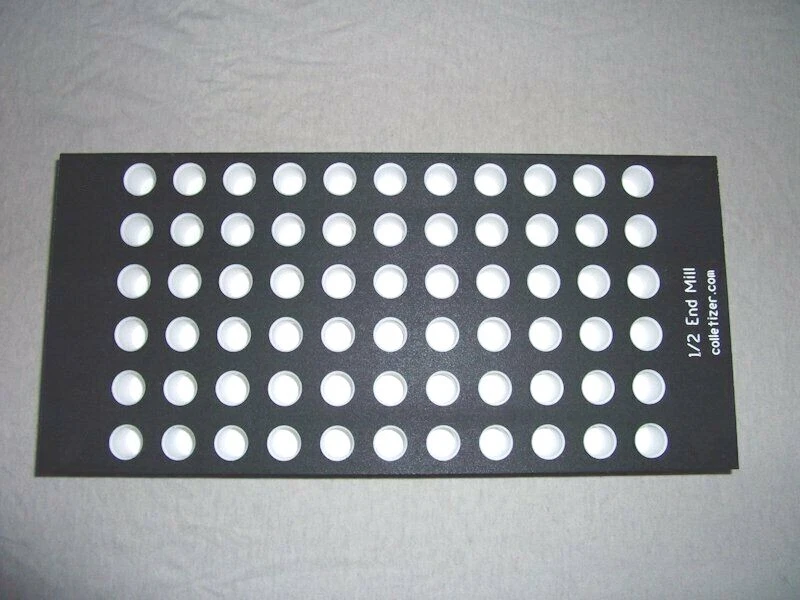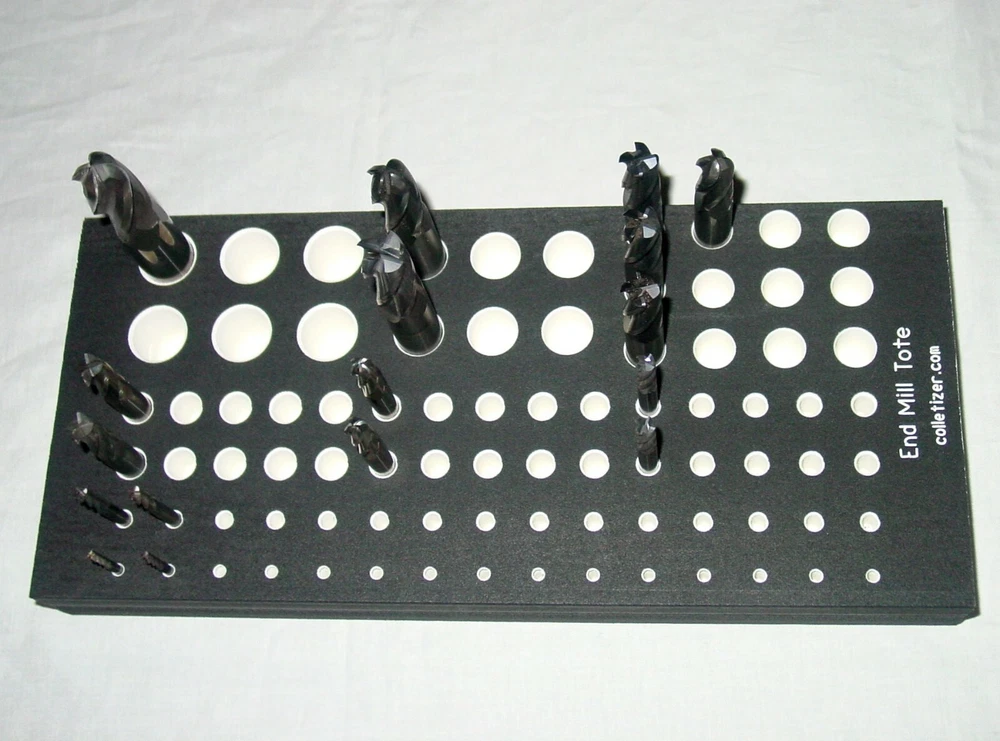 End Mill Storage Totes Ideal for end mill manufacturing. Works well for sleeves or other tooling. Hand notches on each end for carrying. Select the Variation desired above. 1/8" - (listed separately) 3/16" - 105 pockets 1/4" - 105 pockets 5/16" - 91 pockets 3/8" - 91 pockets 7/16 " - 66 pockets 1/2" - 66 pockets 5/8" - 45 pockets 3/4" - 40 pockets 7/8" - 28 pockets 1" - 21 pockets 1-1/4" - 12 pockets The "Mix" tote holds these sizes: 1/8" - 15 3/16" - 15 1/4" - 10 5/16" - 10 3/8" - 10 1/2" - 12 5/8" - 6 3/4" - 6 5.5 x 12 x 1.4" Made from PVC Made in USA Lifetime Warranty We also sell End Mill Totes with every hole for the same size end mill. These are suitable for end mill production or large stores of end mills. Check out our other items ! , Collet Racks: R8, 5C, TG100, TG75, ER40, ER32, ER20, ER16, ER11, DA180, DA100, DA200, DA300, Swiss collets, and more. We Combine Shipping Instead of adding the shipping cost to the item price we keep it separate to save you money on multiple purchases of our products. To get it please do one of the following: After Committing but Before Paying : Send us a message for us send a corrected payment request. After Paying : If you have already paid for the items you must message us for a "combined shipping partial refund".