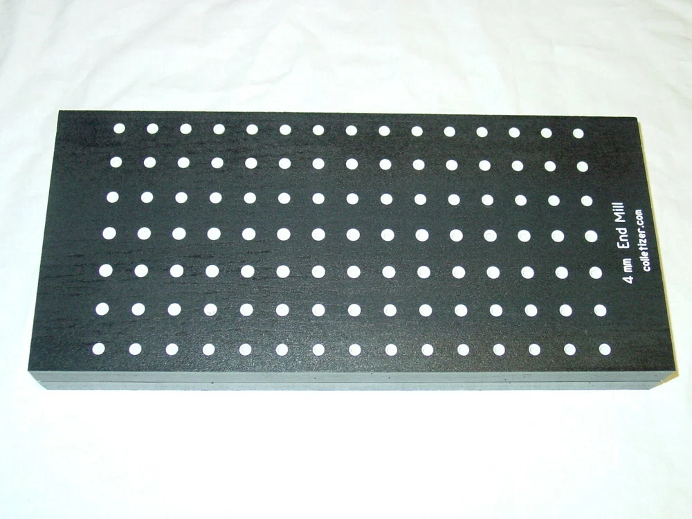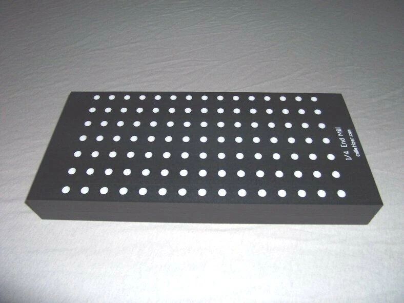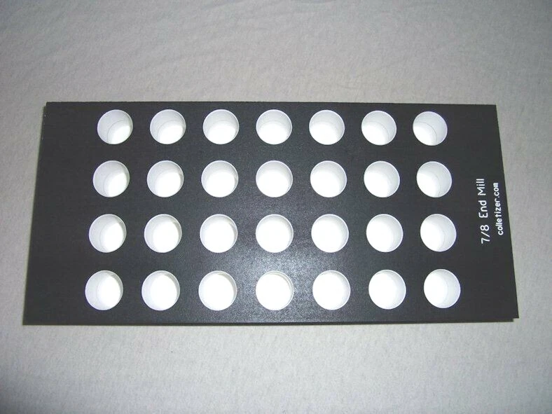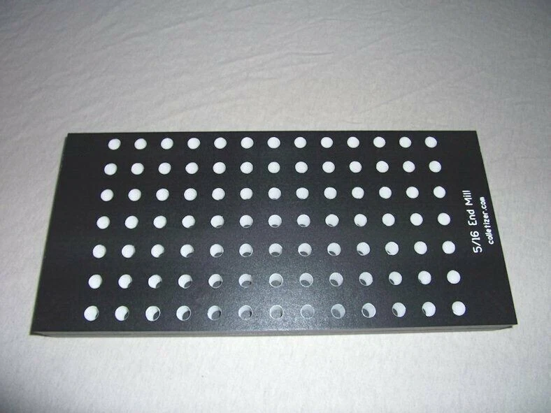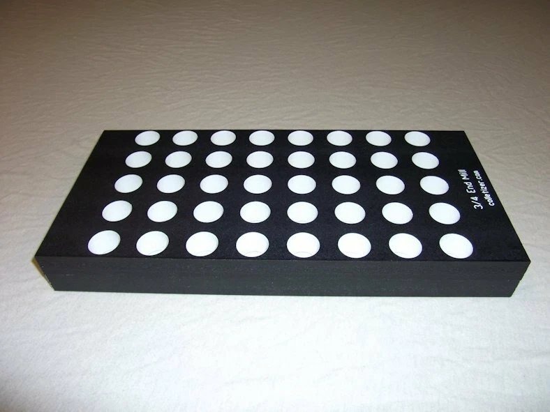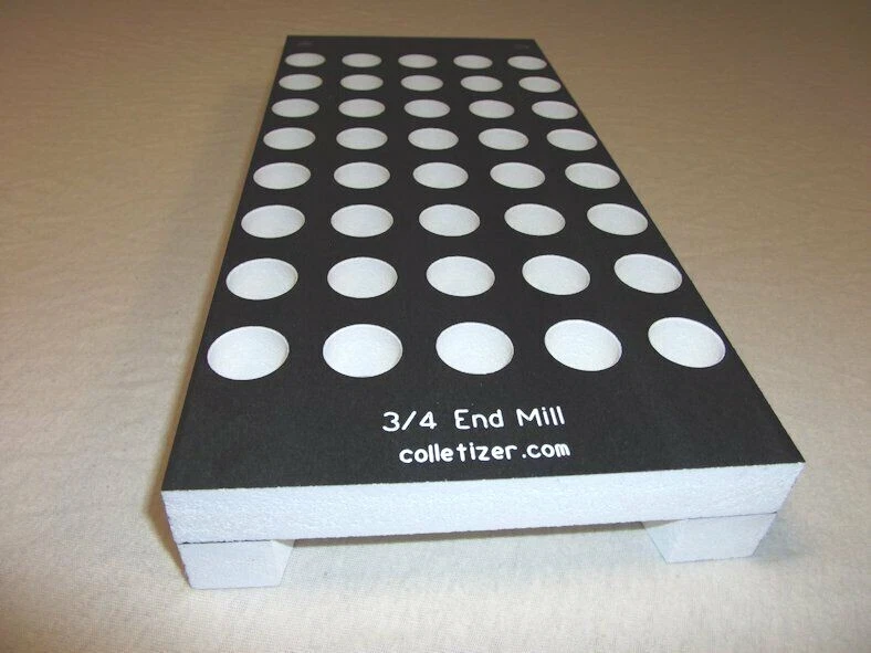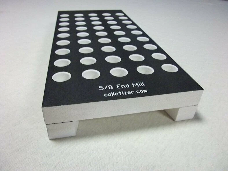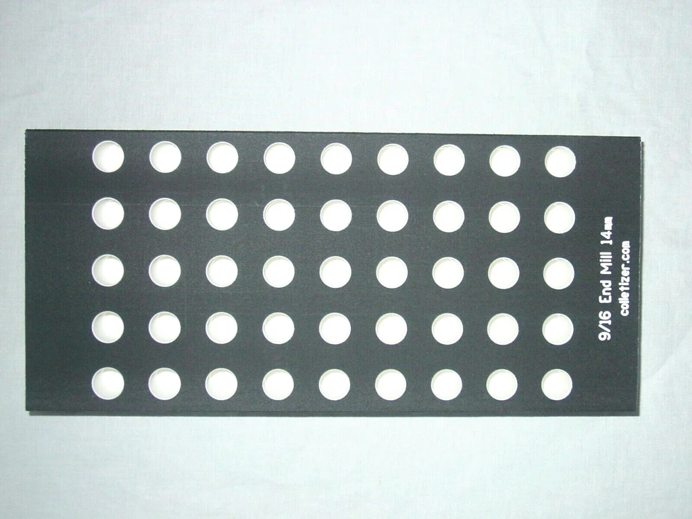 End Mill Storage Totes Ideal for end mill manufacturing. Works well for sleeves or other tooling. Hand notches on each end for carrying. Select the Variation desired above. 1/8" - (listed separately) 3/16" - 105 pockets 1/4" - 105 pockets 5/16" - 91 pockets 3/8" - 91 pockets 7/16 " - 66 pockets 1/2" - 66 pockets 5/8" - 45 pockets 3/4" - 40 pockets 7/8" - 28 pockets 1" - 21 pockets 1-1/4" - 12 pockets The "Mix" tote holds these sizes: 1/8" - 15 3/16" - 15 1/4" - 10 5/16" - 10 3/8" - 10 1/2" - 12 5/8" - 6 3/4" - 6 5.5 x 12 x 1.4" Made from PVC Made in USA Lifetime Warranty We also sell End Mill Totes with every hole for the same size end mill. These are suitable for end mill production or large stores of end mills. Check out our other items ! , Collet Racks: R8, 5C, TG100, TG75, ER40, ER32, ER20, ER16, ER11, DA180, DA100, DA200, DA300, Swiss collets, and more. We Combine Shipping Instead of adding the shipping cost to the item price we keep it separate to save you money on multiple purchases of our products. To get it please do one of the following: After Committing but Before Paying : Send us a message for us send a corrected payment request. After Paying : If you have already paid for the items you must message us for a "combined shipping partial refund".
