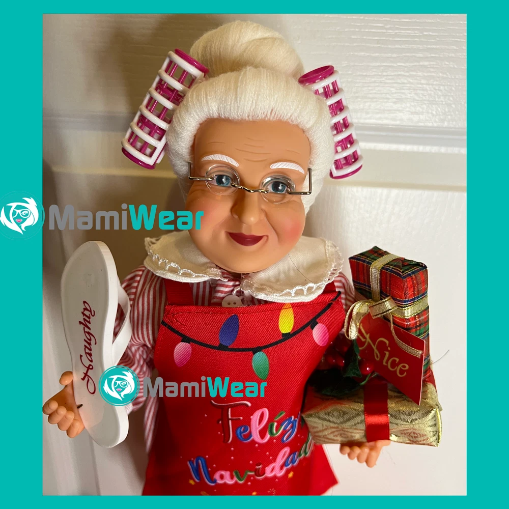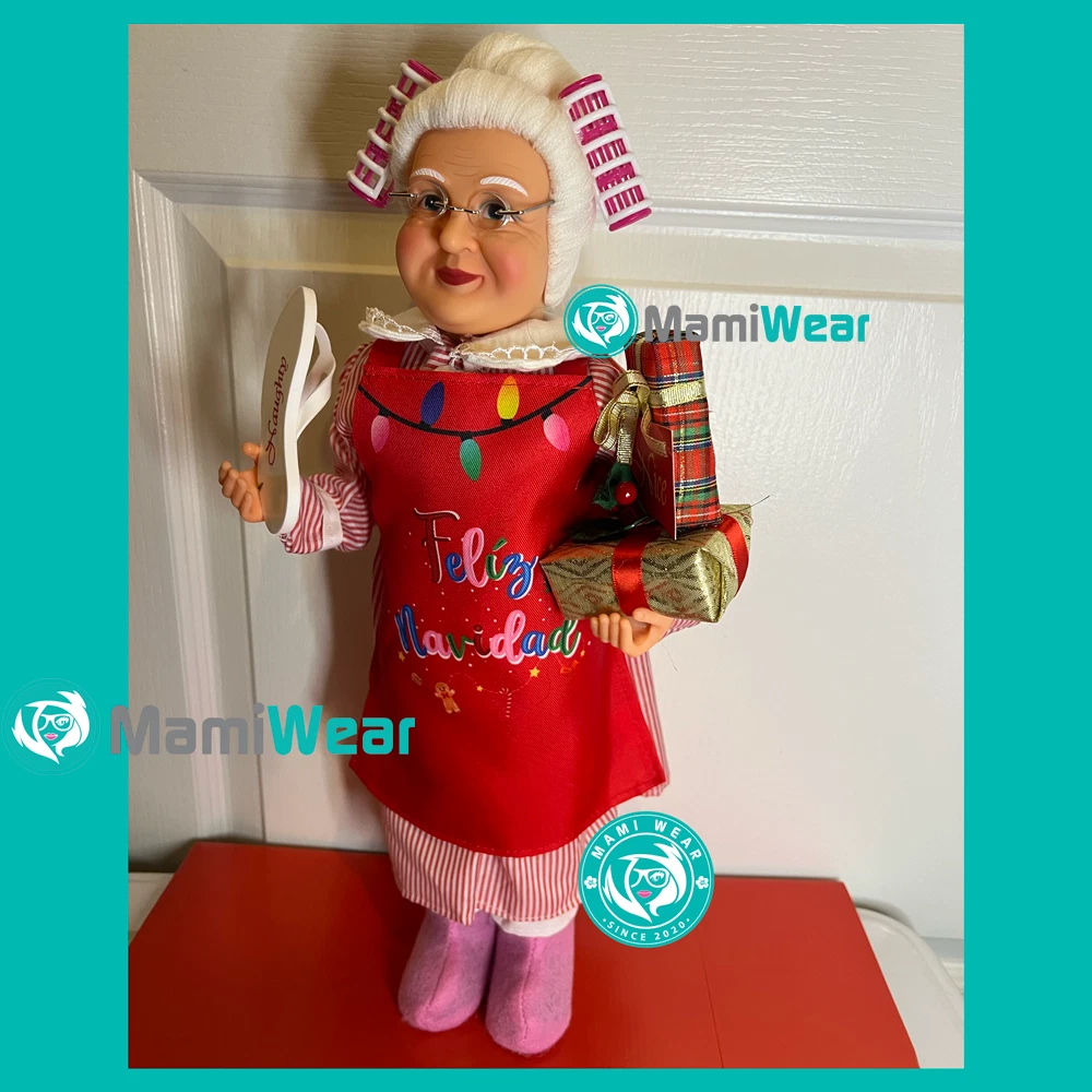 New with tags Size height 18" Celebrate the holiday season with this delightful 18-inch Hispanic Grandma "Abuela" Santa figurine, a perfect blend of charm and tradition! Featuring a cheerful abuela with white hair in a bun, accented by pink and white rollers, she holds a "Naughty" chancleta in one hand and two beautifully wrapped gifts with a "Nice" card in the other. Her long-sleeve striped pink-and-white dress, paired with a festive red apron that reads "Feliz Navidad" beneath painted Christmas lights, adds a unique touch to your holiday decor. Complete with pink shoes and silver glasses, this abuela figurine is a must-have for those who love to celebrate with Hispanic culture. The intricate hand-painted details and premium materials ensure she stands out in any Christmas display. Make this festive and heartwarming collectible the centerpiece of your holiday traditions or a thoughtful gift for loved ones!