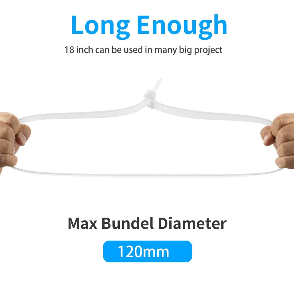 【Ultra Strong Heavy-Duty Zip Ties】Extra Large Wide Cable Zip Ties Heavy Duty for outdoor use, Width 9mm with 18 inch /450mm long. 200 LBS Ultra Strong Tensile Strength. Wider, Thicker, More durable for use! 【Multi-Purpose】heavy duty cable zip ties use Industrial-strength nylon 66 fireproof material, Large and Wide design to meet any needs in industrial and your life. 【UV Resistant Outdoor】Can be used in the environment of -35℃ to 85℃,and will not break after exposure to the sun and severe cold. Features durability, strong load ability, anti-aging, anti-acid and anti-corrosion. 【Easy-Using Desgin】The clear zip ties tail curves to ensure easy head insertion and smooth edges for quick and smooth tightening. The teeth are not returned while fixing the self-locking, which can better fix the thing. 【Warranty】offer a 30-Days warranty period. Customer will receive a 100% refund if any quality issue under warranty period.
