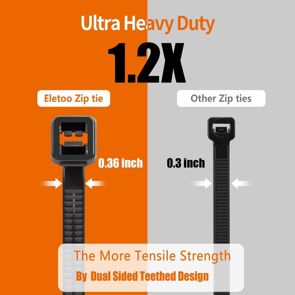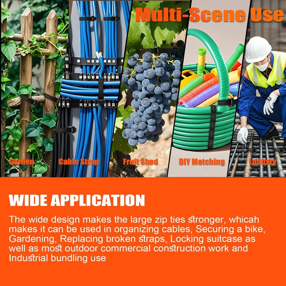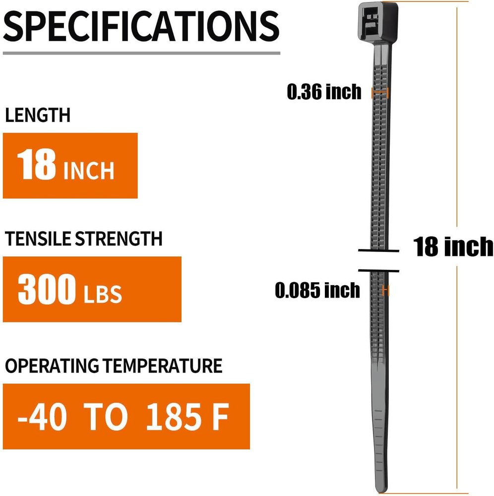 【7 Features】High Quality Nylon PA66, UV resistant, Fireproof, Frostproof, High flexibility, Easy to use with tail bend, can be used in snow and sunshine. 【2025 New Patented Design】Dual Sided Teethed and Self-locking fastener design, sturdy and durable, with a strong Ratchet-Lock design and dense teeth are More Durable for use than ordinary 18”zip ties. 【Indoors &Outdoors Use】Made of Industrial-strength nylon 66 fireproof material, which can be used in the environment of -35℃ to 85℃, Features strong load ability, anti-aging, anti-acid, anti-corrosion and durability.Ideal for both indoor use, Ideal usage for indoor and outdoor challenges. 【Wide Application】The wide design makes the large zip ties stronger, which makes it be used in organizing cables, Securing a bike, Gardening, Replacing broken straps, Locking suitcase as well as most outdoor commercial construction work and Industrial bundling use. 【Quality Services】If You have any dissatisfaction with the product, We offer a 30-day refund/return policy. We provide not only excellent products but also high - quality services. Try it, completely risk-free! Hurry up and click to add to the shopping cart! Product Description