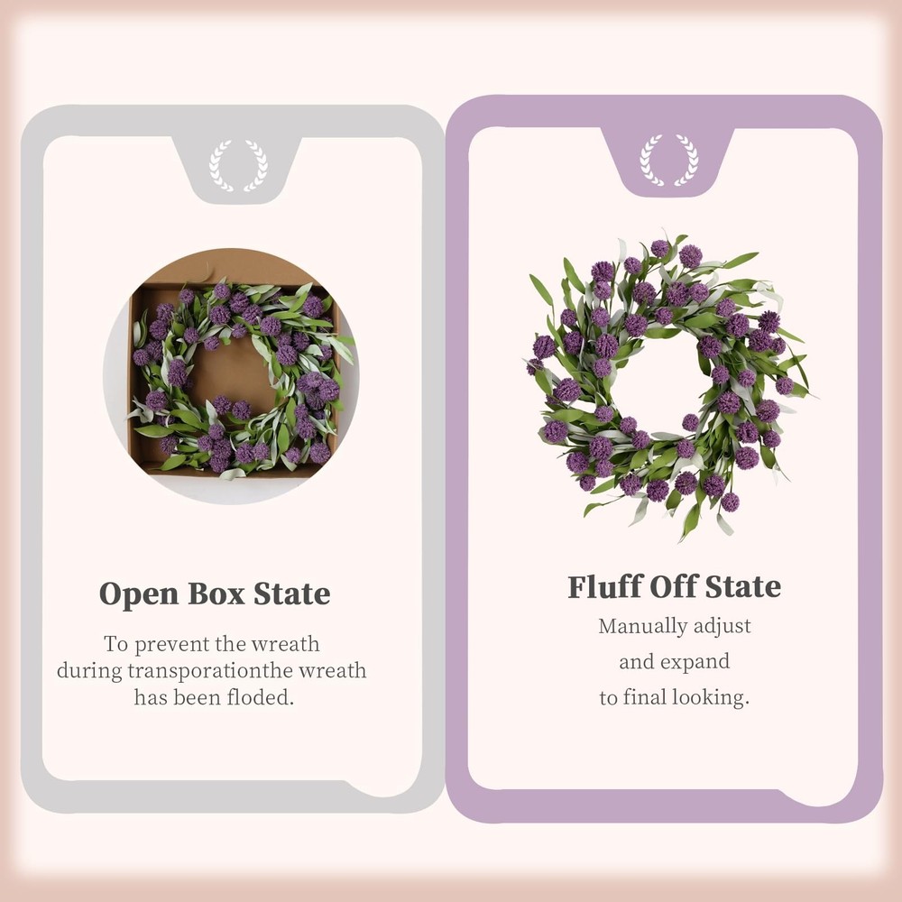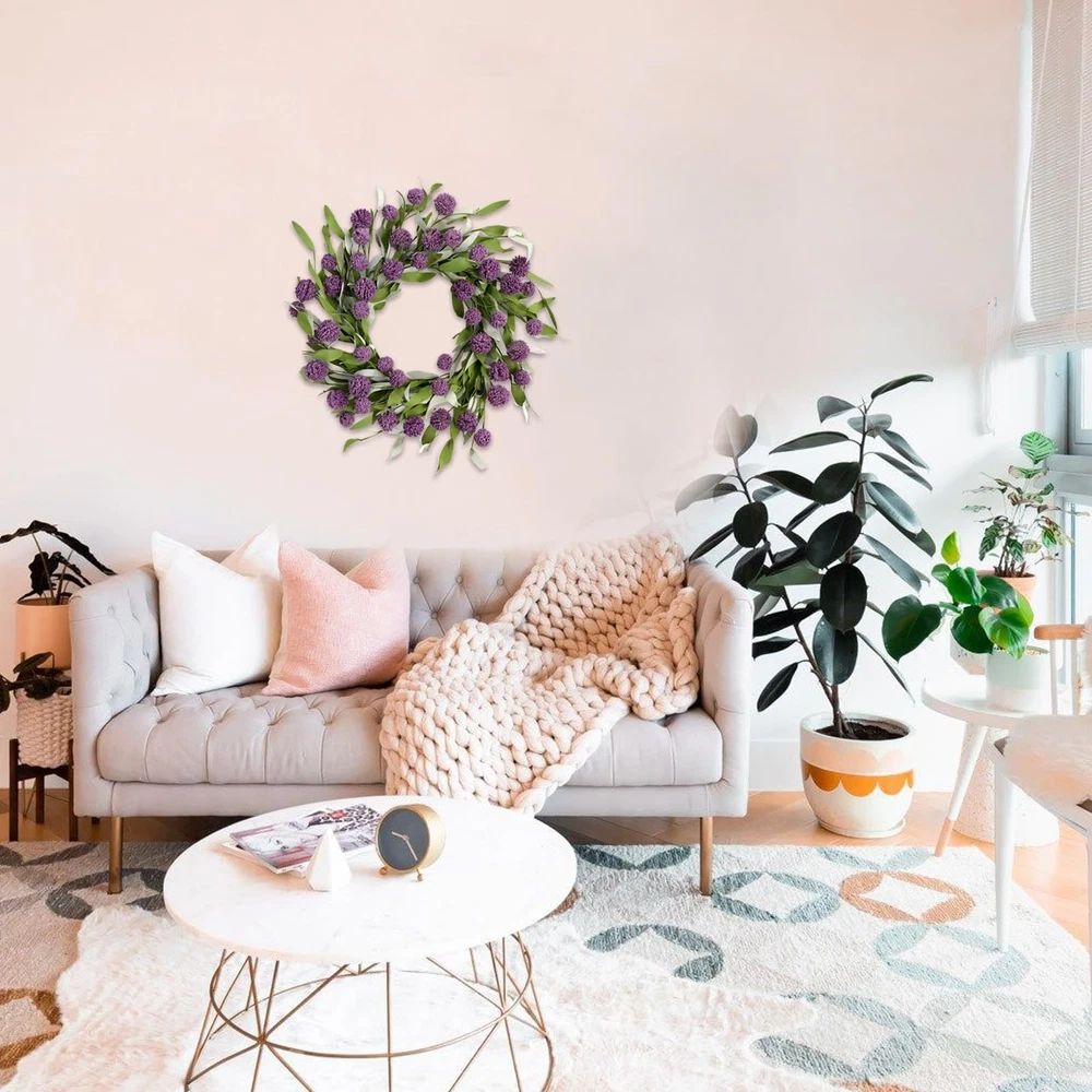 18-inch ball flower wreath, an excellent outdoor decoration designed for spring and summer, will fill your surroundings with vitality. It is suitable for use on front doors, walls, outdoors, indoors, windows, fireplaces, living rooms, porches, party center decorations, and weddings. The fresh and simple farmhouse style makes it suitable for most occasions. It is also perfect for all holidays such as Mother's Day, Easter, Valentine's Day, etc. 【Spring and Summer Front Door Wreath】: Skillfully combining vibrant ball flowers with slender willow leaves, this wreath is designed specifically for spring and summer outdoor decoration, bringing vitality to your surroundings. The full-bodied shape of the flowers adds depth to the wreath, enhancing its visual appeal. 【Size Information】: Our spring and summer wreaths have an outer diameter of approximately 18 inches. They are entirely handmade, featuring flexible and durable plastic materials for the leaves and flowers, which feel realistic and soft to the touch. The base is made of an iron ring, ensuring years of use without deformation. 【Multi-purpose Decoration】: Suitable for use on front doors, walls, outdoors, indoors, windows, fireplaces, living rooms, porches, party center decorations, and weddings. The fresh and simple farmhouse style makes it suitable for most occasions. It is also perfect for Mother's Day, Easter, Valentine's Day, and all other holidays. 【Slightly Fluffy】: The wreath may be slightly compressed during transportation, please reshape it before hanging. All branches are soft and flexible, allowing you to easily adjust the shape of the wreath to make it full and round. 【Maintenance-free】: It requires no watering or maintenance to stay bright, colorfast, and durable. Every detail of the exquisite wreath is carefully handmade, and the flowers and leaves will not easily fall off. It is not only a beautiful summer door wreath but also of high quality.
