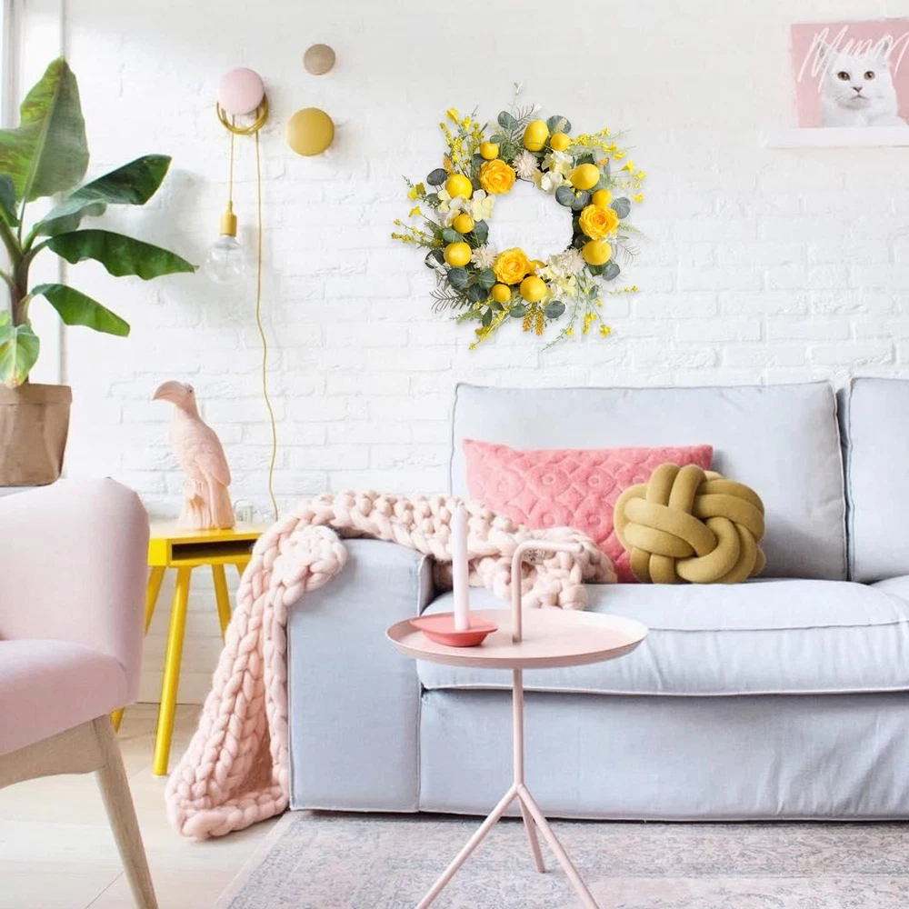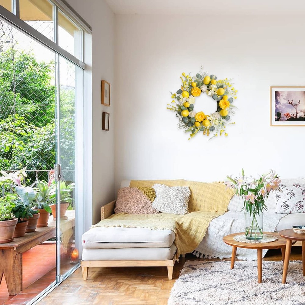 18 Inch Summer Yellow Lemon Roses Wreath for Front Door, Eucalyptus Leaves with Hydrangea Forsythia Flowers Wreath for Indoor and Outdoor, Rustic Farmhouse Door for Home Decor Product Details Color: Yellow Brand: Floribus Material: Artificial Flowers, Foliage, Plastic/Wire Base Shape: Round Item Weight: 0.8 Kilograms Product Dimensions: 4"D x 18"W x 18"H Manufacturer: Floribus Color: Yellow Brand: Floribus Material: Artificial Flowers, Foliage, Plastic/Wire Base Shape: Round Item Weight: 0.8 Kilograms Product Dimensions: 4"D x 18"W x 18"H Manufacturer: Floribus Item Weight: 1.76 pounds Item model number: 2414 Date First Available: November 14, 2024 [Summer Yellow Lemon Door Wreath] Summer is wet and hot, some fresh and cool decorations will add some points for your live place, summer yellow lemon wreath will be a good choice for your doors, the fresh yellow color and the fresh lemon together with well opening yellow roses, this summer will be beautiful and fresh. [18 Inch Front Door Wreath] The outer diameter of this summer lemon wreath measures 18 Inch, this size wreath has a really wide use, such as hanging on your front door, porch door, hanging on your yards to appeal to the season atmosphere, hanging on wall, windows and your home enter place. [Yellow Roses Forsythia Flower Wreath] To appeal to the fresh yellow color, we add two different yellow artificial flowers, one is the romantic yellow roses with ninety percent opening, and the other one is the cute forsythia flowers. [Eucalyptus Leaves Flowers Wreath] The leaves selected for this wreath is extremely strict, we passed some common leaves and we finally selected this cute dollar eucalyptus leaves for this wreath, because the shape of the leave is round and color is fresh and real. [TIPS] 1.Fluff the wreath up before hanging on. 2.This lemon wreath is recommended indoor use, if use outside, please avoid directly exposed to the strong sunlight to protect the wreath.