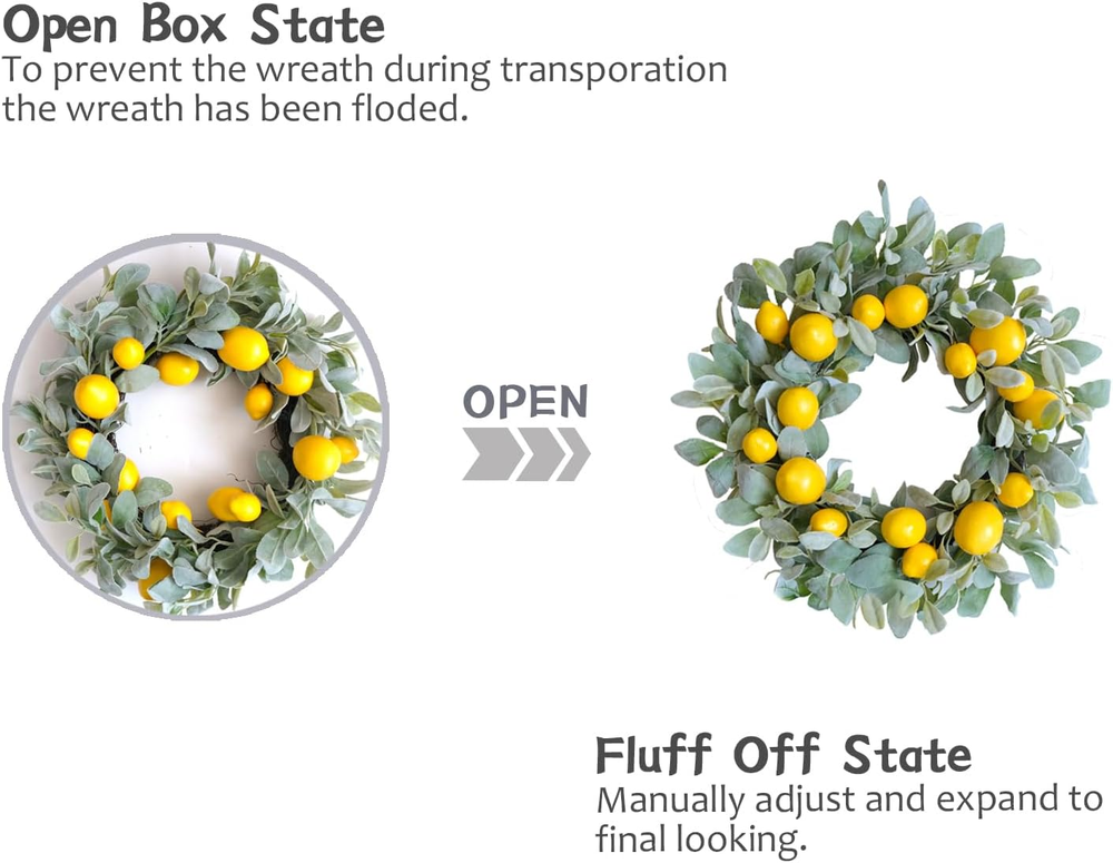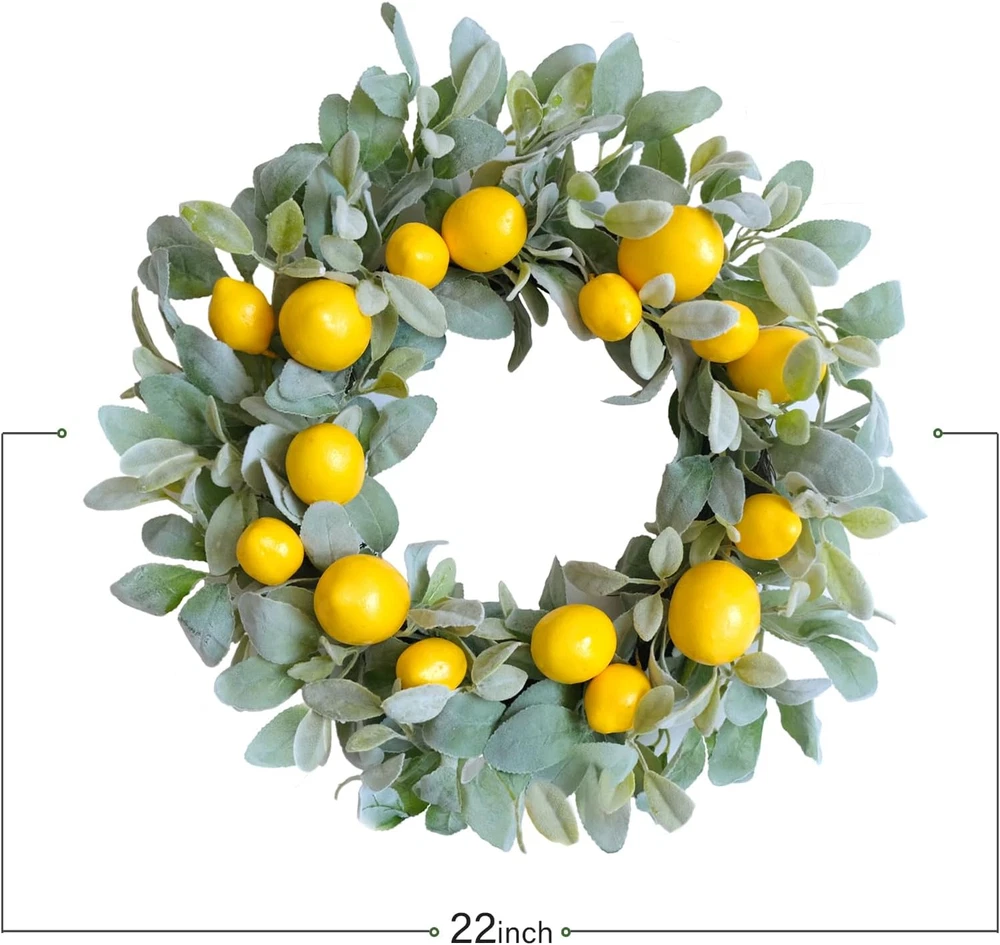 Store New Arrivals Add to Favorite View Feedback 18 Inch Yellow Lemon Spring Summer Wreath for Front Door, Lamb Ears Leaves with Artificial Lemon Door Wreath, Green Leaves for Indoor and Outdoor Description Item model number E-SUM-2303 Mounting Type Door Mount Color Yellow, Green Brand egolot Material Metal Country of Origin China Item Weight 0.87 Kilograms Shape Round Occasion Casual, Seasonal, Special Event Product Dimensions 18"D x 4"W x 18"H Manufacturer egolot [Yellow Lemon Door Wreath] Fresh yellow lemon brings home live and energy, especially in Spring and Summer day. Cute lamb ears leaves adds lovely and life looking for this wreath. This lemon wreath will be a good choice for hanging on your doors and home to add some color. [18 Inch Summer Spring Wreath] The outer diameter of this everyday lamb ears leaves lemon wreath measures about 18 Inch, this size is really suitable for who are seeking the large size and leafy full wreath for home decoration, such as hanging on the front door, back door, inside doors and decor your window and yards etc. [Lamb Ears Leaves Lemon Wreath] The lamb ears leaves is different from ordinary leaves, the color of this leave is soft and elegant, the shape of this leaves is cute and lovely. So lamb ears leaves wreath is well-matching and suitable for all kinds of home decor styles. [Wedding Lemon Wreath] If you are planning an romantic wedding party inside or outside, this green lamb ears leaves wreath with fresh yellow lemon will be a good choice as a wedding decorating wreath for hanging on the doors, windows, walls, chairs and cars etc. [Tips] 1.Fluff off the wreath to a perfect shape before hanging. 2.Please indoor use and covered outdoor use to keep the wreath long-lasting. 3.Avoiding high temperature weather and strong sun exposure to protect the yellow lemon. Fresh yellow lemon brings home live and energy, especially in Spring and Summer day. Cute lamb ears leaves adds lovely and life looking for this wreath. This lemon wreath will be a good choice for hanging on your doors and home to add some color. ABOUT US We offer the best prices around on high quality products. Our E-store includes media such as books, movies, music and games while offering electronics, toys, sporting apparel, clothing, tools, general home, garden items and more. SHIPPING We are always working hard to ensure your package arrives as soon as possible. Please understand that some factors like weather, high postal traffic, and the performance of shipping companies are outside of our control. We offer free shipping to the lower 48 states and ship within 2 business days of payment, usually sooner. We do not accept P.O. Boxes. Please provide a physical address. RETURNS We offer a 30-Day Return Policy on items which you are not completely satisfied with. You have the option for a full-refund or an exchange of the item. No returns are available on items shipped outside of the USA. PAYMENT We accept PayPal. CONTACT US This page content is yet to come Please ad us to your favorite seller and visit again later Thank You