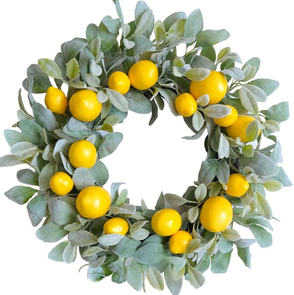 18 Inch Yellow Lemon Summer Wreath with Lamb Ears for Front Door Decor
