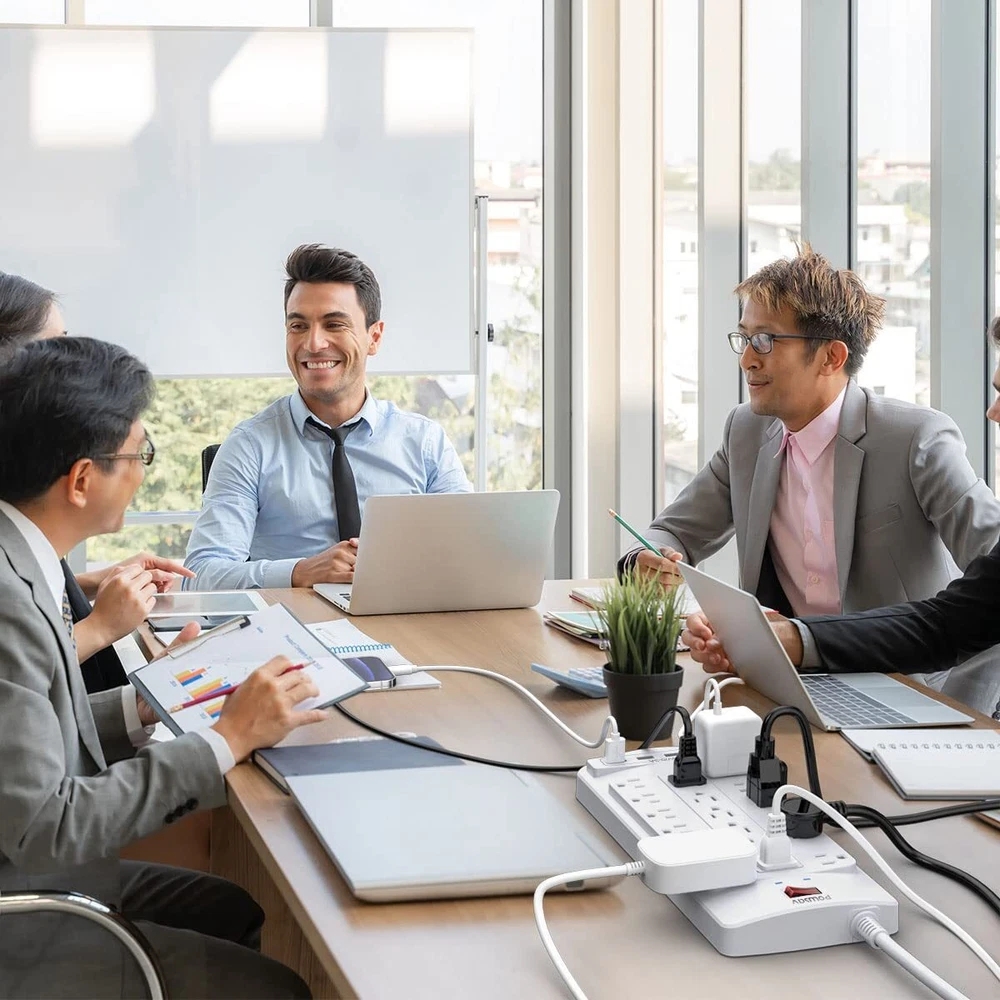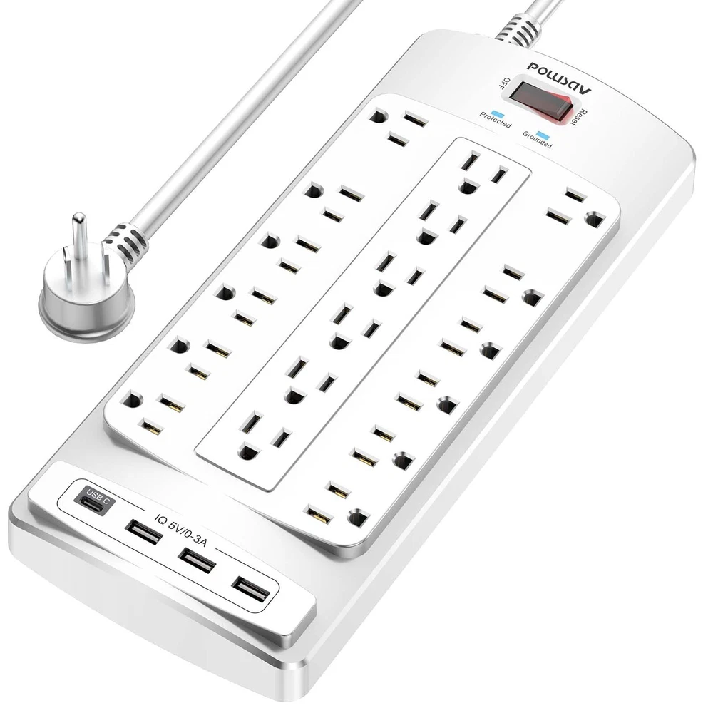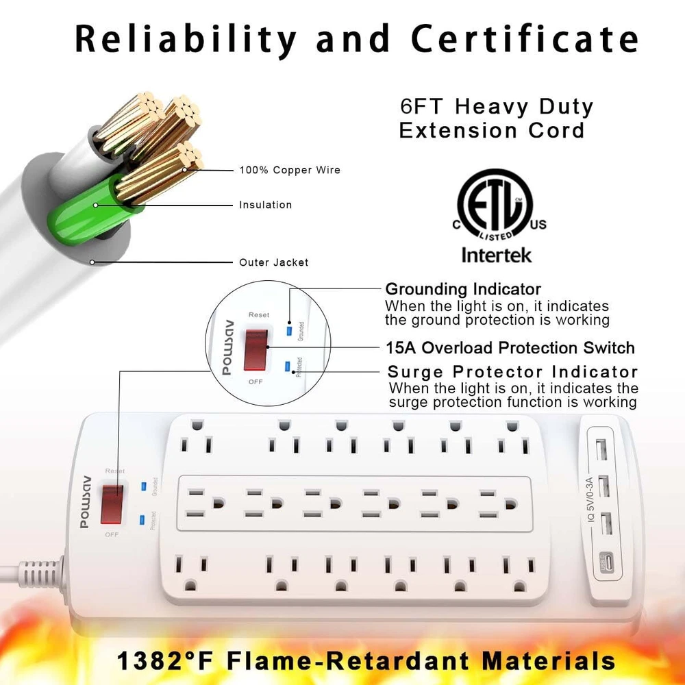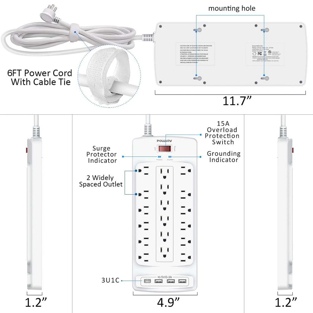 Specifications: Input Voltage: 100-240VAC; 60HZ; Max.Current: 15A; Max.Power Rating: 1875W; Surge Protector Rating: 2100 Joules; USB Port Output: DC 5V, Total 3.0A; Item Dimensions: 11.7*4.9*1.2 INCH; Length of Cable: 6Ft; Color: White; Package list: 1 x Wall Outlet with USB Charger; 1 x Instruction manual ; 1 x Paper Box; Notice: Do not exceed the total rating or it may cause damage to the unit and fire hazards. Power Strip with 18 outlets & 4 USB Ports: 18AC outlets & 4 USB ports (5V/3.0A, 17W) power strip with 6 feet Flat Plug Heavy Duty power extension cord(1875W/15A), surge protector(2100 Joules) with overload protection protects against spikes and fluctuations,Lots of outlets for a computer desk works great for all the electronics a gamer needs. 6 Feet extension cord with Flat Plug and Cable Ties: 6 Ft Right Angled Flat Plug power cord makes it more flexible,Reusable Fastening Cable Ties Can tie up the unused cord and make it better organized. 18 AC Surge Protector Outlets: The 3 level complementary Surge Protector Circuit which composed of TVS (transient voltage suppressor), MOV (metal oxide varistor), GDT (gas discharge tube), with minimum 2100 Joules energy absorbing capacity, could protect your devices much more quickly and reliably than other brand’s 1 level MOV Surge Protection Circuits. Safety and Certificate: ETL safety certified, with extension cord and other major components certified by UL. The over current protection switch limits the power strip's working current to certain setting, so it will not get hot during usage. Environmental protection and fire-resistance PC shell with flame retardant at 1382℉ makes it more durable and longer . Our After Sale Service: ETL Certified,Our friendly and reliable will respond to you within 24 hours. You can purchase with confidence, with our 30-day return and 12-month Service.