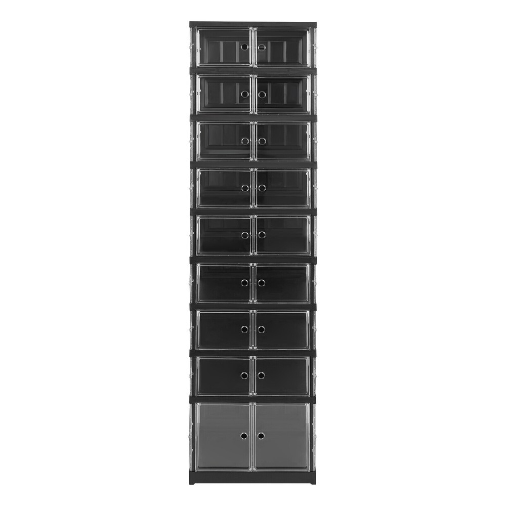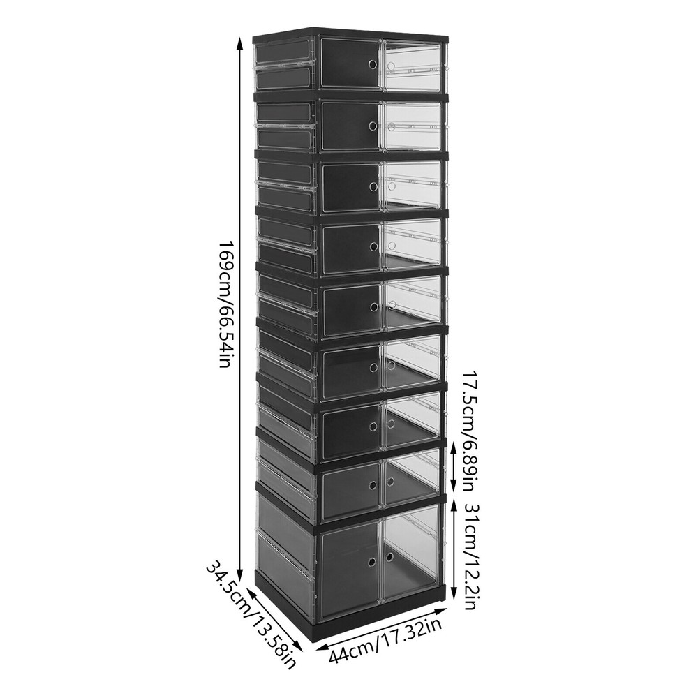 18 Pairs 9 Layers Shoes Standing Cabinet Storage Shoe Rack Organizer Dustproof Application It is suitable for entrances to bedrooms, living rooms, cloakrooms, stairs, etc. It can be used to store various types of shoes such as high-heeled shoes , sports shoes, and high boots. How to Install 1. Open the packaging and remove the cabinet. 2. Fold dow n and stretch the cabinet, and insert the middle partition and back plate into the fixed slot. 3. Pull out the door panel and complete the installation. Specifications Material: PP and PS Process: Injection Molding Style: Modern Color: Black, Clear Shape: Rectangular Assembly Required: Yes Mounting Type: Floor Standing Number of Tiers: 9 Number of Wheels: 4 Each Tier Load-bearing Capacity: About 3kg/6.61lbs Product Size: 44*34.5*169cm/17.32*13.58*66.54in Tier Spacing: 31cm/12.2in, 17.5cm/6.89in Package Size: 51*40*33.5cm/20.08*15.75*13.19in Gross Weight: 11.5kg/25.35lbs Net Weight: 10.6kg/23.37lbs Package Included 1* Shoe Cabinet Description Are you still struggling with organizing a large number of shoes? Our shoe cabinet can solve your problem. The high-class materials and exquisite craftsmanship make it sturdy and durable. The 9-tier design and strong load-bearing capacity can meet your storage needs. With its generous appearance, it can easily blend into your home. In short, it is your assistant for organizing shoes! Key Features Build to Last : Made of PP and PS with an injection molding process, this product is impact-resistant , tear-resistant, and durable, ensuring your long-term use. Storage Assistant: Its top can be used to store items. The 9-tier design with a heightened (12.2'') bottom compartment allows you to store various types of shoes such as high-heeled shoes , sports shoes, and high boots, making full use of vertical space to organize your shoes in an orderly manner. Strong Load-bearing Capacity: High-class materials and sturdy structure make each tier capable of bearing about 6.61 lbs, allowing you to use it with confidence. Foldable Design: The foldable design allows you to place it on the floor and pull it apart to use it after installation. In addition, it allows you to store the product in a corner when not in use without taking up much space. Thoughtful Design : The clear door panel allows you to see the shoes inside clearly, making it convenient for you to search for shoes. The magnetic double door design can prevent dust from entering the interior and keep the shoes as clean as new. The round holes on the door panel make it convenient for you to open and close the door. Easy to Clean: It has a smooth surface and a simple structure, so you only need to wipe the dust with a towel regularly. Ideal Gift: This practical product can be used as an ideal housewarming, birthday, and holiday gift for parents, friends, and loved ones. Customer Service: We stand behind all our guests and look forward to assisting you with your purchase. It is our pleasure to answer your confusion and questions. The end of the story between us is definitely not "we sell and you buy". Details Wheels: The bottom 4 wheels make it easy for you to move this product from one place to another without spending too much time and effort. Smooth Edges: The smooth edges and round corners not only enhance the aesthetics of the product but also improve safety during installation and use. Notes Please use this product within the load-bearing range. Please note that this product does not include shoes. Please allow the slight color difference caused by the shooting light and 1-3 cm error due to manual measurement, and make sure you do not mind before ordering. Payment Delivery details Terms of sales About us Contact us Payment We accept ebay payment 。 Fees such as import duties, taxes are not included in the item price or shipping costs. These charges are the buyer's responsibility. Delivery details Shipping: 2-9 working days to: USA Terms of sales We maintain high standards of excellence and strive for hundred percent customer satisfaction. Feedback is very important to us. We hope that you contact us immediately before you give neutral or negative feedback, so that we can address your concerns. It is impossible to address issues if we do not know about them! About us Your satis faction is our ultimate goal. We work hard to earn your trust and future business. Our certified technicians have tested each item before shipping. The unit comes with 1 year limited warranty on all manufacturing defects. a) If you receive a defective item, you may return it or ask for a discount. Please contact us within 14 days after you receive the package. b) What you returned must be intact and in its original packaging as re? u. Customer is responsible for shipping costs of the returned item. c) We will cover the cost of shipping back t with the shipping rate indicated in the registration page. We will send you a new unit or refund the full payment you paid. Thank you. Contact us Business Hour Business Hour: Monday To Friday: 8:30 AM to 5:00 PM (Beijing China time) Due to time zones, our reply to your questions may not be immediately. But within above working time, we will reply your email within 24 hours. If it's non-workdays, please kindly be patient and wait till Monday. Please contact us with ebay message. Please feel free to contact us if you have any questions. Monday To Friday: 8:30 AM to 5:00 PM (Beijing China time) Due to time zones, our reply to your questions may not be immediately. But within above working time, we will reply your email within 24 hours. If it's non-workdays, please kindly be patient and wait till Monday. Please contact us with ebay message. Please feel free to contact us if you have any questions.