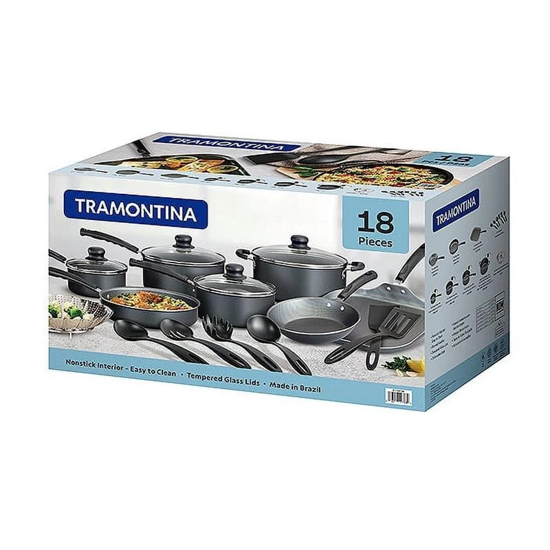 PrimaWare 18-Piece Nonstick Cookware Set provides all the cookware essentials and is an excellent starter cookware set. The patterned interior nonstick coating ensures easy cooking and simple cleanup, while the heat- and shatter-resistant tempered glass lids allow quick monitoring of cooking progress. PrimaWare 18-Piece Nonstick Cookware Set: Patterned gray interior non-stick coating for easy cooking and cleaning Riveted, stay-cool handles Heat- and shatter-resistant tempered glass lids allow easy monitoring of cooking progress Dishwasher-safe Compatible with gas, electric and ceramic glass cooktops Set includes: 8" saute pan 9" deep saute pan 11" griddle 1 qt sauce pan with lid 2 qt sauce pan with lid 3 qt sauce pan with lid 4 qt Dutch oven with lid (4 qt lid fits the 9" deep saute pan) Stainless steel foldup steamer Solid spoon Slotted spoon Solid turner Slotted turner Pasta spoon Ladle