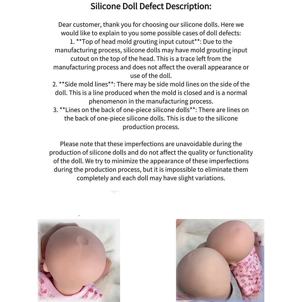 She is about 18 inch ,painted baby girl(Anatomically Correct) Net weight is :5.6 lb Mouth: she can take a pacifier Function: Doll's limbs are flexible and poseable, the doll can sit, lay down easily and have a bath, but cannot stand up, speak, pee, blink PACKAGE LISTS: 1x Full silicone baby girl. 1x outfit (by random) ★Full body silicone: Our reborn baby doll's is made of Platinum Liquid Full Silicone, she is Solid reborn baby dolls ★Better than Vinyl material: Medical silicone material is more environmentally friendly than vinyl and safer for your babys. ★PVC Free, Non-Toxic ★More real feeling: Our doll's touching feeling is like a real baby than Vinyl dolls ★Great for Child and Best Choice For Adoption: Let your child feel that he is a playmate and not just a toy. Because it is Weighted Body for a "Real" Baby Feel. ★The best gift for your child to improve social ability and open up thinking. Children will acquire strong cognitive ability. ★The best choice for collecting baby dolls. So we think you should choose us, Not only give you the lifelike baby dolls, but also give you more choices. We have different sizes and genders realistic baby dolls. • Safety: Conforms to the safety requirements of ASTM F963 and EN71 for ages 3+ 【Kind Reminder】Each of our dolls is purely handmade, and the pictures are real-life photos. There may be slight differences between each silicone doll, and there may be slight flaws. If you mind, please choose carefully. 【User Notice】 Our reborn baby dolls' head has a silicone injection hole. The injection hole is one of the processes of making dolls. So it will leave a slight mark on its head. This is not a doll's quality problem. Tips: Silicone doll daily care can be done by patting talcum powder all over the body after cleaning the doll, keeping it dry and avoiding sticking.