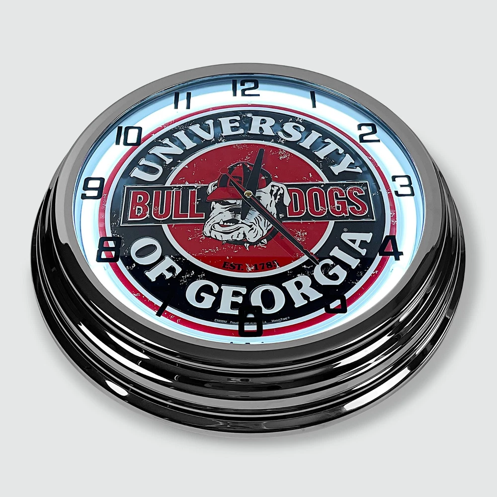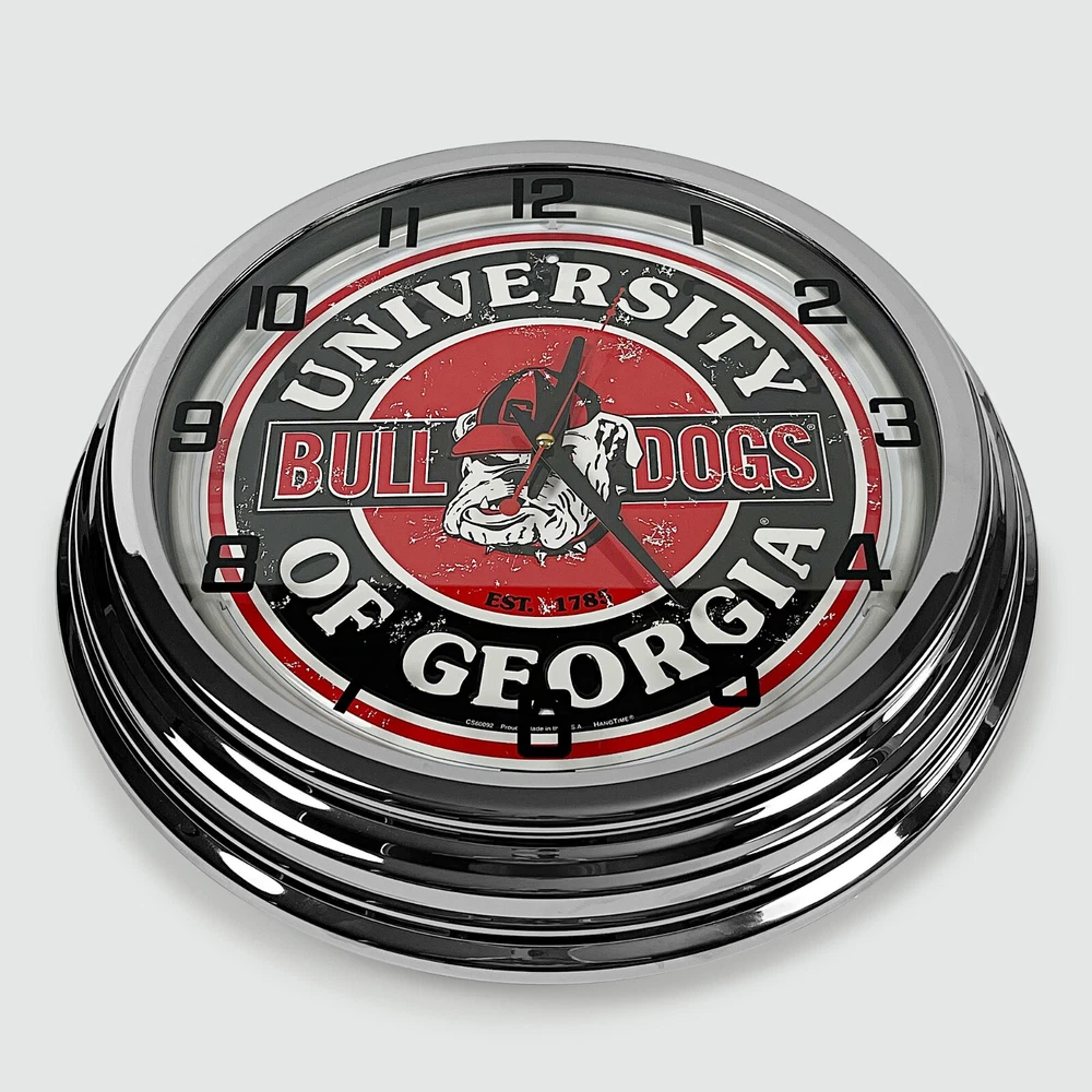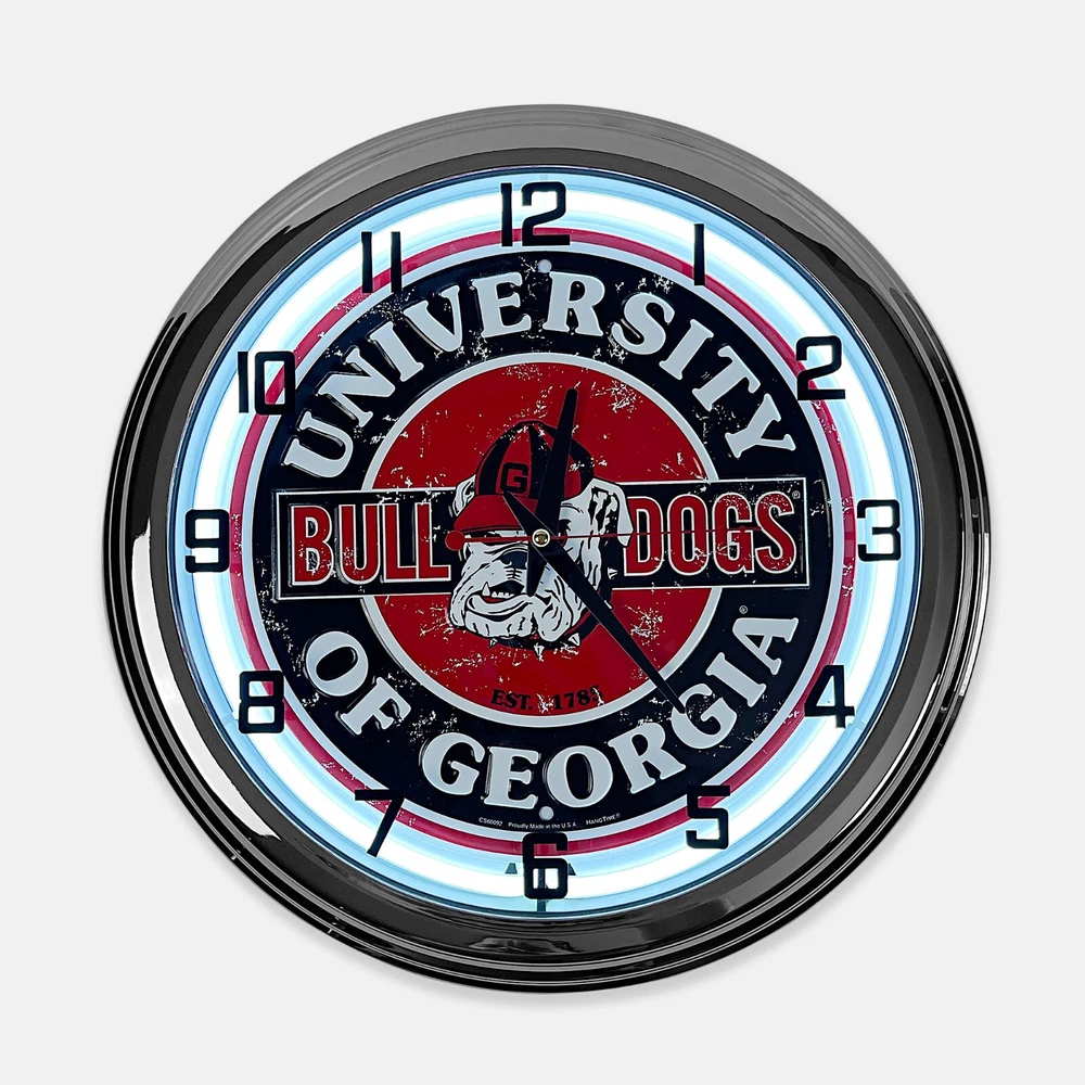 *Product is officially licensed. *Licensing information is printed on front or back of sign. *Image of licensed holographic logo or serialized QR code is in pictures. 18" University of Georgia Bulldogs Metal Sign Designed White Neon Clock - SIGNBOX-QLN720350 2.5" Inch Thick Triple Outer Bevel White Neon Handmade Ships from a Small Business in Ohio Materials: Metal, Steel Width: 17.25 inches Height: 17.25 inches Depth: 2.50 inches