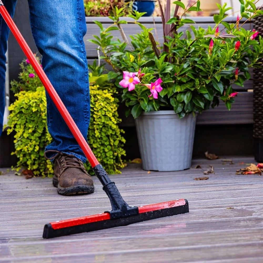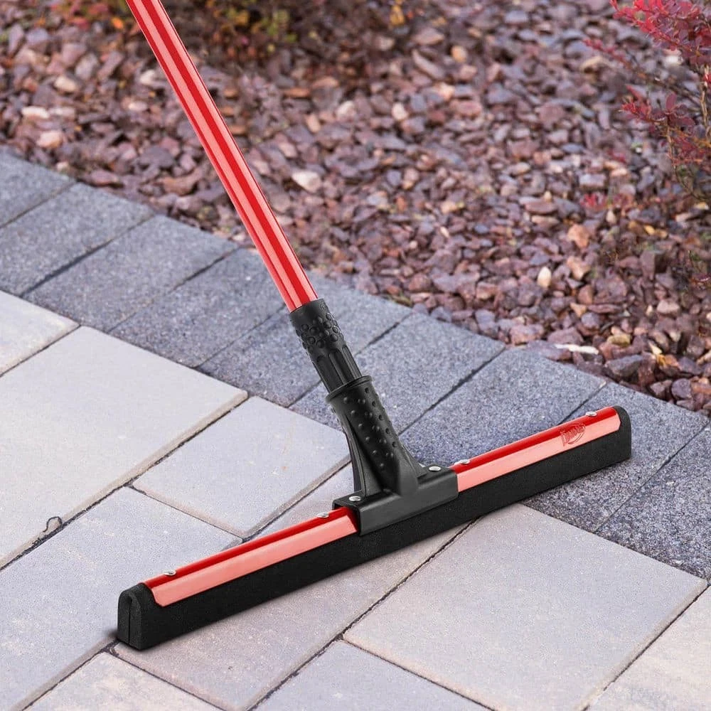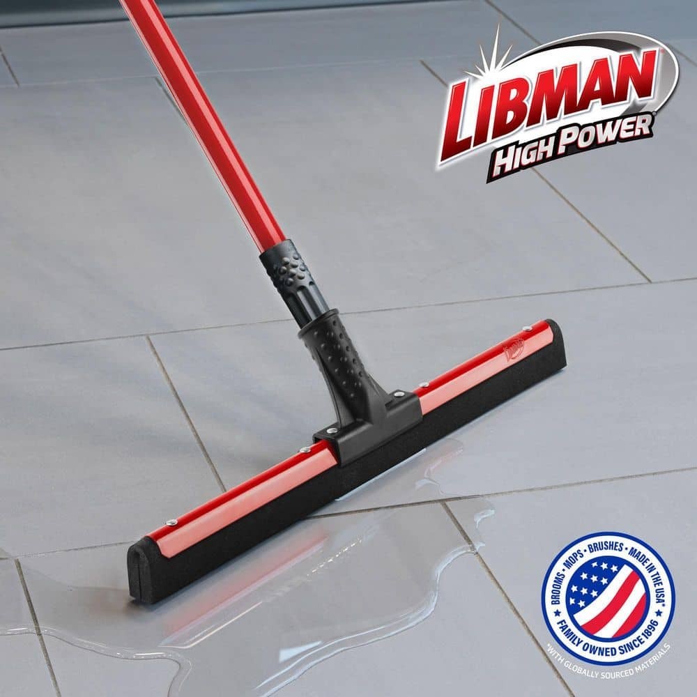 18 in. Flex Foam Blade Floor Squeegee with 52 Handle Steel Straight Durable New This dual flex blade floor squeegee from Libman works great on any surface, but is particularly effective on uneven surfaces such as tile. The flexible moss foam double blade does a great job of getting into the lines, cracks and textures of various floor surface types. The flexible rubber is mounted perfectly straight to remove water from uneven and rough surfaces. Ideal for removing water, chemicals, melting ice/snow and mud. 18 in. W black, closed-cell foam rubber blade Strong handle to head connection point 52 in. L steel handle, connected with standard thread Rivet set to hold squeegee onto the handle neck Great tool to have in your garage, on the jobsite or in foodservice and hospitality environments Handle grip with hanger hole for convenient storage Electrostatic coated handle paint will not chip even if handle gets dinged Style of floor squeegee blade will leave floors dryer faster than other blade types Steel squeegee blade frame is also painted red to prevent rust and corrosion
