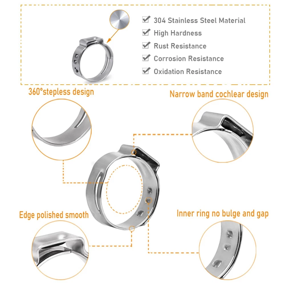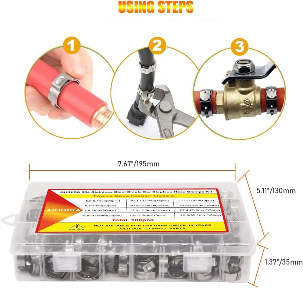 🍭【Plentiful Sizes Choices】---The 180pcs Pex Pinch Clamp Assortment Kit covers 12 different sizes of pex crimp rings, respectively are 6.5, 7, 8.7, 10.5, 12.8, 13.3, 15.3, 17.5, 21, 23.5, 25.6, 33.1mm. 💖【Ear clamps plier】---We provide a 9 inch ear clamp crimper pliers, made of Chrome Vanadium Steel, plastic coated handle is comfortable to grasp, which is widely applied to single ear hose clamps, double ear clamps, stepless clamps and so on, convenient for your installation. 🔧【High Quality】---The hose clamp is made of 304 stainless steel, which is anti-rust, anti-corrosion and anti-oxidation for long-term use. ✅ 【Special Structure Design】---There is no protrusion and gap in the inner of the pex cinch clamp, the narrow band cochlear design ensures continuous clamping during temperature changes or machine vibrations, providing a more concentrated sealing pressure. Edge polished smooth, avoid damage to the hose. 📦【Easy to Sort Out and 】---There are different small compartments in the storage box to classify different sizes, alleviating the trouble of finding a specific size. 🗺【Wide Applications】---The stepless single ear hose clamp is used in securing hoses, pipe, cable, tube, fuel lines etc. Perfect for automotive, industrial, boat/, shield, household etc. Both indoor and outdoor.