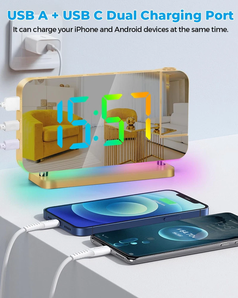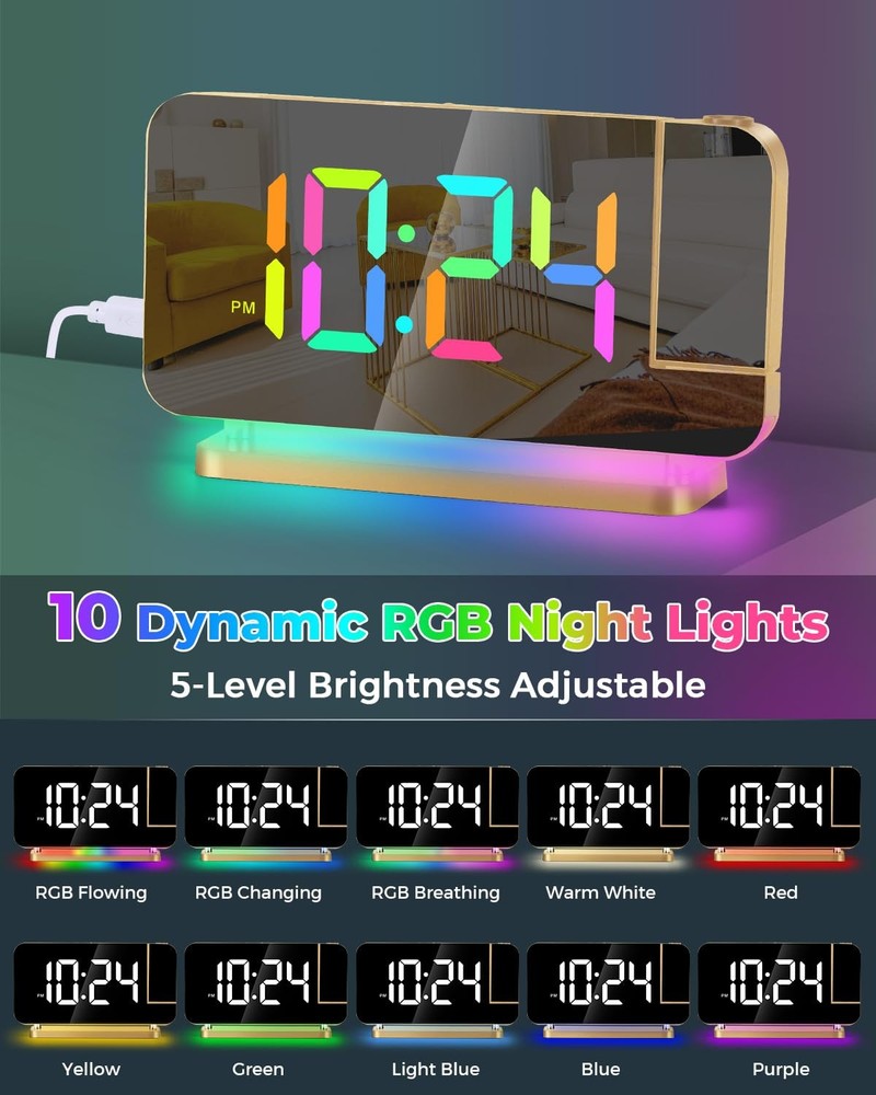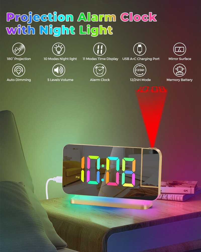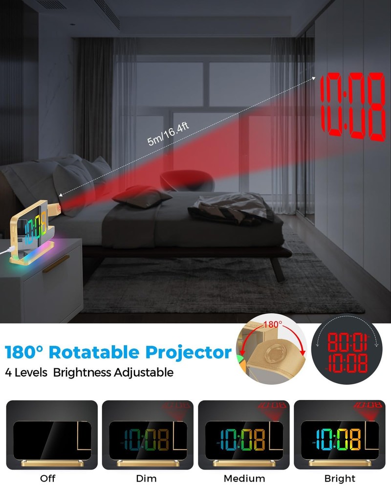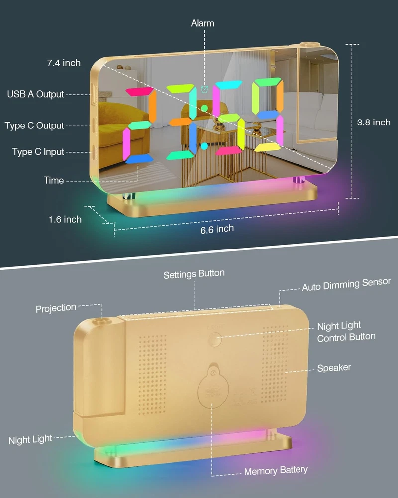 Product: projection Alarm Clock Brand: Colour: Gold Electronic alarm clock—Combines mirror, clock, alarm, night light,USB charging and other functions. It is not only a clock, but also a fashionable modern art decoration, very suitable for places such as bedroom, living room, office and so on. It is a necessity for your life and work, and the best gift for lovers, children, parents and friends. Feature: HD PROJECTION ALARM CLOCK — The projection alarm clock can be rotated 180, and the projection brightness can be adjusted in 4 levels. LED RGB COLORFUL CLOCK — The RGB alarm clock has 11 color display modes (4 dynamic modes + 7 fixed modes). Dynamic RGB Night Light — The Light alarm clock has 10 color night light modes (3 dynamic modes + 7 fixed modes). 7.4 INCH LED MIRROR DISPLAY — Not only an alarm clock, but also a makeup mirror. DUAL USB CHARGING PORTS — You can power your mobile phones, tablets, etc. at the same time, so you don't have to worry about charging nowhere. 6-LEVEL BRIGHTNESS SETTING — You can freely adjust the display brightness as needed, which saves energy and protects your eyes. 2 BRIGHTNESS CONTROL MODES — Built-in photosensitive element, can automatically adjust the screen display brightness according to the room light intensity. SHUTDO WN PROTECTION — Equipped with a button battery, you can save the time and alarm settings when the alarm is off. Custom mode selection: 12/24 HOUR SYSTEM — You can switch freely according to your own habits. SNOOZE MODE — After the first alarm, you will get 5 to 60 minutes of lazy bed time, and then remind you again. You will get: Projection Alarm clock x 1 Power adapter x 1 USB cable x 1 Button battery x 1 Instruction manual x 1 1 year warranty HD PROJECTION ALARM CLOCK -- The projector of the Alarm Clock can be rotated 180°, one-key flip time display, 4-level brightness is adjustable, 1.64-11.4 feet (0.5-3m) effective projection distance, can clearly project the time on the wall Or the best position on the ceiling for you to easily watch the time. 11-COLOR RGB DIGITAL DISPLAY -- The Digital Clock adopts a color-changing LED display, with 4 dynamic RGB colors + 7 fixed color modes, 6 level brightness adjustable + auto dimming,bringing you a different visual experience. 10-COLOR MODES NIGHT LIGHT --The Digital Alarm Clock has a built-in LED light, with 3 dynamic RGB colors + 7 fixed color modes, one key to switch the light color, 5 levels of brightness adjustable, and can also be used as an atmosphere light. USB-C CHARGING PORT -- The Digital Desk Clock is equipped with one USB Type C + one USB A output port, which can charge 2 electronic devices at the same time, meeting most of your charging needs. 7.4-INCH MIRROR DISPLAY — The LED Alarm Clock is equipped with a 7.4-inch HD display and large digital fonts, you can clearly watch the time within 30 feet; the unique acrylic mirror design can also be used as a makeup mirror. 5 LEVELS VOLUME ADJUSTABLE--The Loud Alarm Clock has a variety of volume options from 55-65-75-85-95db, you can choose the appropriate volume according to your sleep depth, which is very suitable for heavy sleepers. SNOOZE +12/24H MODE--The LED RGB Clock is designed with a snooze button on the top, which can be turned off at will, allowing you to easily get 5-60 minutes of lazy bed time; 12 and 24 hours are available in two time display modes. WHAT YOU GET -- 1 x Projection Alarm Clock + 1 x Power Adapter + 1 x USB C Charging Cable + 1 x Product Manual . (If you are not satisfied with any of our products, please contact us by email and we will provide a solution within 24 hours.)