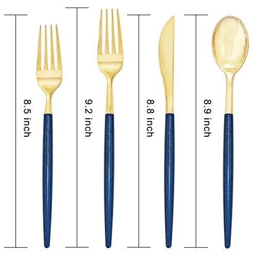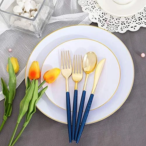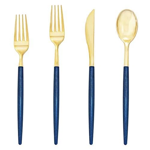 Return Policy Fast Delivery Trusted seller 180 Pieces Gold Plastic Cutlery,Gold Flatware with Blue Glitter Handle,Disposable Gold and Blue Cutlery,Suitable for Party,Birthday,Wedding Product Description Value Pack:the plastic flatware include 45 knives,45 dinner forks,45 dessert forks,45 spoons. It have polybag in the box. If you can't use all of the cutlery in one time, pls put back in the polybag which will help you to keep them clean. Unique:The gold cutlery is new color with new design,special experience,The unique handle design, blue glitter looks noble and charming, enhance your party level. Premium Quality: the gold plastic silverware is extra heavy and durable. No sasy to break or scratch.You can wash them after use. Do not microwave! Hand wash only! Or just throw them and it will save you a lot time. Healthy and Convenience:Gold plastic silverware are made of hard plastic, BPA free, non-toxic, food grade. Use these for party,birthday or wedding,and they'll be perfect for steak pasta and dessert! Added a very sophisticated look to the party! Serious Service:We’ve got your back with satisfaction . If you have any quality problems, please contact us by email, we will give you the reply as soon as possible. Shipping Returns Payment Shipping Shipping is FREE to all addresses other than APO/PO boxes in the lower 48 states. All our stock ships from US-based warehouses. Shipped via USPS or UPS (depending on location and package weight) Unless stated otherwise, all orders will ship within 24-72 hours of your payment being processed. Check our feedback to see the great reviews of FAST shipping we offer. Returns Seller does not accept returns Payment We currently accept payment via eBay managed payments only. Once payment is cleared, we will dispatch your shipment within 1-3 business days. Please refer to the "Shipping" tab for more information regarding shipping speed to your destination.