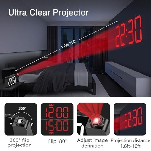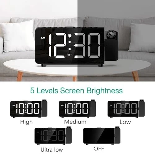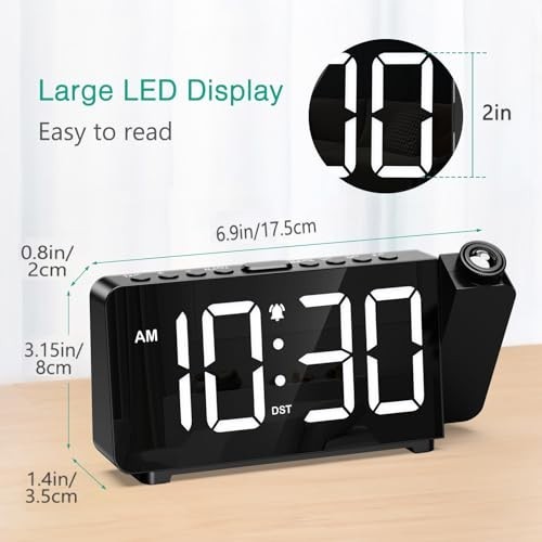 Projection Alarm Clock with Ultra-Clear Display Ultra-clear Projection: Easily adjust the focus by rotating, and project the time onto the ceiling or wall within a range of 1.6 feet to 16 feet. Choose from 3 brightness levels for the projected time, offering flexibility depending on your environment. 5-Level Screen Brightness & Night Mode: Featuring a large 7.4-inch LED screen, the brightness can be adjusted in 5 levels (high, medium, low, ultra-low, off) to match your lighting preferences. Activate night mode to automatically dim the display to the lowest setting between 7 PM and 7 AM, ensuring it doesn’t disturb your sleep. 3-Level Volume Control & Easy Snooze: This bedside alarm clock offers 3 volume settings so you can choose the right level based on your sleeping habits. The snooze function allows for an extra 9 minutes of sleep, with the alarm ringing for 2 minutes to ensure you don’t miss important events. Practical & Simple Design: Supports DST function and 12/24 hour format switching. The user-friendly design ensures each button corresponds to only one function, making it simple to operate—even for elderly users. Plug-in Operation: Comes with a 1.5-meter Type-C cable (adapter not included). This bedroom alarm clock must be plugged in to use. The included button battery is only used for memory backup, so you don't have to reset the time after an unexpected power outage.