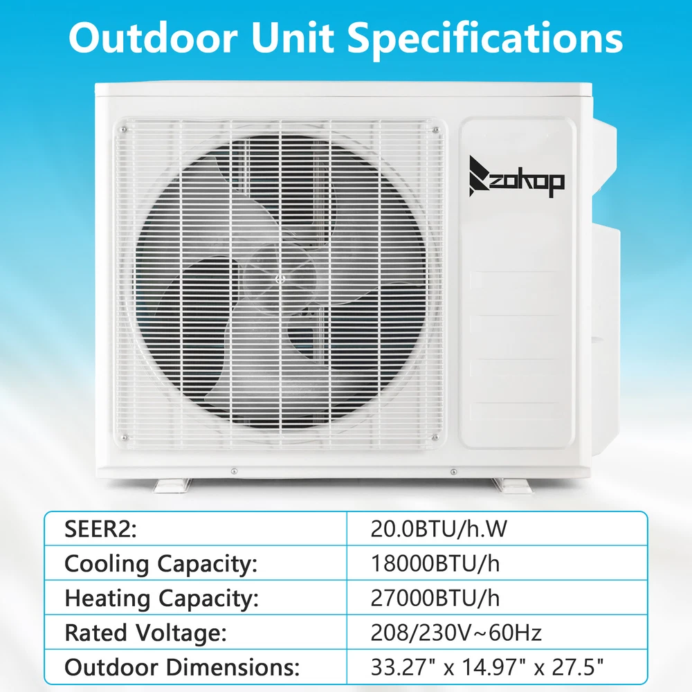 listing template Visit our store Sigh up for email 18000 BTU Ductless Split Air Conditioner W/ Heating 2 Zone 9000 + 9000 BTU WIFI ZOKOP Dual 2 Zone Ductless Mini Split Air Conditioner Heat Pump System, 19 SEER2 Ductless AC with 2 Indoor Air Handlers, 1 Outdoor Condenser, 25ft Installation Kit (9K+9K) Introductions: ZOKOP smart Split Type Type Inverter Air Conditioners with heating function are made with high quality compressor, high speed pure copper motor & inner spiral copper tube which are powerful to quickly cool down / warm your home, office, garage or apartment for maximum comfort in quiet operation, perfect appliance in hot Summer or cold Winter. Comparing with others, machine featured with high SEER grade, which means that it is more energy efficient and much money saving! This unit also has Sleep, Turbo, ECO, Mute and Timer functions. These functions help you enjoy the true individual comfort. Let the ZOKOP Mini Split Air Conditioner 2-Zone be the solution to your home's heating and cooling needs. Features: [MULTIPLE ROOMS] Comes with 2 indoor air handlers 9,000 BTU + 9,000 BTU with separate controller for individual rooms and 1 outdoor condenser. Enjoy individual temperature controls in each room for ideal climate control. This unit provides cooling and heating for up to 800 Sq.Ft (each indoor unit recommended area 400 Sq. Ft) and able to work in environments as low as 5 degrees Fahrenheit. 2 pcs 24.6ft copper pipes (Standard size 1/4" & 3/8" outer dimension) and 2 installation kits included. The length for drain pipe is 78.7". Featured with Cooling, Heating, Dehumidifying and Fan only modes in one compact unit. It is ideal for using in home's bedroom, living roo, kitchen, office, apartment, garage and so on. [Energy Saving] ZOKOP the speed of the air conditioner equipped with frequency converter directly affects the service efficiency of the air conditioner. The frequency converter is a control system used to control & adjust the speed of the compressor to make it always in the best speed state, so as to improve the energy efficiency ratio (at least 30% more energy-saving than the conventional air conditioner). This 19 SEER2, 2*9000BTU, 208/230V~60Hz, AHRI Certified AC unit with a heat pump(up to 5℉/-15℃) is featured high quality compressor for more efficient cooling and longer working life; Higher SEER grade & Eco-friendly design which leads you for money saving ( please confirm voltage before making purchase) . [Quiet Cooler & Heater] Ultra Silent at only 27-42 dB(A) and beautifully built adds a touch of elegant charm to your room.In sleeping & mute mode, It's able to maintain the temperature while you are sleeping. And you can use the 24-hour timer in combination to free you from additional worries. Featured with 4-way swing function, unit provides scientific airflow in your room to suit your comforts in just a few minutes.Best choice to decorate your home. [Smart Operation] Operating this conditioner is an easy-understanding and enjoyable cooling experience (61-88degree Fahrenheit ). We can set all functions on remote control (Fan Speed Selection, Sleep Mode, 24 Hour Timer, ECO Mode, Turbo Mode, and Mute Mode). Built-in microprocessor chip & sensor in the remote controller makes it more convenient to operate the air conditioner from a distance. Digital LED display controls offer precise temperature adjustments and the remote control lets you control the air conditioner from across the room. [Washable Air Filter] This indoor AC machine comes with a permanently washable and easy cleaning air filter. Keep your air conditioner running more efficiently by cleaning the filter once a month. Specifications : 2*I ndoo r Unit : 1. Color: White 2. Power Supply: 208/230V, 60Hz 3. Cooling : Rated Capacity: 9000Btu/h Rated SEER2: 19Btu/W.h Rated EER2: 10Btu/W.h 4. Heating: Rated Capacity: 10000Btu/h HSPF2 Rating (Region IV): 8.5Btu/W.h 5. Operation temperature: (16~31)degree Celsius/(61~88)degree Fahrenheit 6. Use the air conditioner in the following temperature conditions. Indoor(cooling/heating): 17 ~32degree Celsius(63 ~90degree Fahrenheit)/0 ~27degree Celsius(32 ~80degree Fahrenheit) Outdoor(cooling/heating): 15 ~55degree Celsius(59 ~131degree Fahrenheit)/-15 ~24degree Celsius(5 ~75 degree Fahrenheit) 7. Moisture removal: 1.1L/h 8. Indoor air circulation/Hi : 600m³/h 9. Indoor noise level at cooling(Turbo/High/Med./Low/Mute): 42/39/34/29/27dB(A) 10. Application Area: Up to 400 sq.ft 11. Certificate : AHRI, ETL 12. Indoor Dimensions: 81.1x29.2x20.5cm(31.9x11.5x8.1inch) 13. Indoor Package dimensions: 88.5x36.6x27.8cm(34.8x14.4x10.9inch) 14. Indoor Net weight: 9.5kg/20.9Ibs 15. Indoor Gross weight: 12.7kg/28Ibs 1* Outdoor Unit : 1. Cooling Capacity: 18000BTU/h 2. Heating Capacity: 20000BTU/h 3. SEER2: 20.0BTU/h.W 4. Rated Voltage: 208/230V~ 5. Rated Frequency: 60Hz 6. Refrigerant type: R410A/1850g/65.3ozs 7. Outdoor Dimensions: 84.5×38×69.9cm(33.27x14.97x27.5inch) 8. Outdoor Package dimensions: 96×43×75cm(37.79x16.92x29.53inch) 9. Outdoor Net weight: 44kg/97lbs 10. Outdoor Gross weight: 47.5kg/104.7lbs 2*Copper pipes : 1. Connecting Pipe: Gas 3/8''-24.6FT/7.5M Liquid 1/4''-24.6FT/7.5M 2. Signal Cable Length: 24.6FT/7.5M 3. Drain Hose:6.6FT/2M Package Includes : 2* Indoor box includes : 1 x Indoor Unit 1 x Remote Control 1 x Screw Pack 1* Outdoor box includes: 1 x Outdoor Unit 4 x outdoor feet rubber 2*Copper pipes box includes: 1 x Copper pipes set(24.6FT) 1 x Signal Cable(24.6FT/7.5M) 1 x Drain pipe(6.6FT) 1 x Drain pipe adapter 2 x Sealant 2 x Wall sleeve cover 2 x Pipe tape 1 x Insulation pipe 1 x Wall sleeve You might like this more>> 6-Tier Bamboo Bookshelf Adjustable Storage Shelf Rack $49.99 Professional Cello 4/4 Full Size BassWood Set with Bag $148.99 Stainless Steel 4 Tier Steamer Cooker Steam Pot Kitchen Food $39.29 110 LB x 0.1oz All-In-One Digital Postal Shipping Scale 50kg $22.79 2Pack 10000LM LED Zoomable Flashlight Torch Lamp Light $9.99 Mini Exercise Bike Des