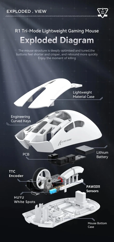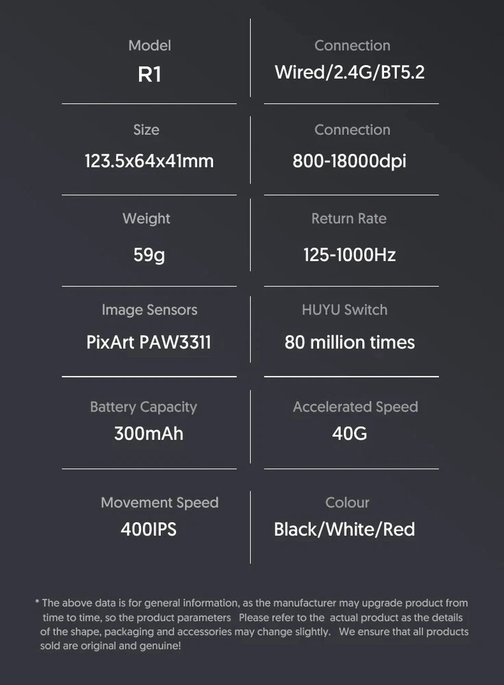 R1 18000dpi Wireless Mouse, 1000Hz, Tri-mode Connection, PAW3311,Macro Gaming Mouse Product Description: 1. Product model: R1 2. Product interface type: USB Type C 3. Product connection method: USB, 2.4G. Bluetooth 4. Transmission frequency: 2402MHz-2480MHz 5. Product optical sensor: Original phase PAW3311 6. Frame rate (IPS): 400IPS 7. Maximum acceleration (G): 40G 8. DPI : 800 -18000 9. Product weight: 59g ± 3g (Excluding weight of receiver) 10. Product size: 123.5 * 64 * 41mm